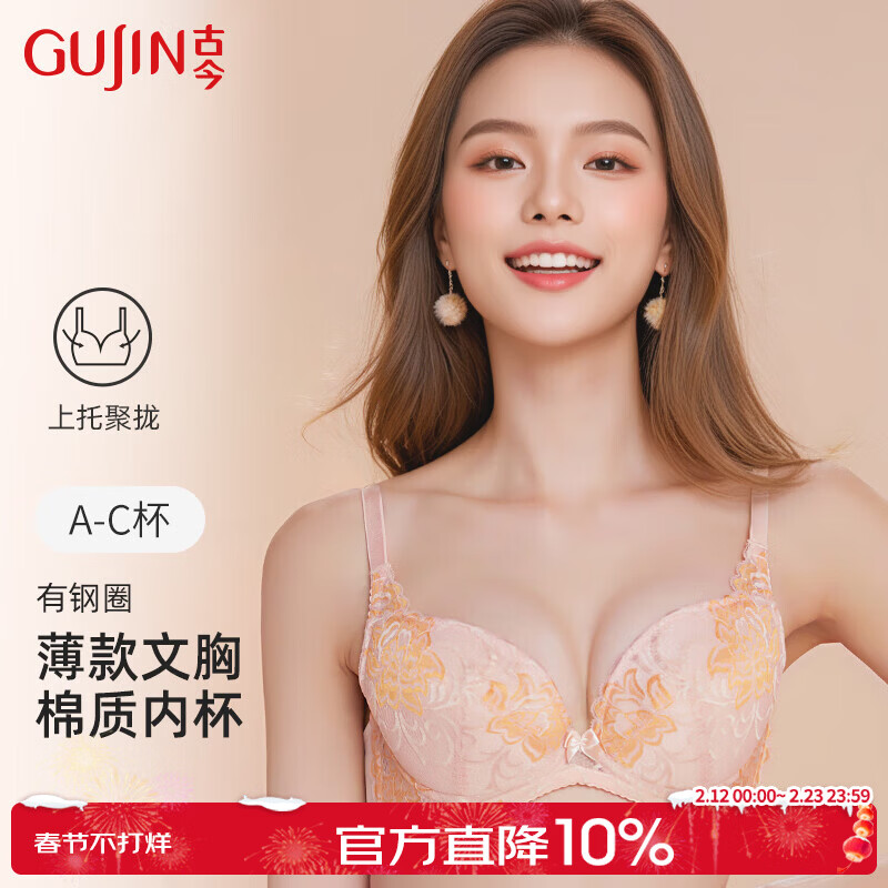 古今(GUJIN)女士内衣薄款文胸少女小胸刺绣插片性感蕾丝侧收聚拢 杏粉 80B