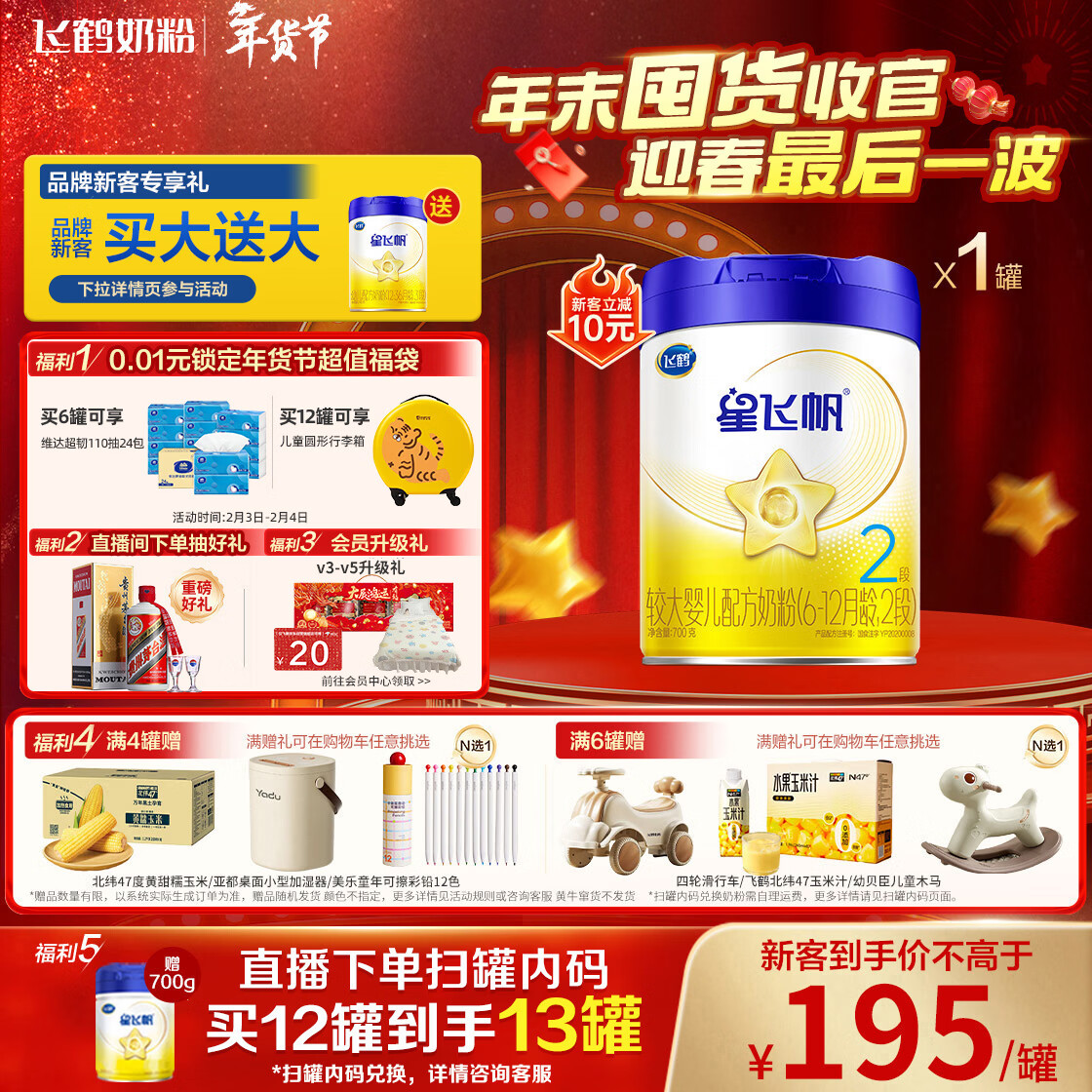 飞鹤星飞帆 婴幼儿配方奶粉2段(6-12月龄) 700g 专利OPO 育儿补贴