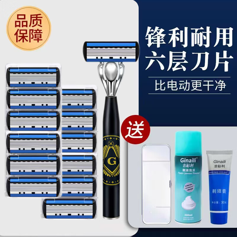 吉耏利德国进口手动剃须刀片适配吉利刀架六层刀片新款刀架男士刮胡剃胡刀 大G刀柄+12刀头送收纳盒+剃须膏