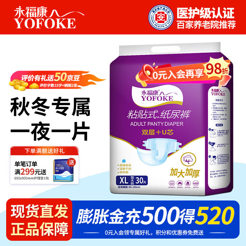 永福康成人纸尿裤粘贴式老年人尿不湿孕产妇护理高端夜用加厚防漏 【夜用加厚】XL码30片