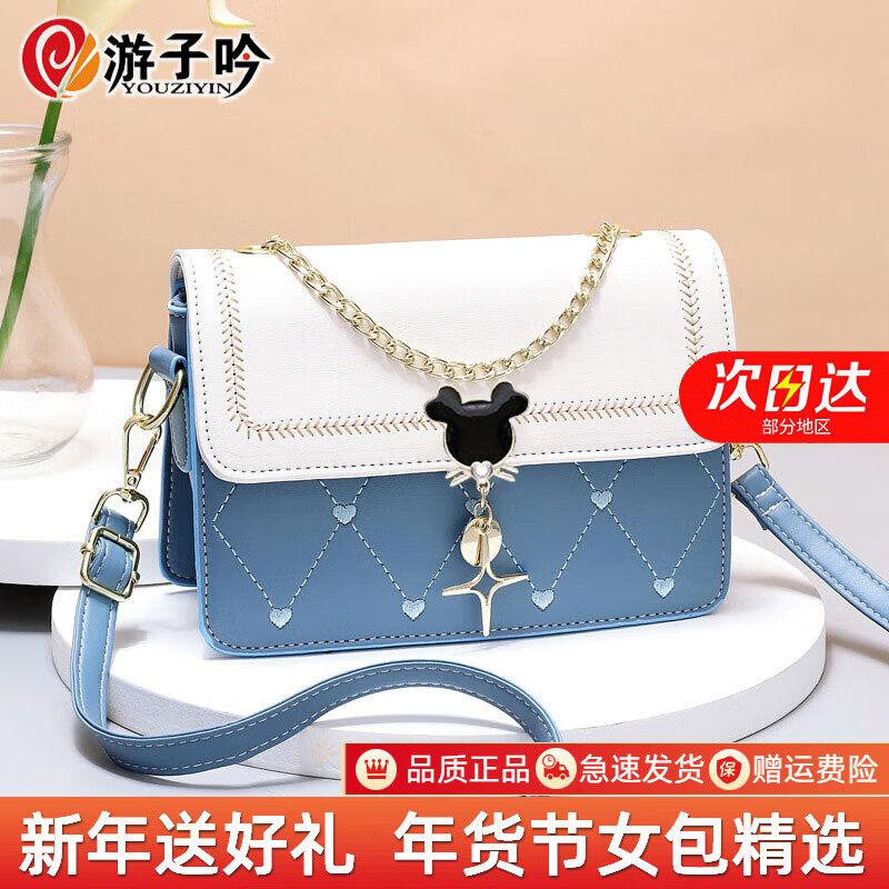 游子吟生日礼物送女友老婆包包女包2026新款小包包洋气单肩斜挎女包 蓝拼白-代写贺卡 轻奢品质女包