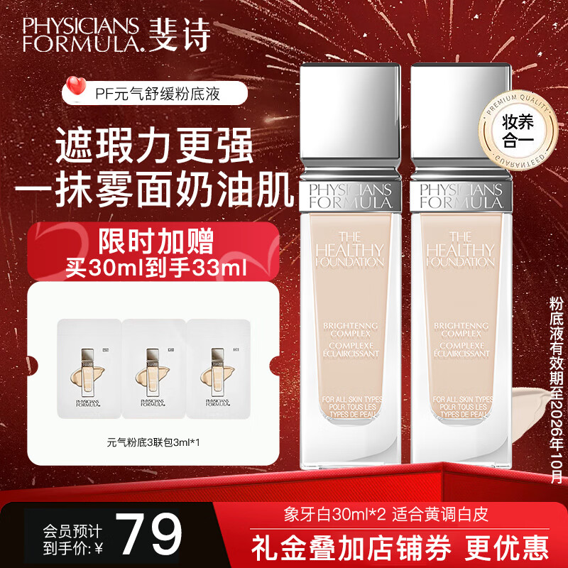 PHYSICIANS FORMULA斐诗元气舒焕粉底液30ml两瓶装油皮遮瑕持久不易脱妆奶油肌粉底液 FN4-象牙白 黄调白皮