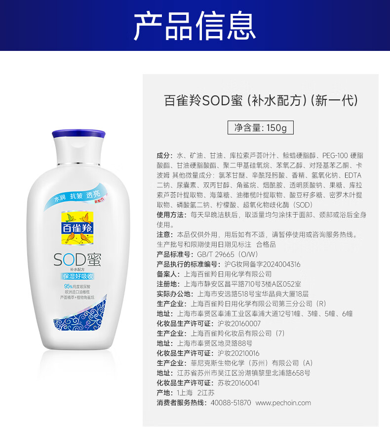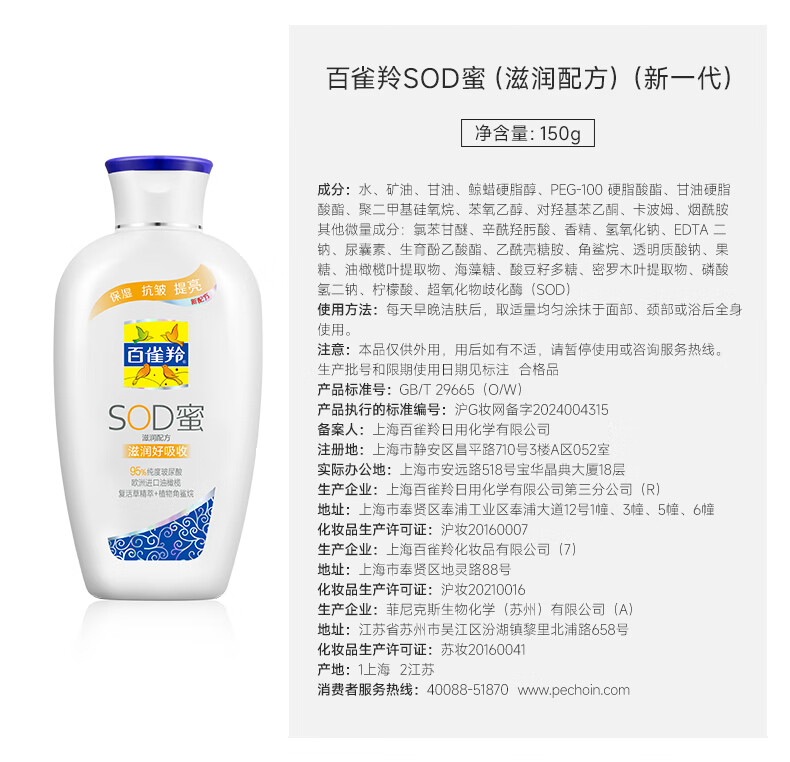 百雀羚(PECHOIN)经典SOD蜜150G滋润保湿品质国货新年礼物