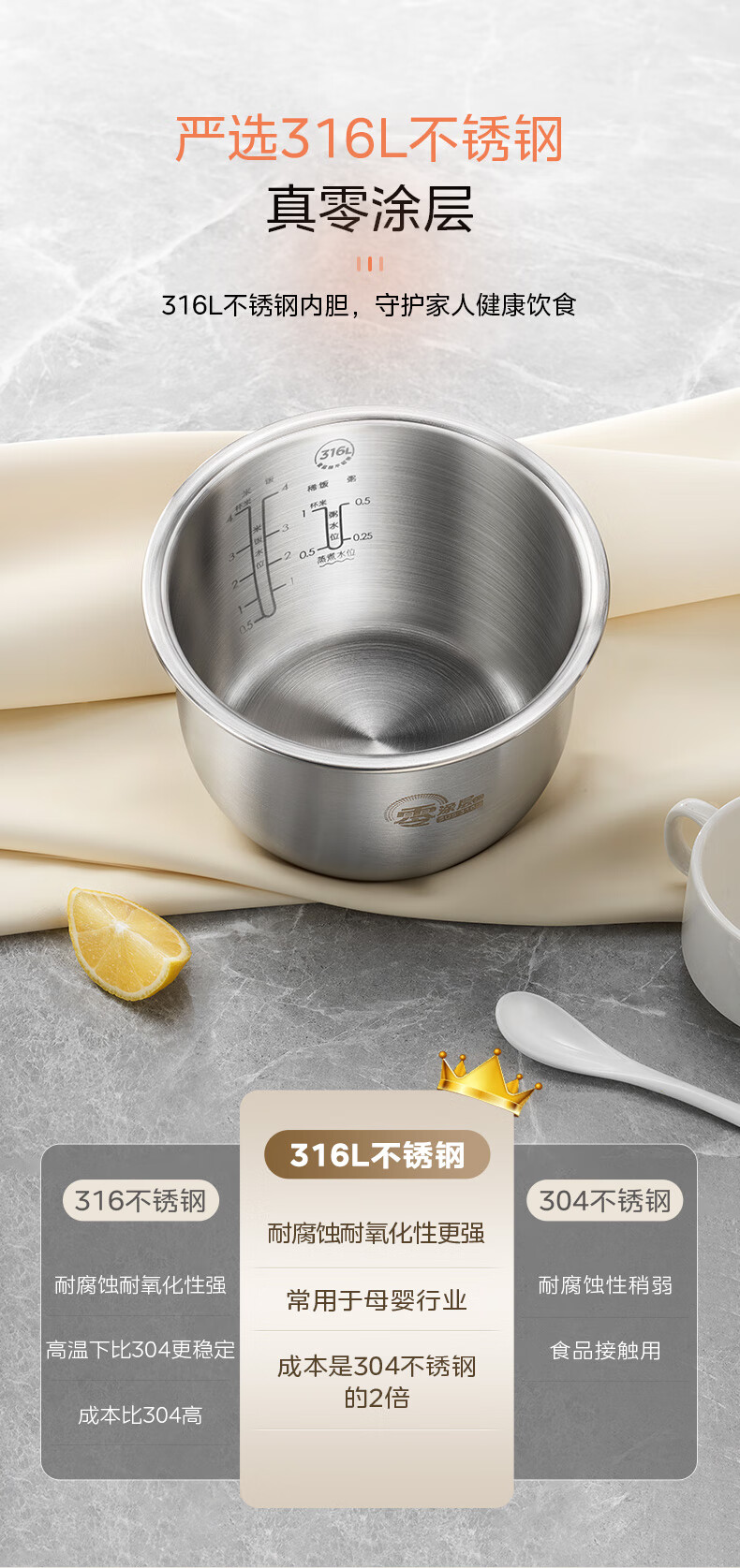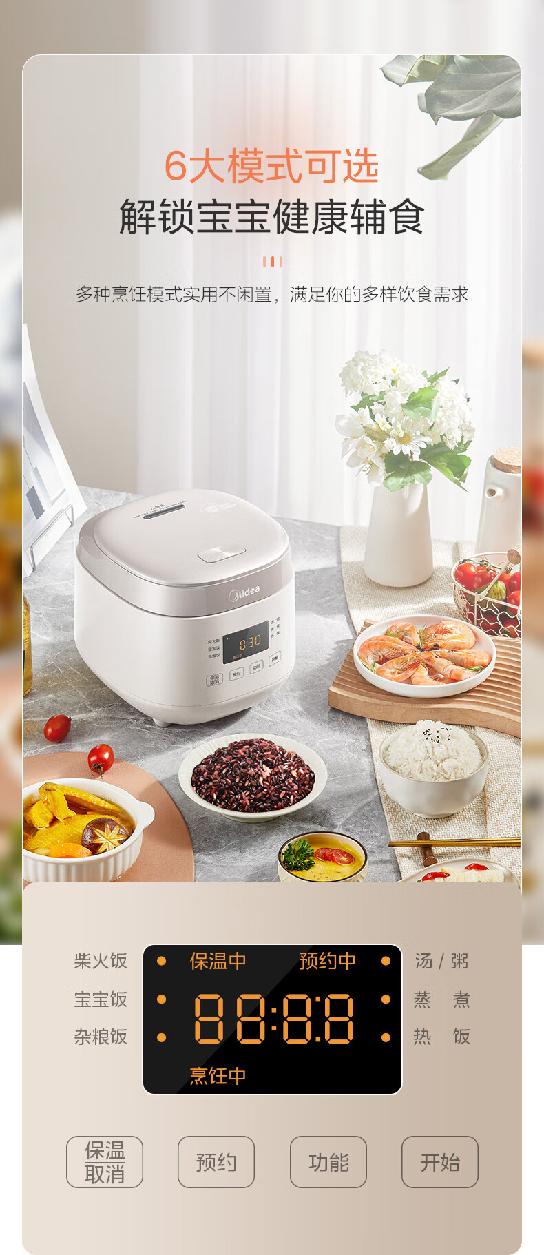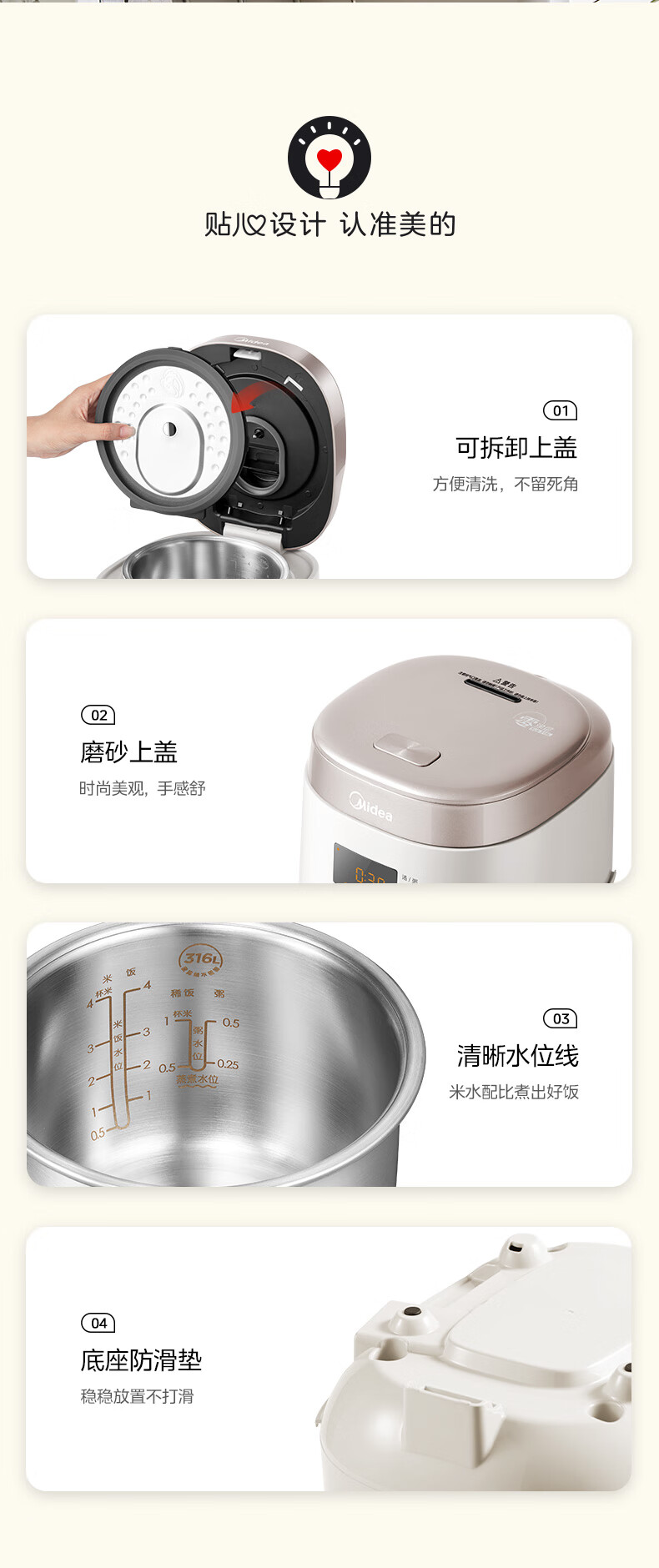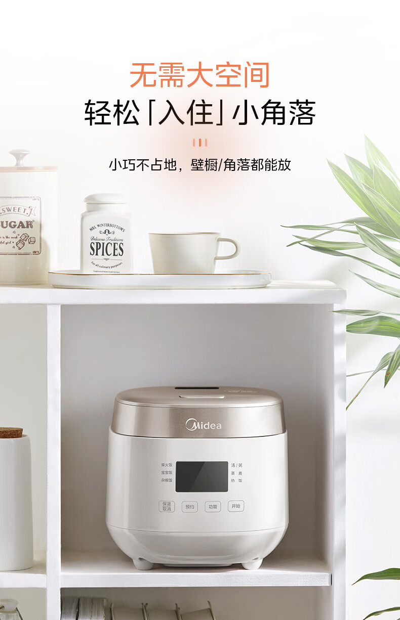 美的电饭煲1-2-3人 家用0涂层316L不锈钢内胆电饭锅小型 迷你智能多功能定时煮小米粥锅微压 母婴级【上盖可拆洗】白 2L