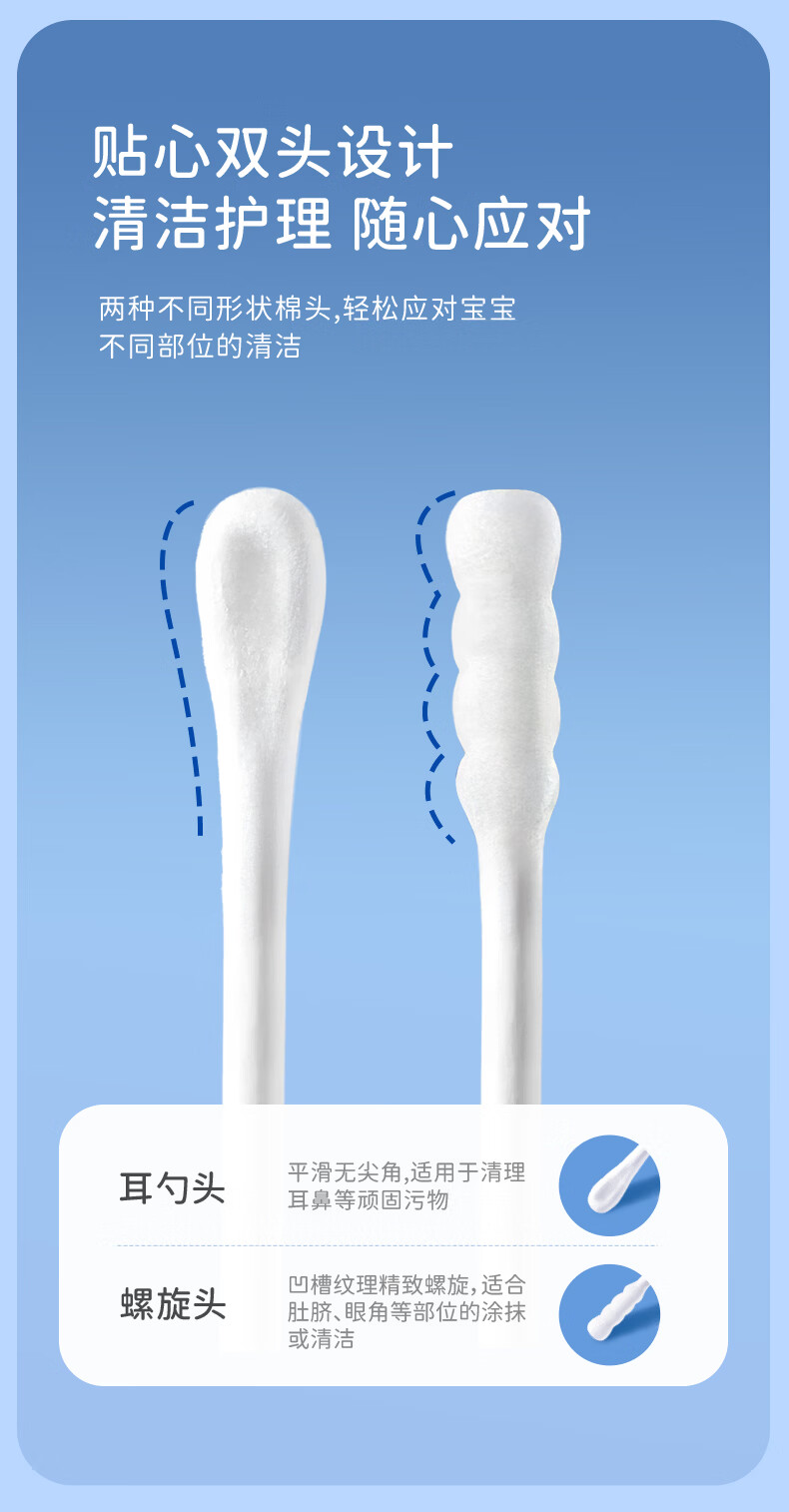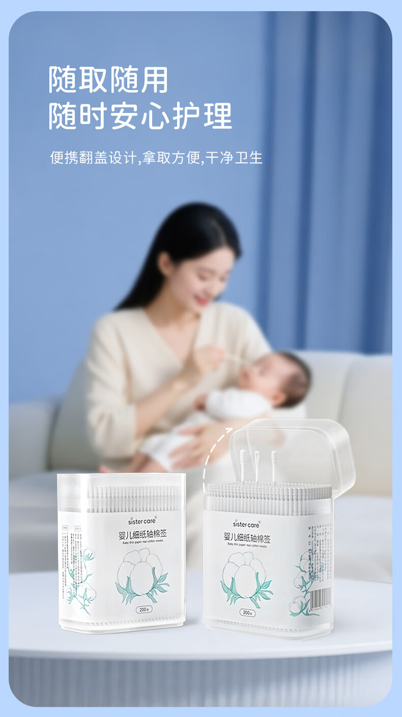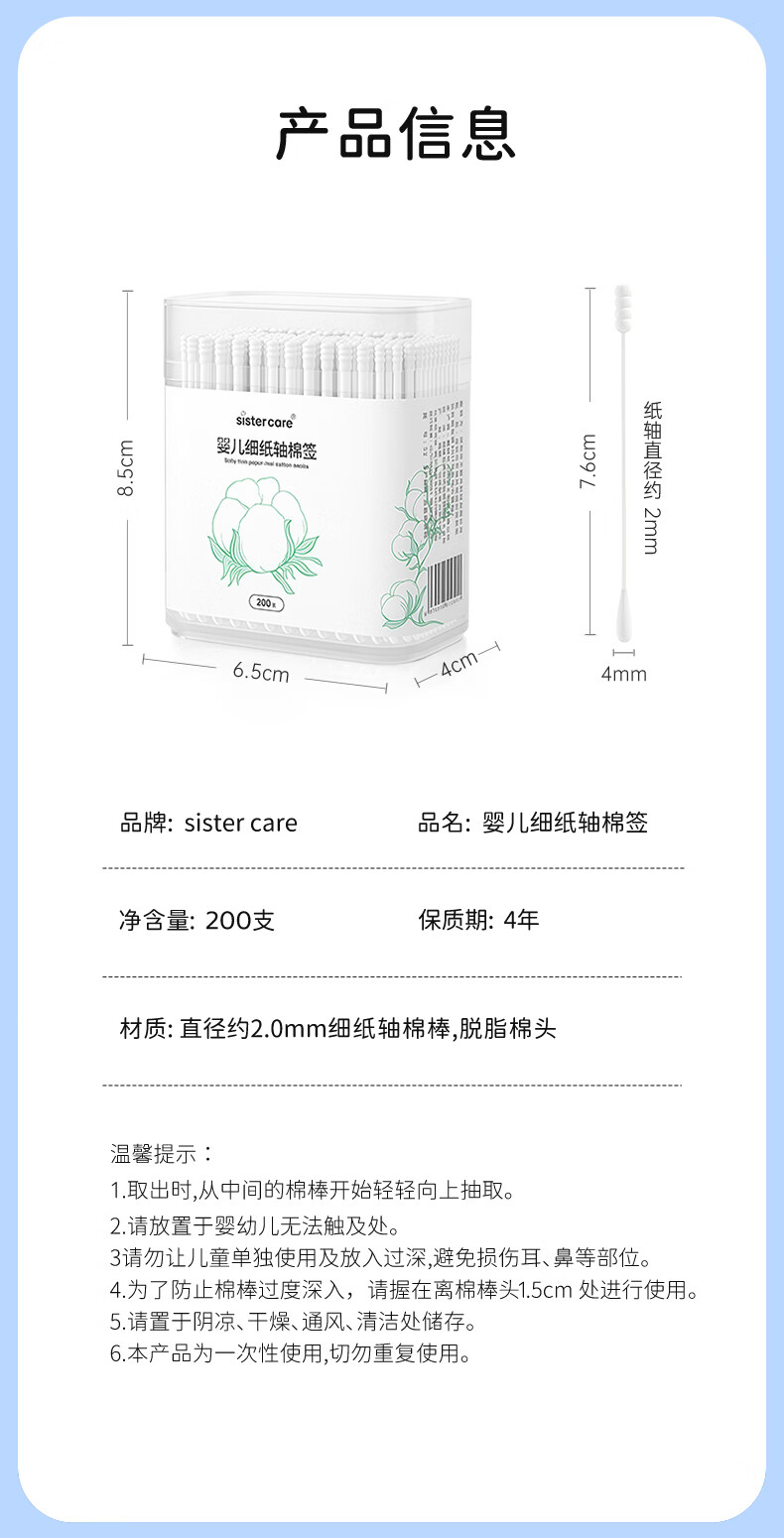 sister care婴儿棉签棉棒宝宝掏耳朵鼻屎肚脐挖耳勺螺旋头新生儿童细轴200支