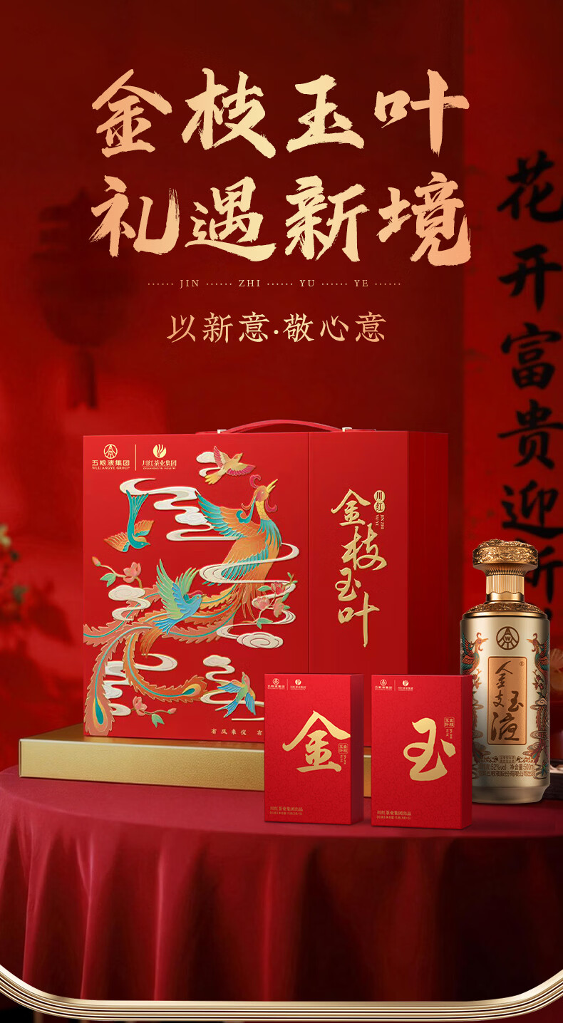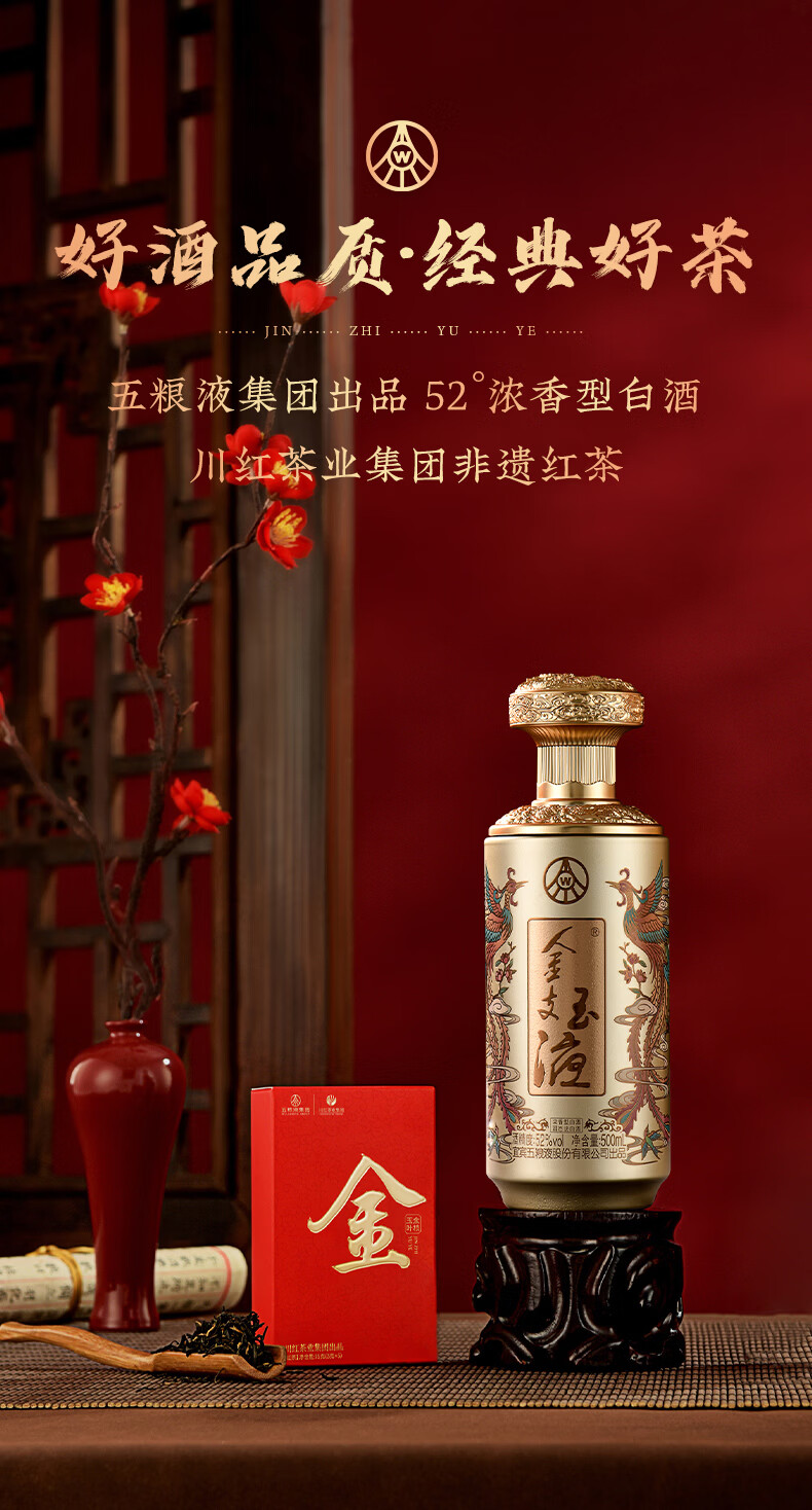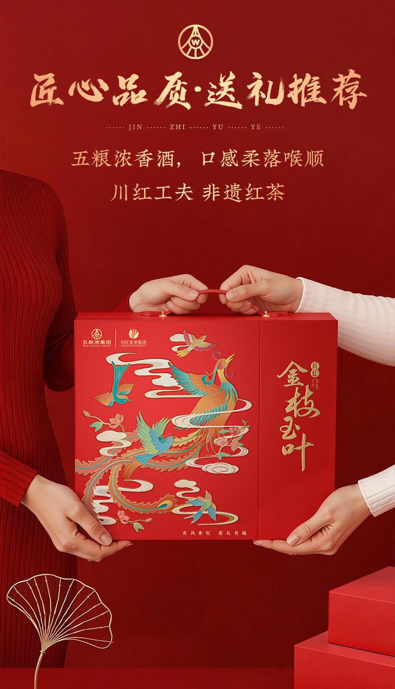五粮浓香百鸟朝凤 金支玉液金装版礼盒 五粮液股份川红联名款 浓香型白酒 52度 500mL 1瓶 +五粮液川红集团红茶60g