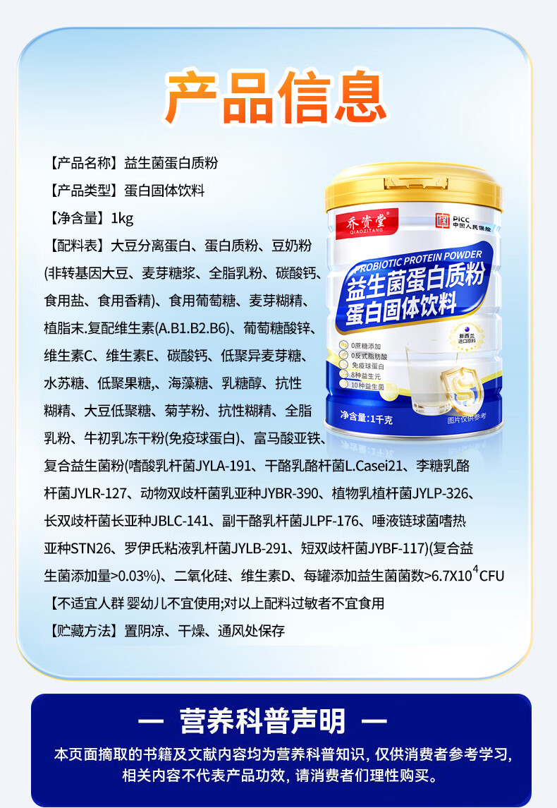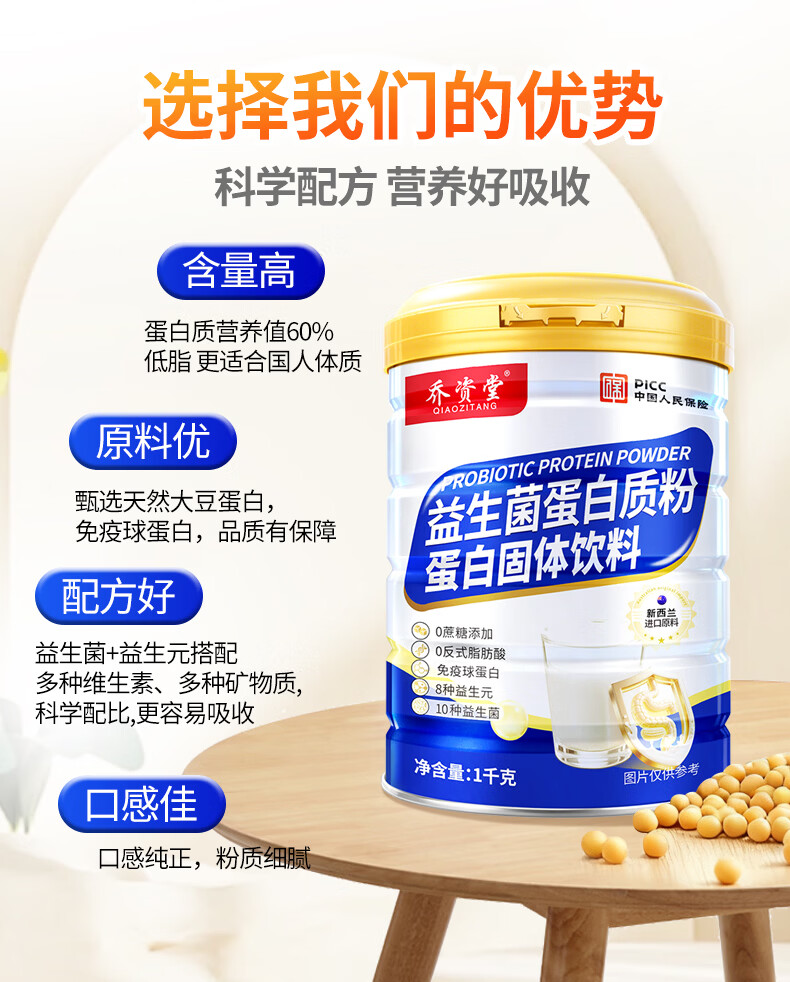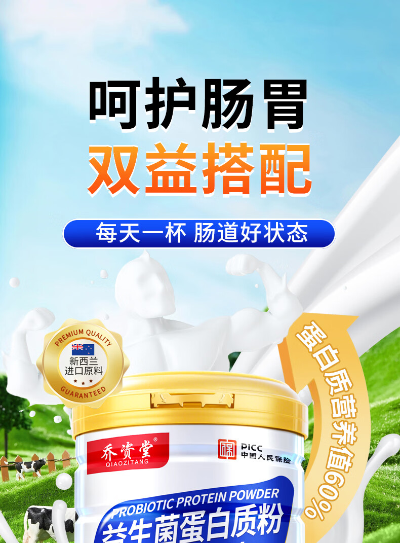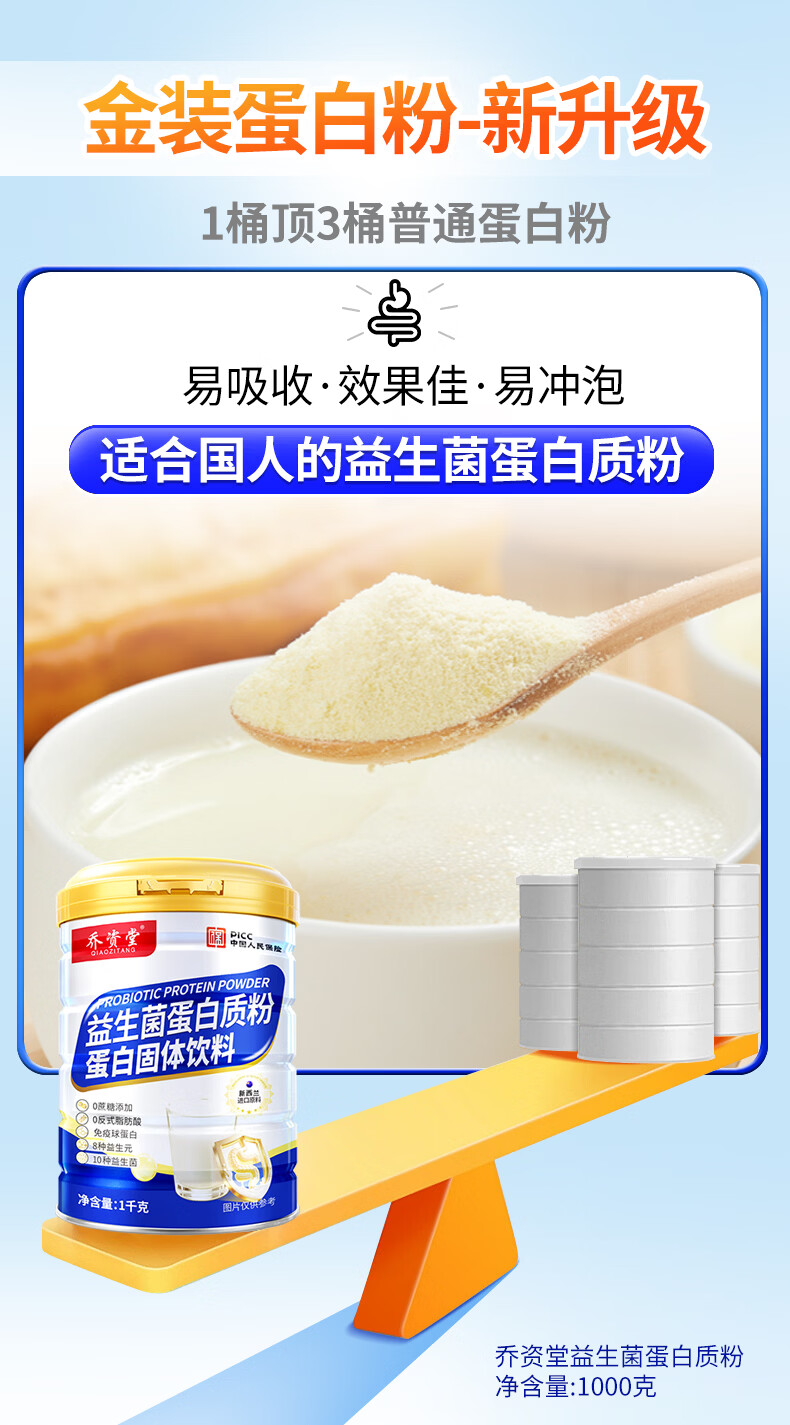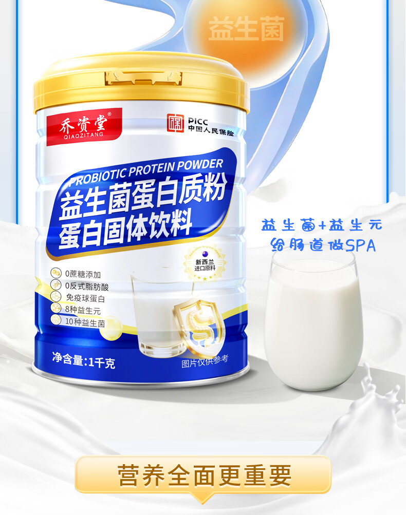 乔资堂1000克益生菌蛋白质粉0蔗糖补充蛋白质益生元牛初乳维生素营养品 1000g*2罐 【礼袋装】