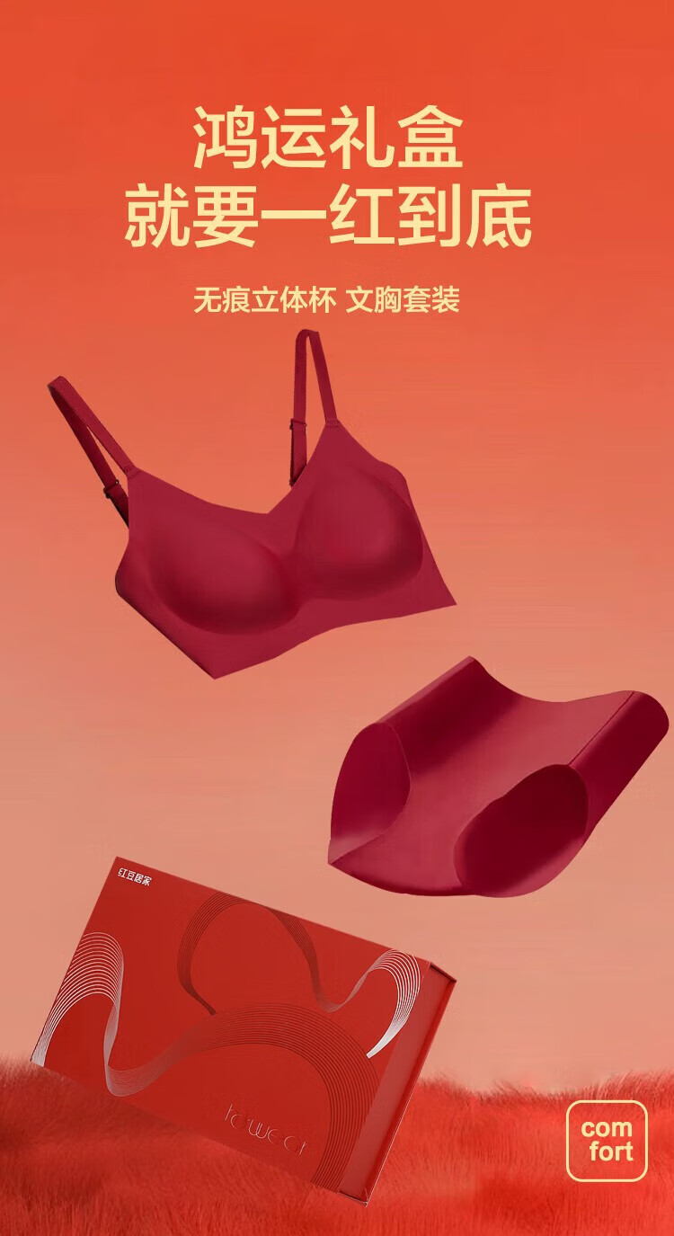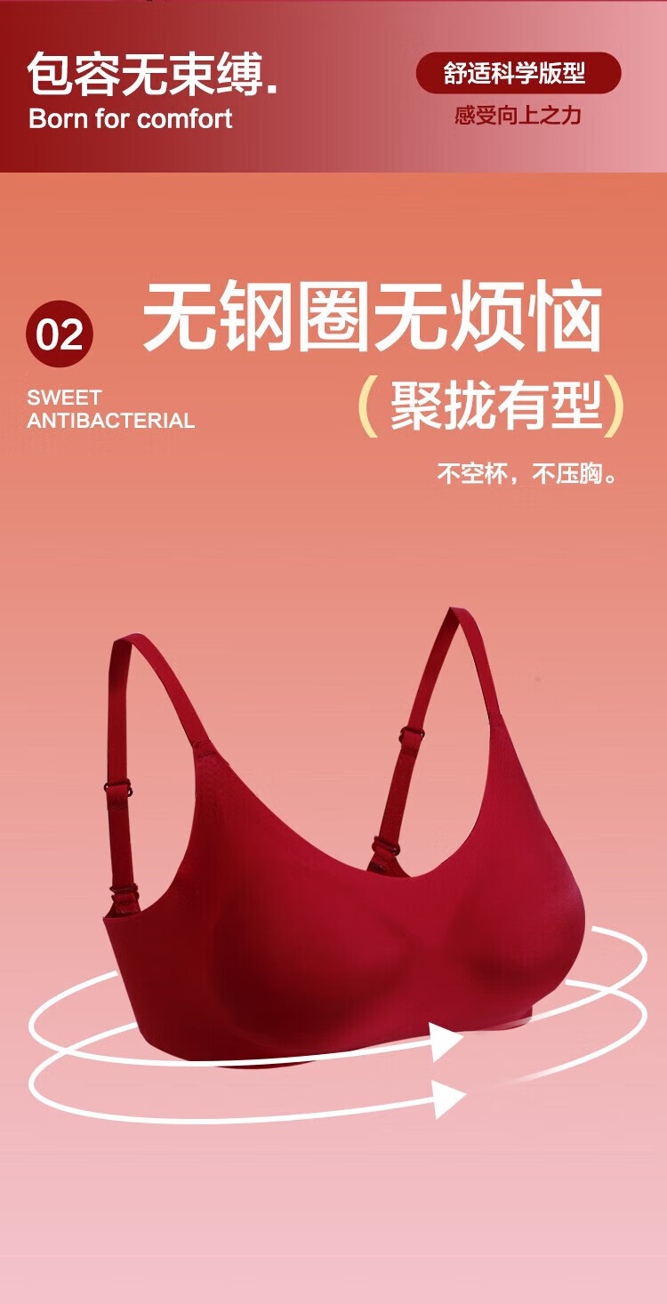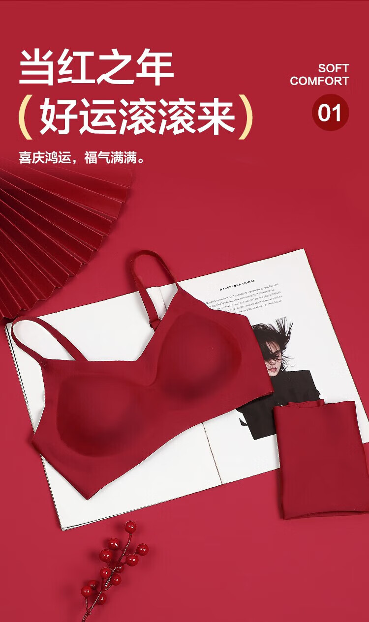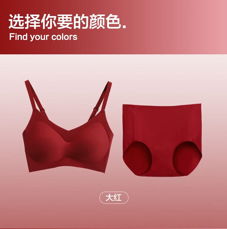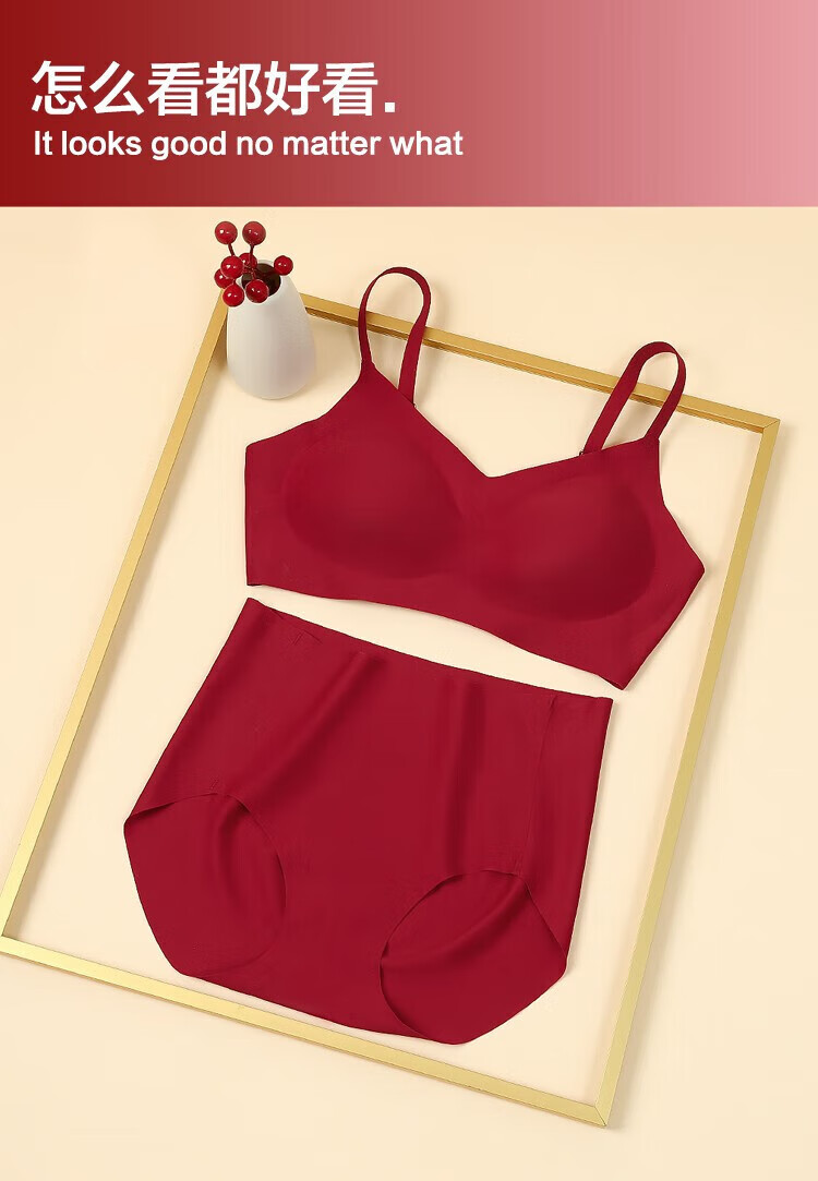 红豆居家大红色女士无痕内衣本命年无钢圈结婚礼物新娘内裤文胸套装 红色 均码 75B
