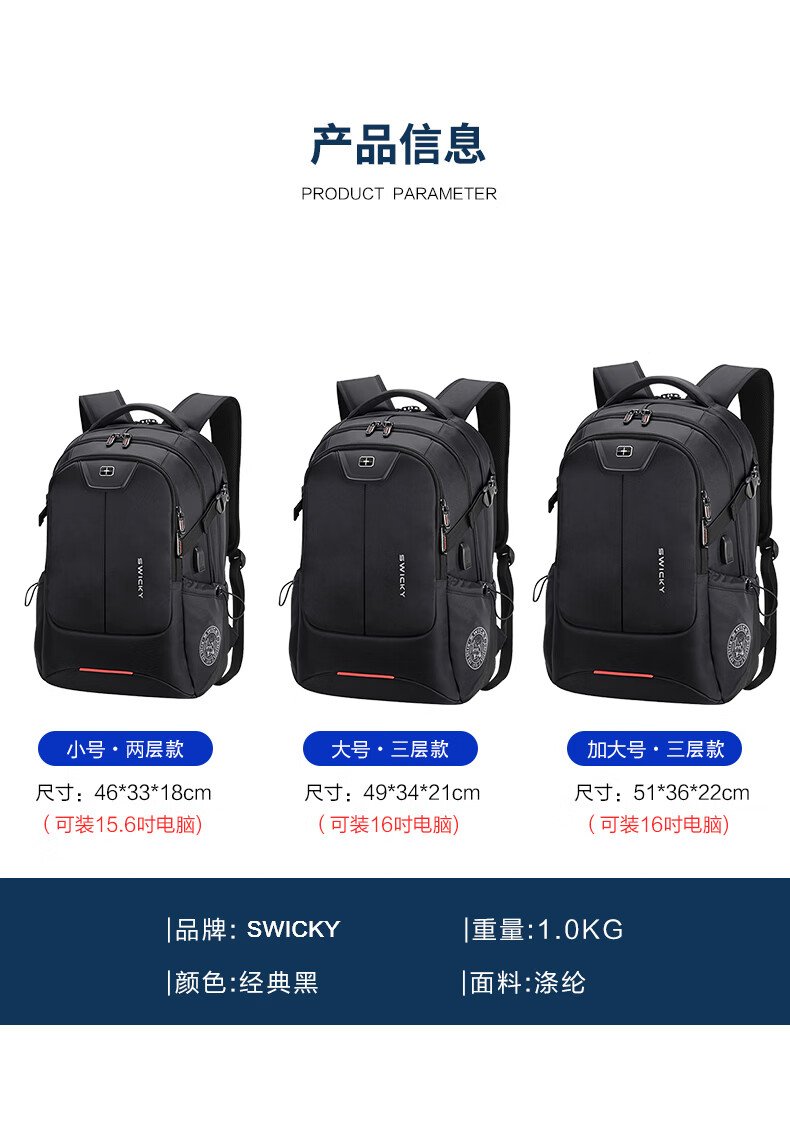 SWICKY瑞士商务电脑双肩包男士大容量笔记本电脑包通勤出差背包学生书包 升级版加大【户外5-7天出行】 标准