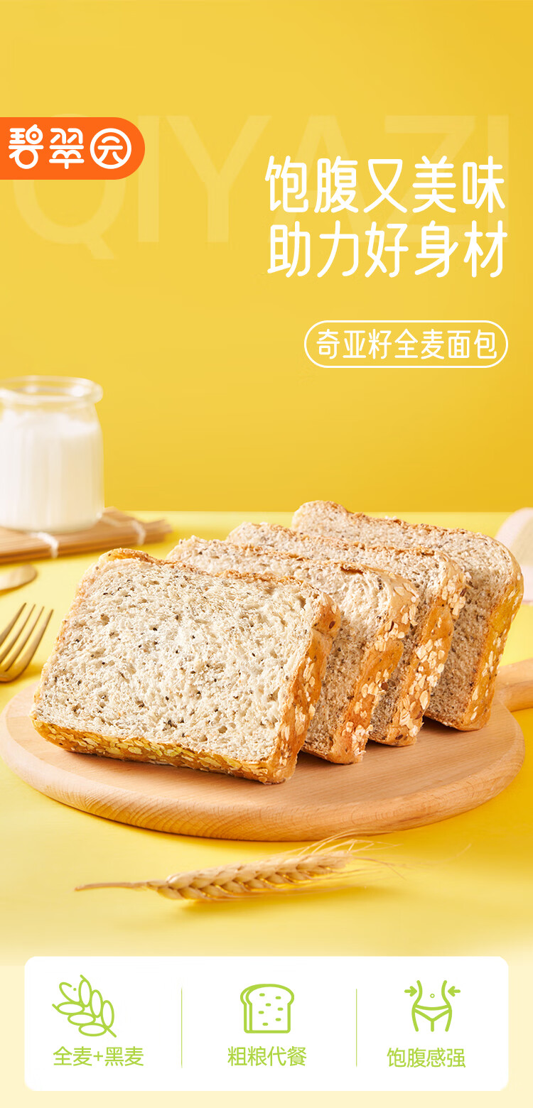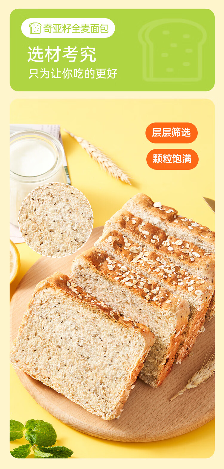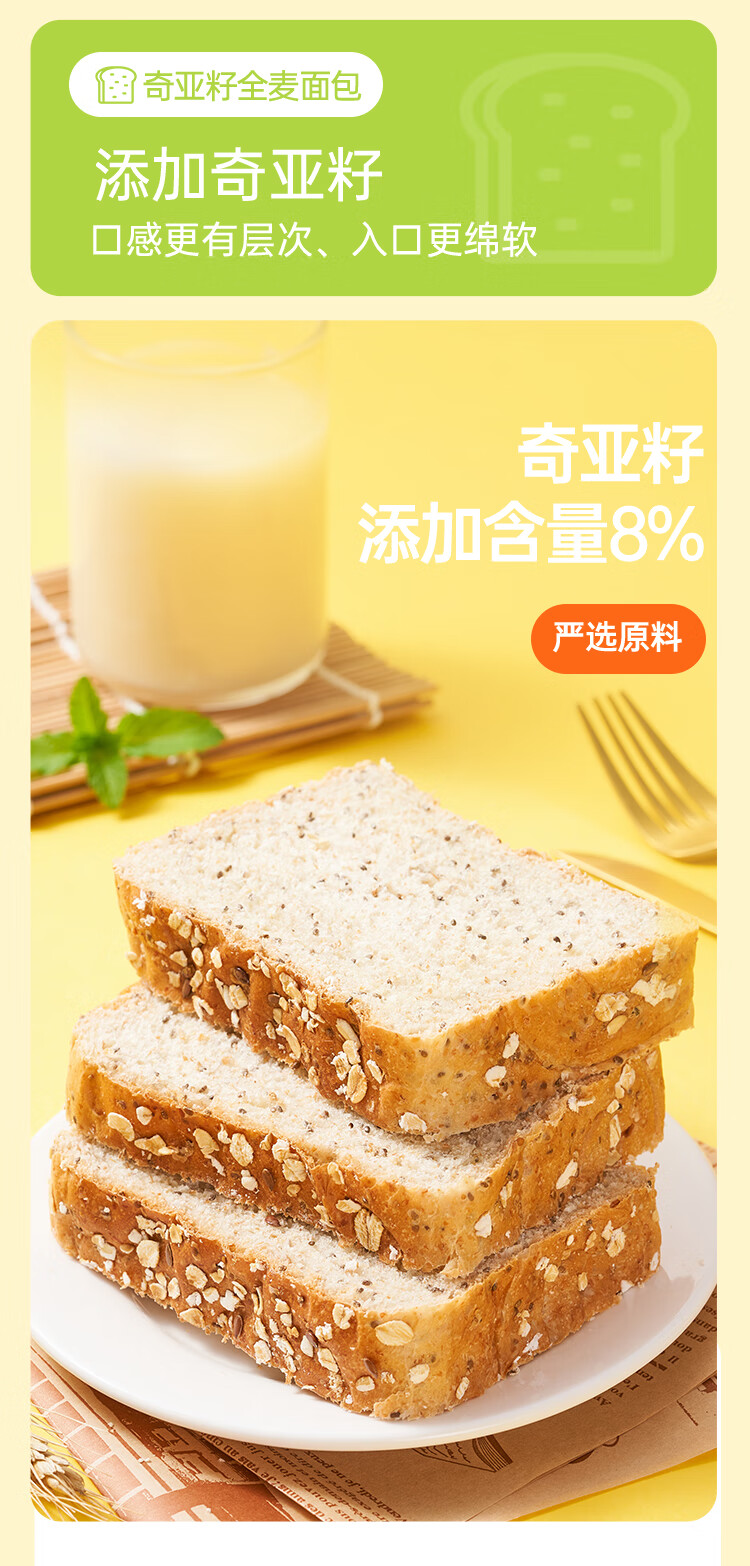 碧翠园奇亚籽低脂全麦面包1000g无蔗糖粗粮健身手撕面包早餐休闲零食
