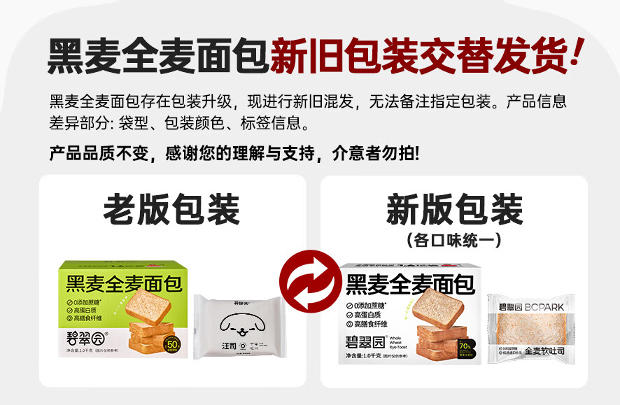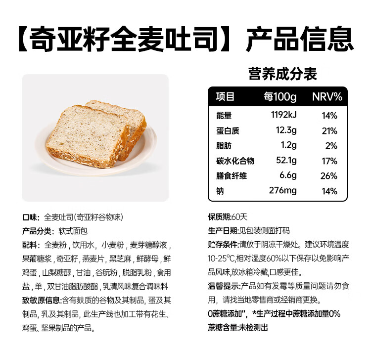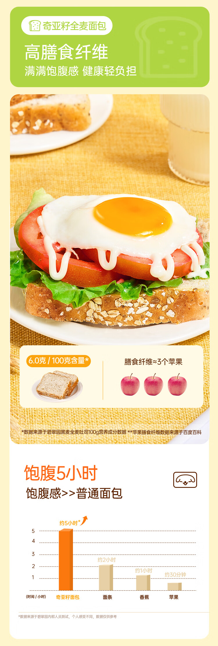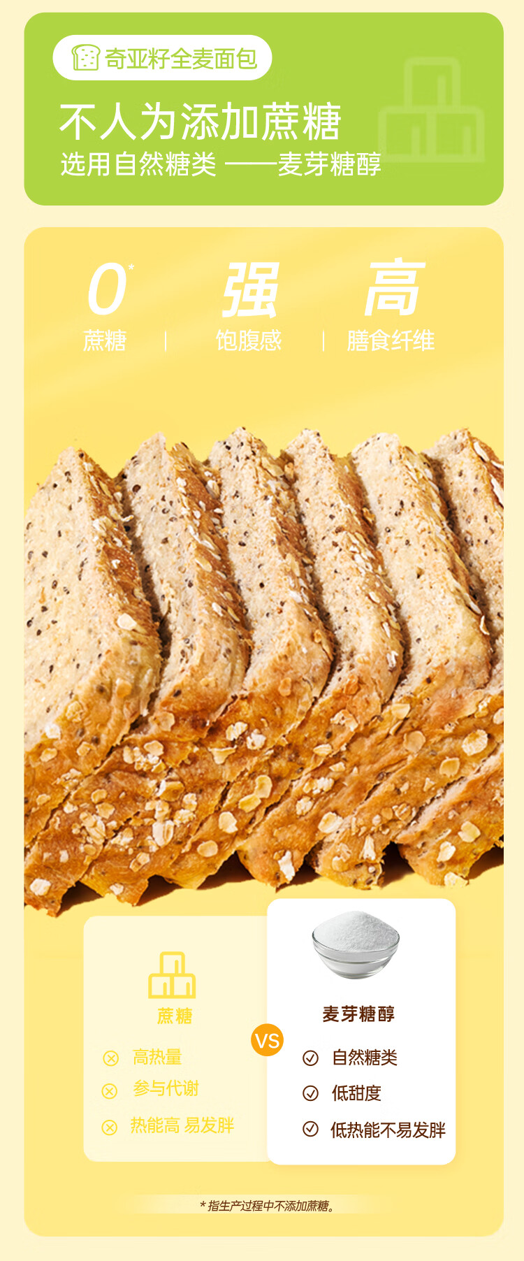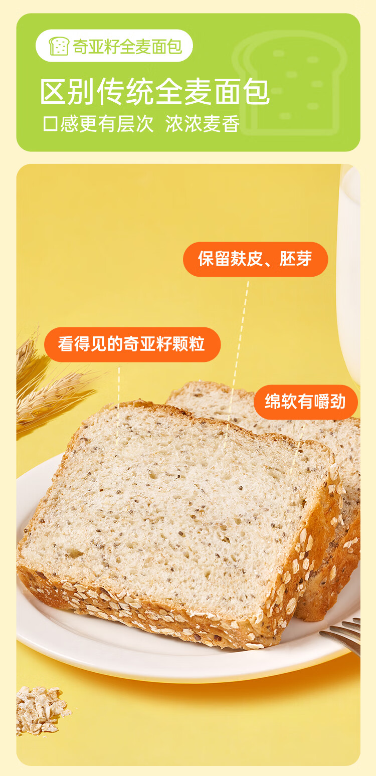 碧翠园奇亚籽低脂全麦面包1000g无蔗糖粗粮健身手撕面包早餐休闲零食