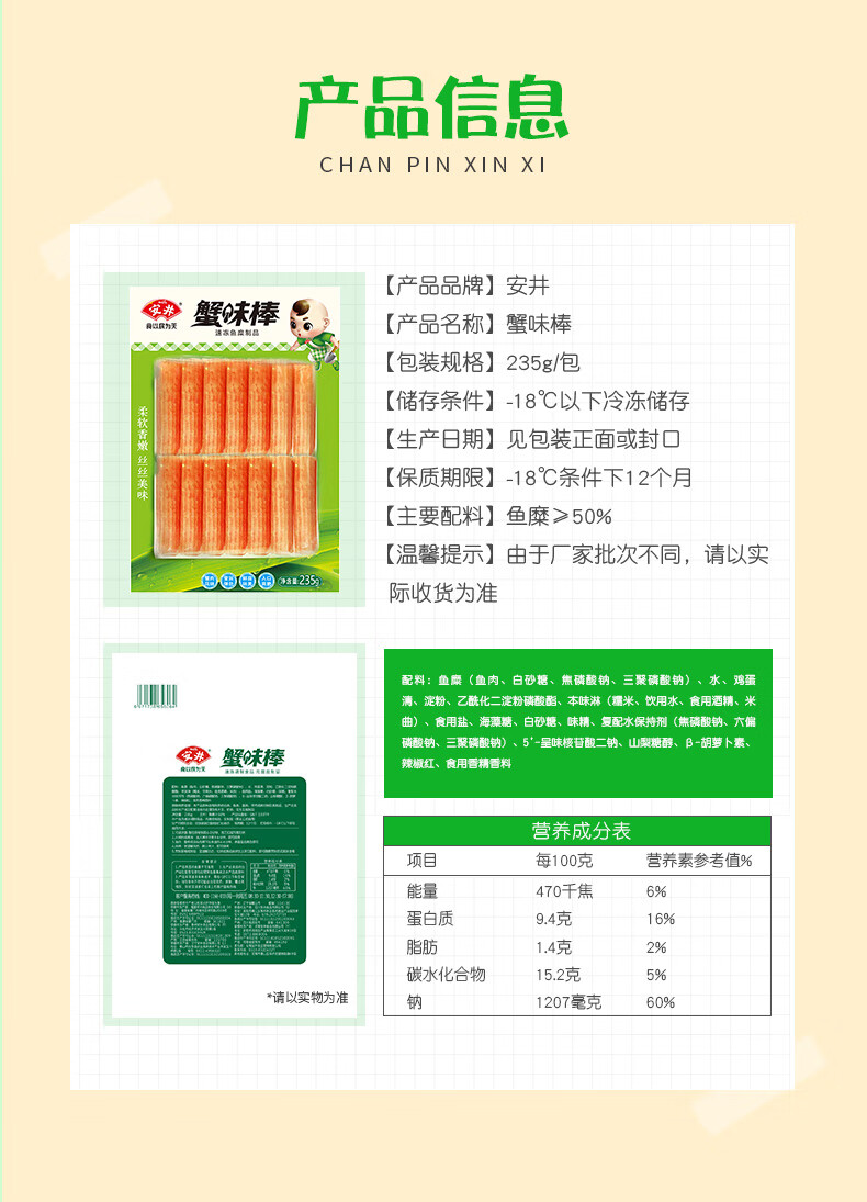 安井 蟹味棒 235g 1包 鱼糜含量50% 火锅烧烤关东煮麻辣烫食材