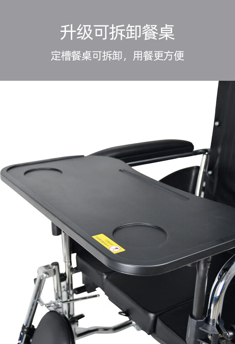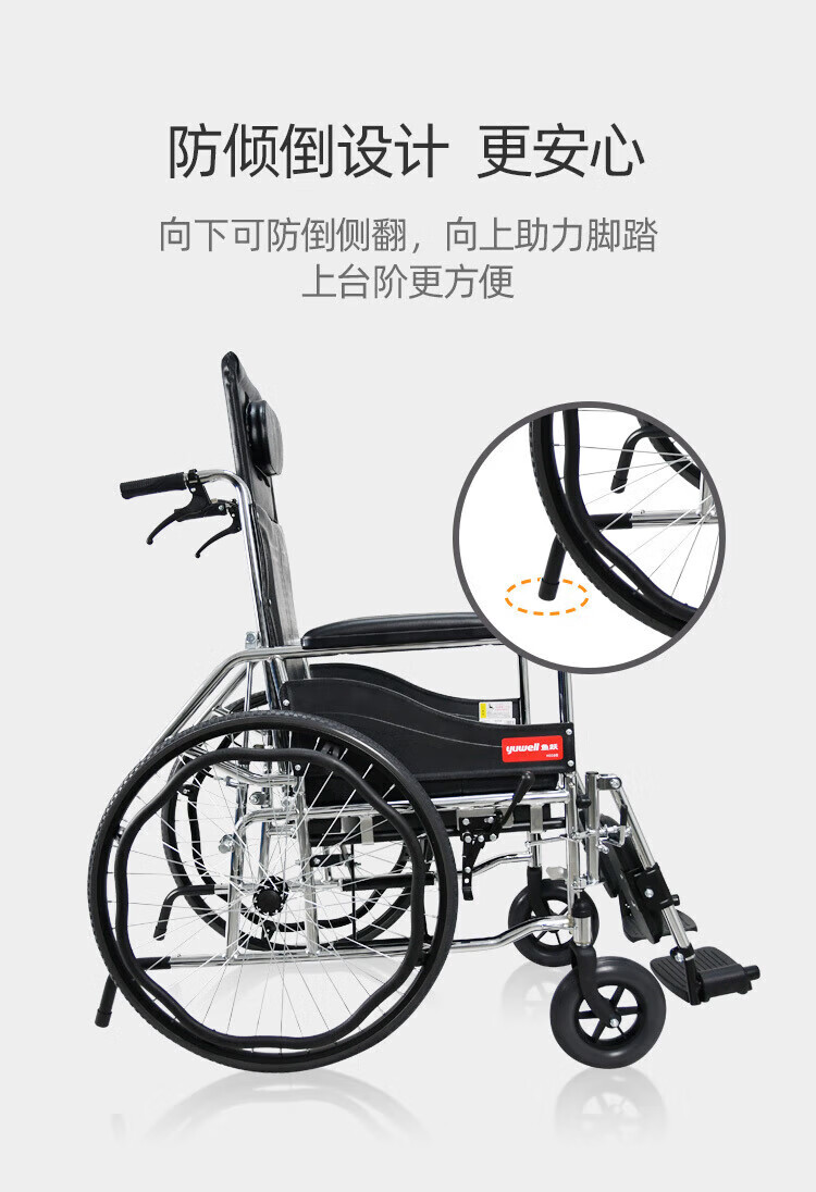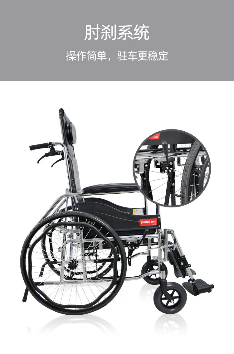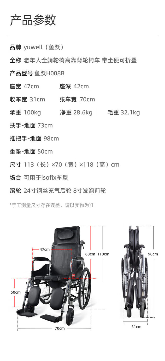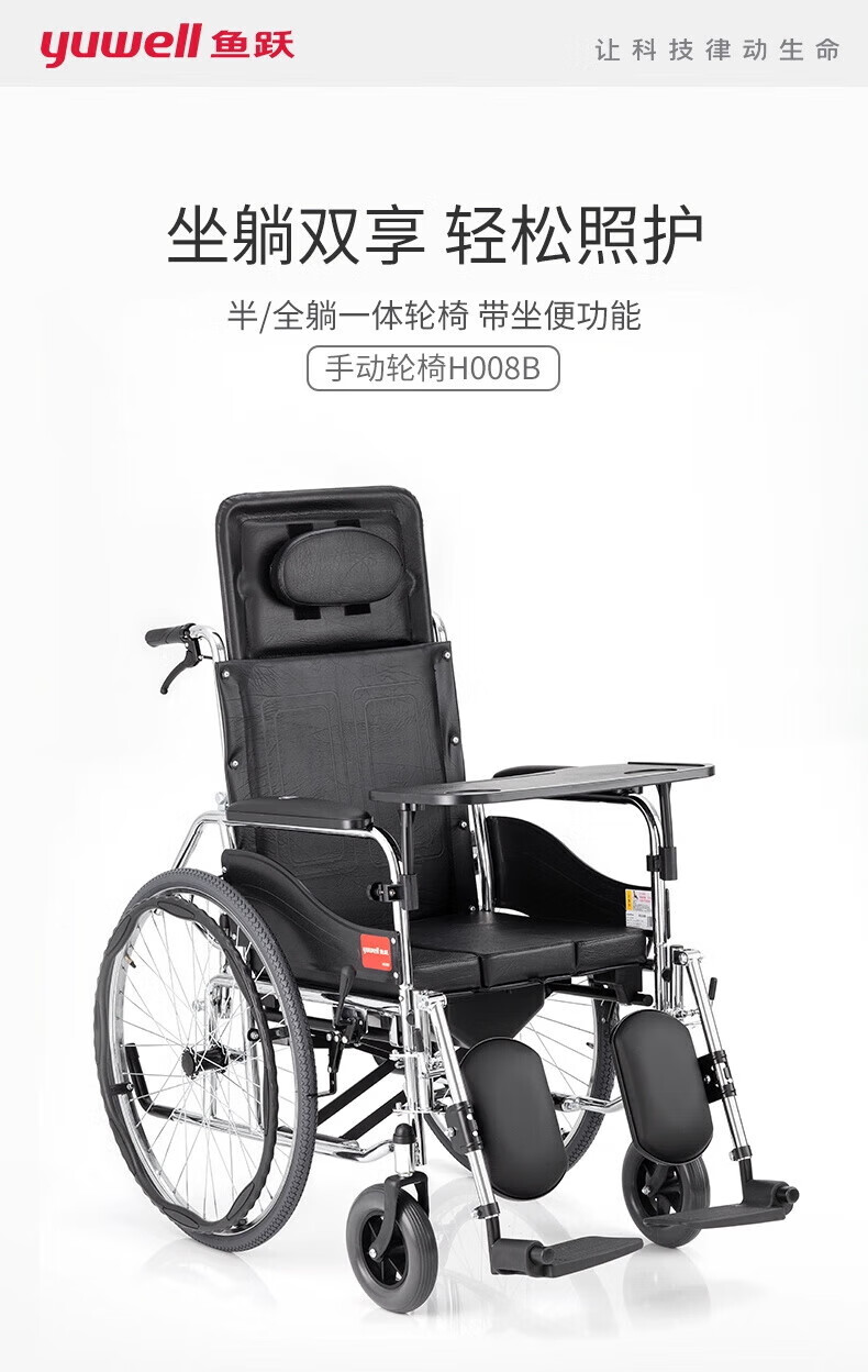 鱼跃轮椅车折叠H008B轻便老人专用带坐便器瘫痪护理代步手动推车 H008B实心胎高靠背全躺-