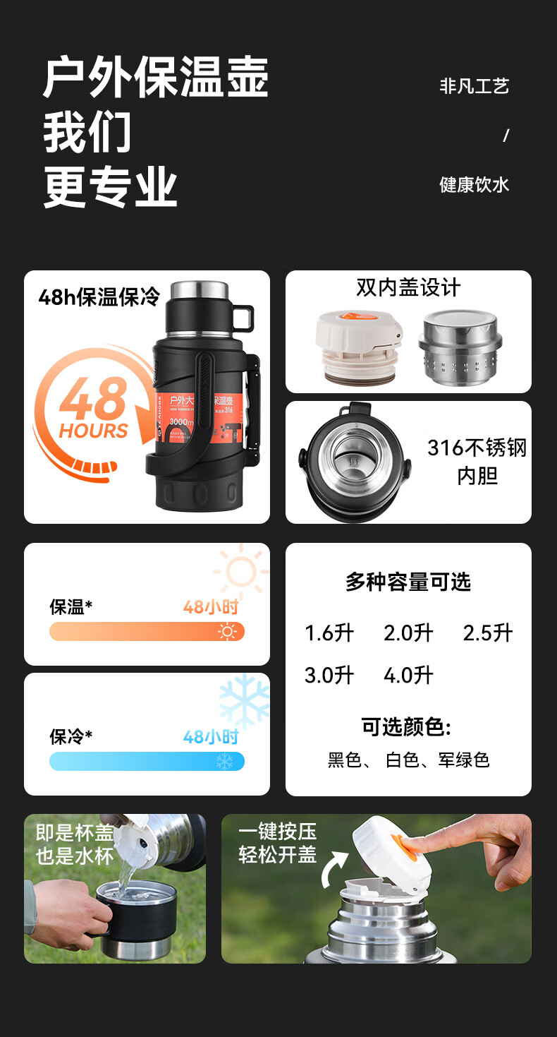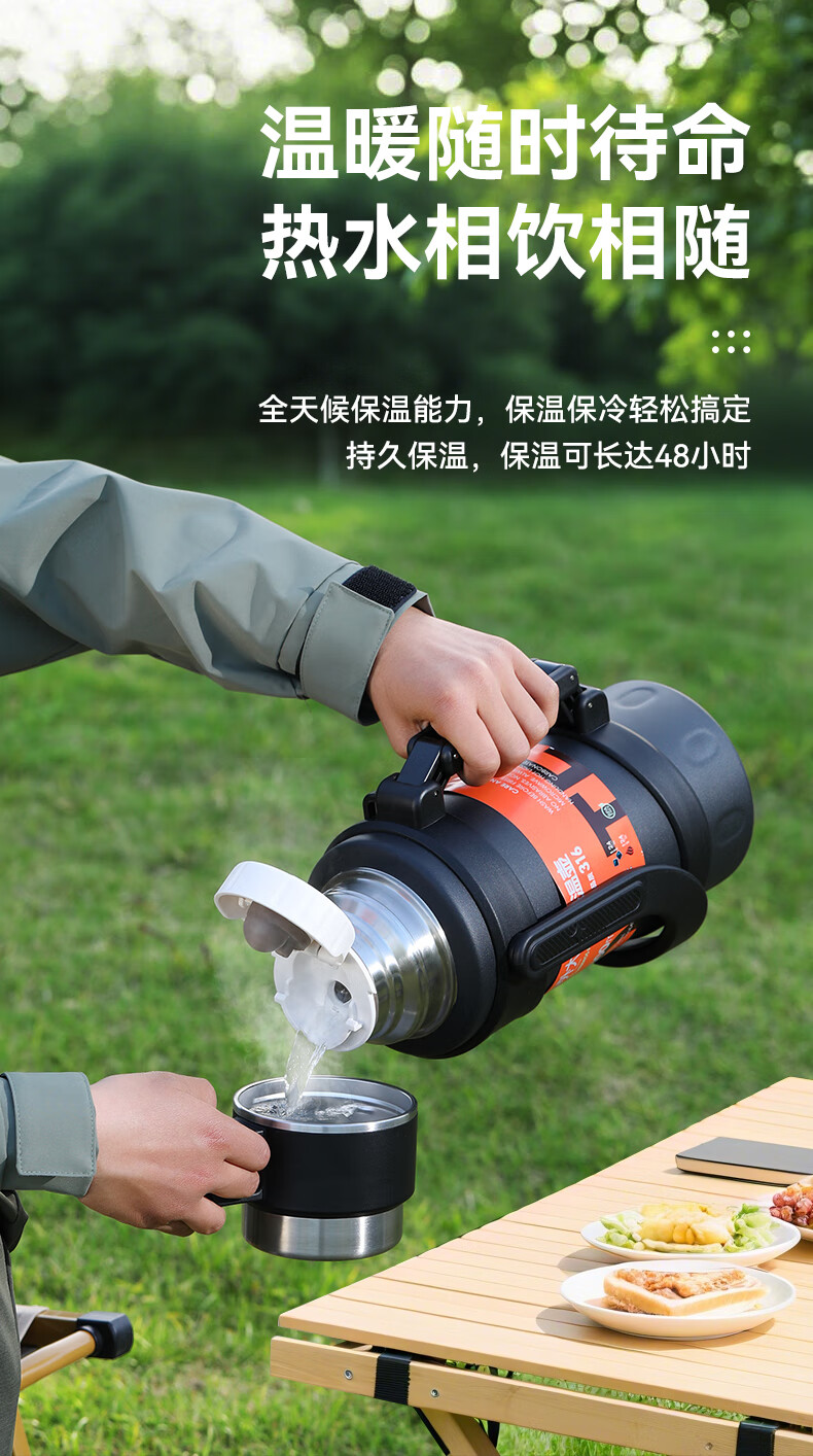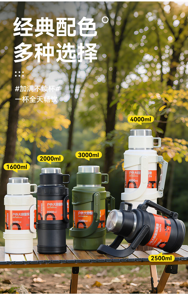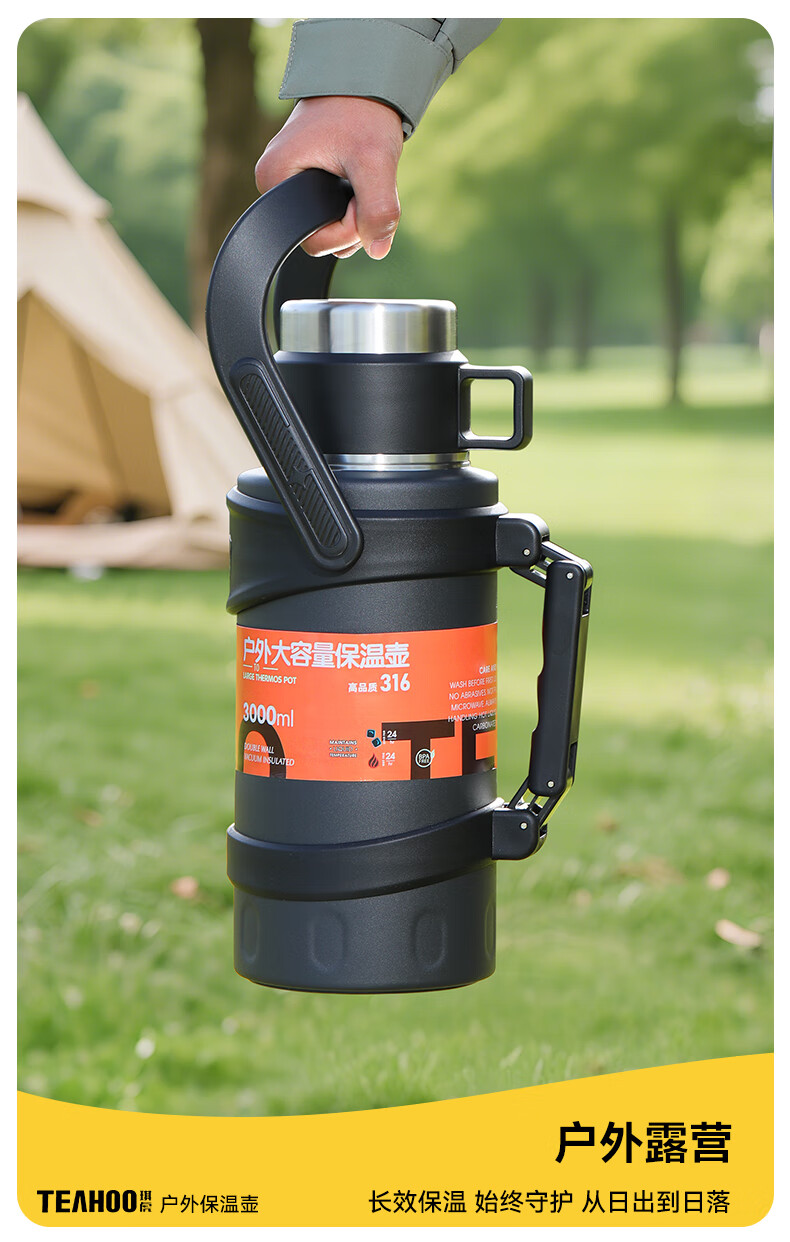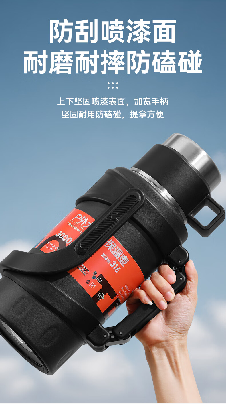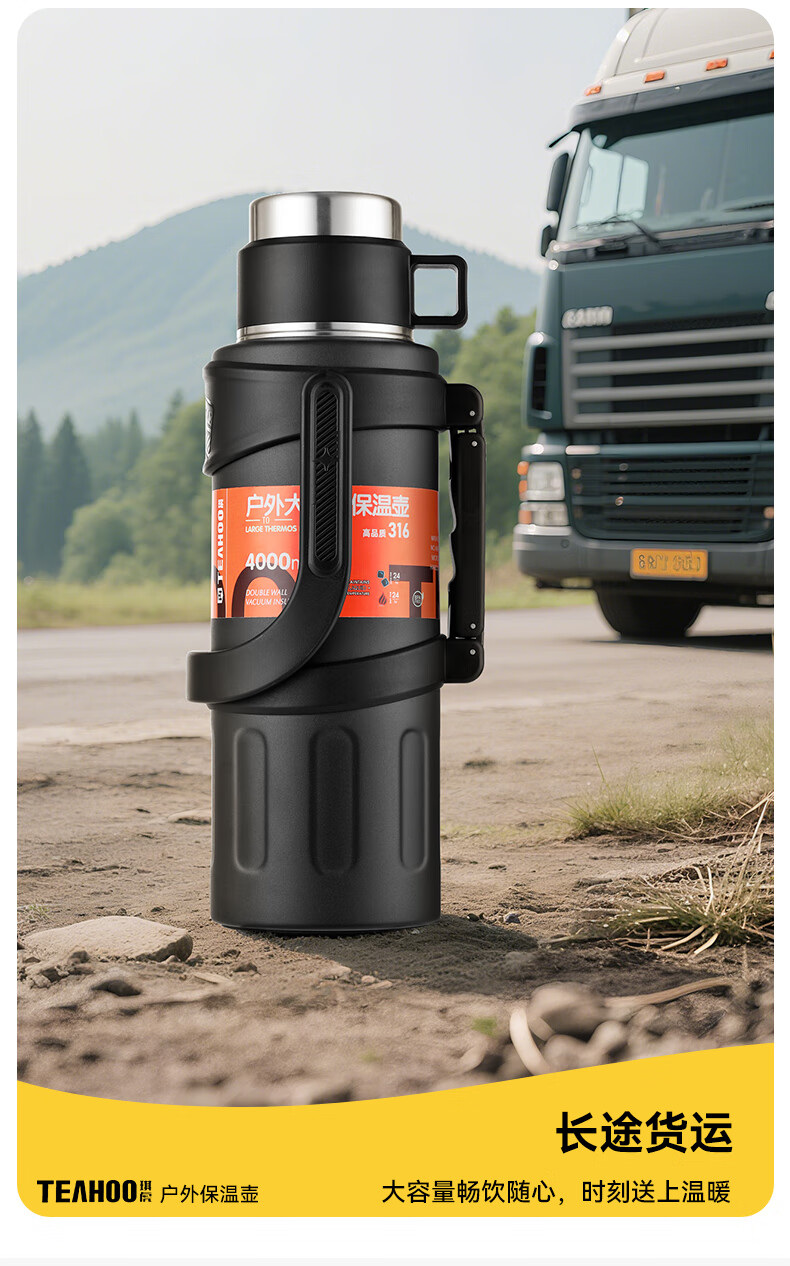 琪虎316不锈钢保温壶大容量户外便携2025新款家用水瓶车载旅行壶宿舍 双内盖-双把手-4000ML黑色