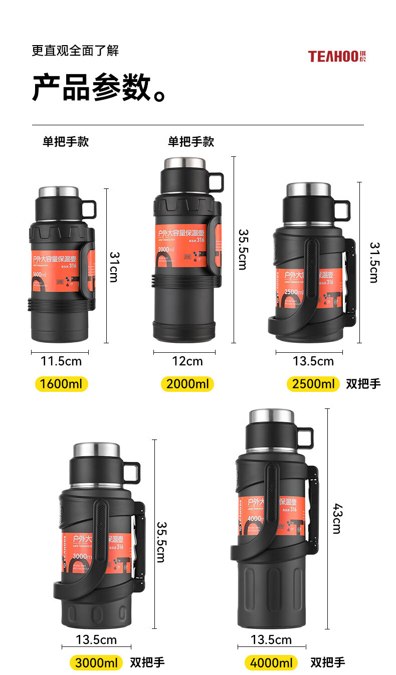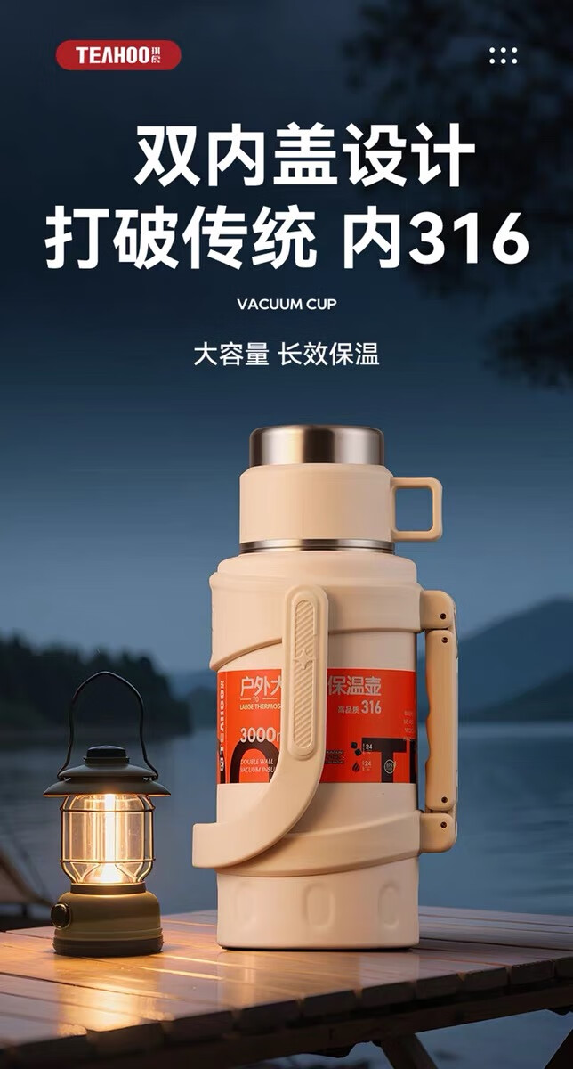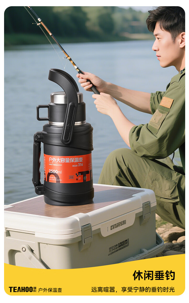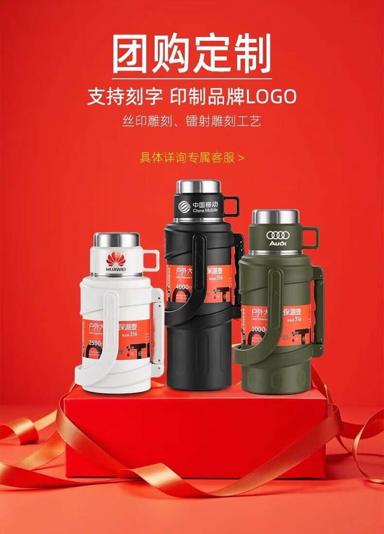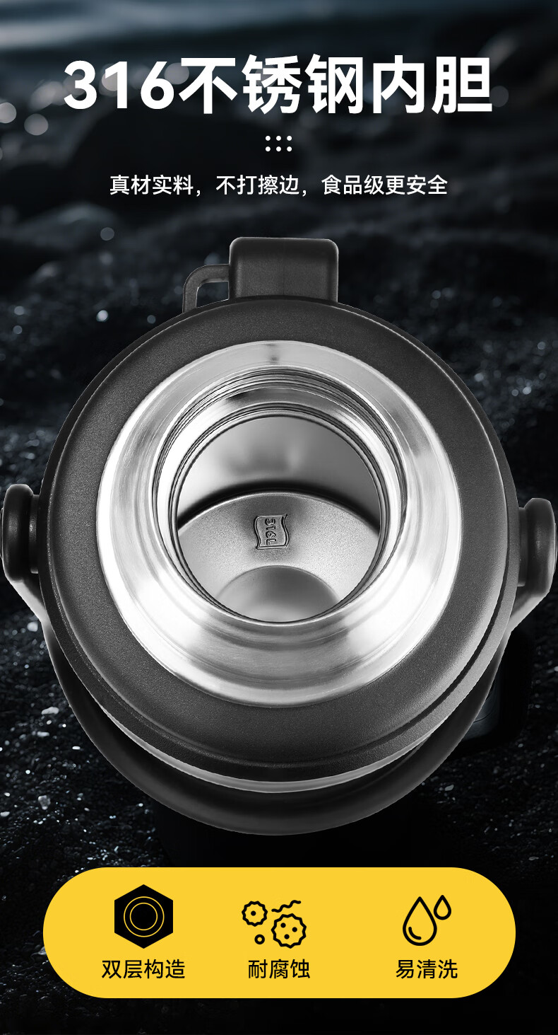 琪虎316不锈钢保温壶大容量户外便携2025新款家用水瓶车载旅行壶宿舍 双内盖-双把手-4000ML黑色