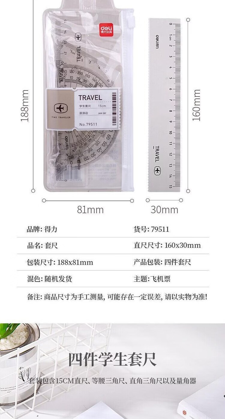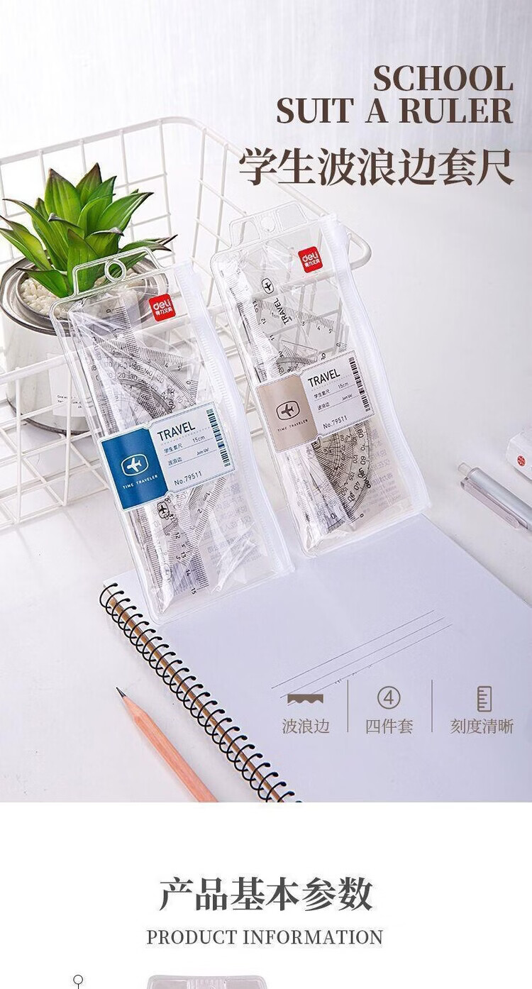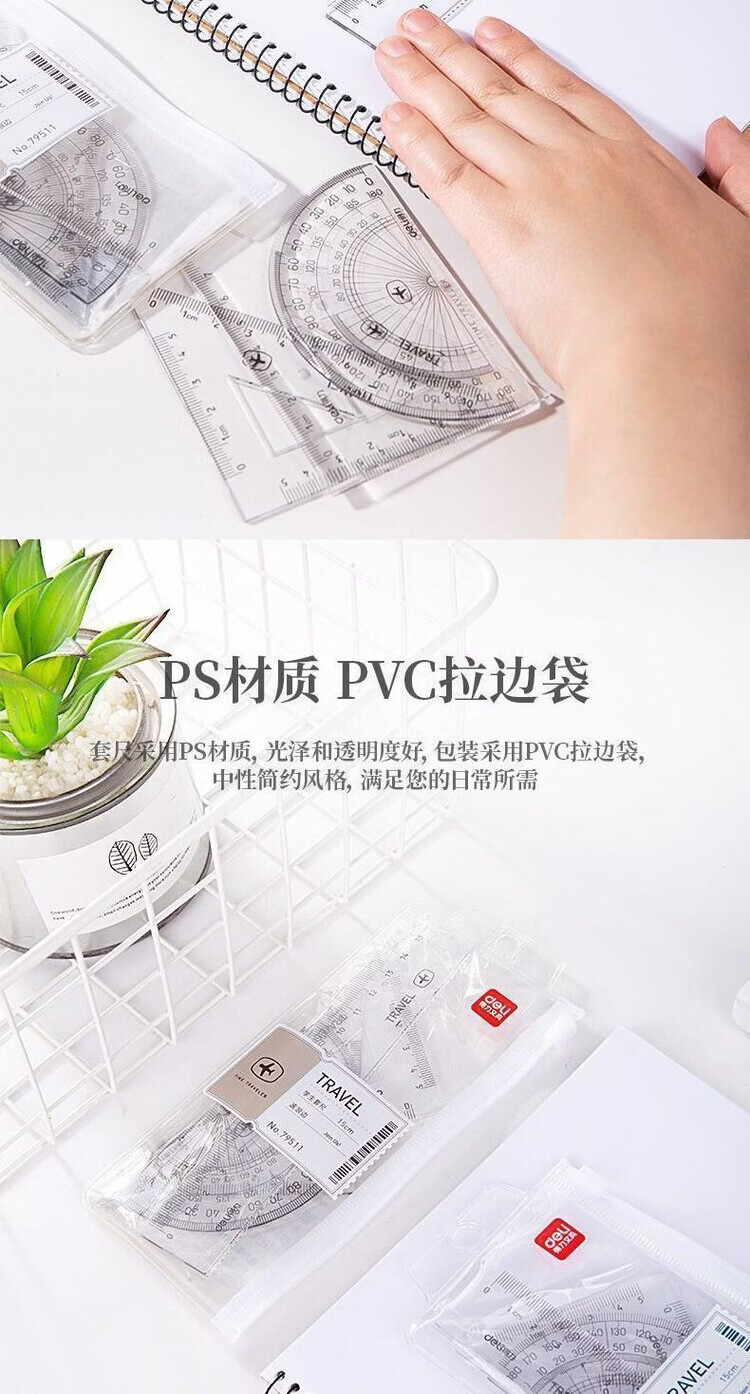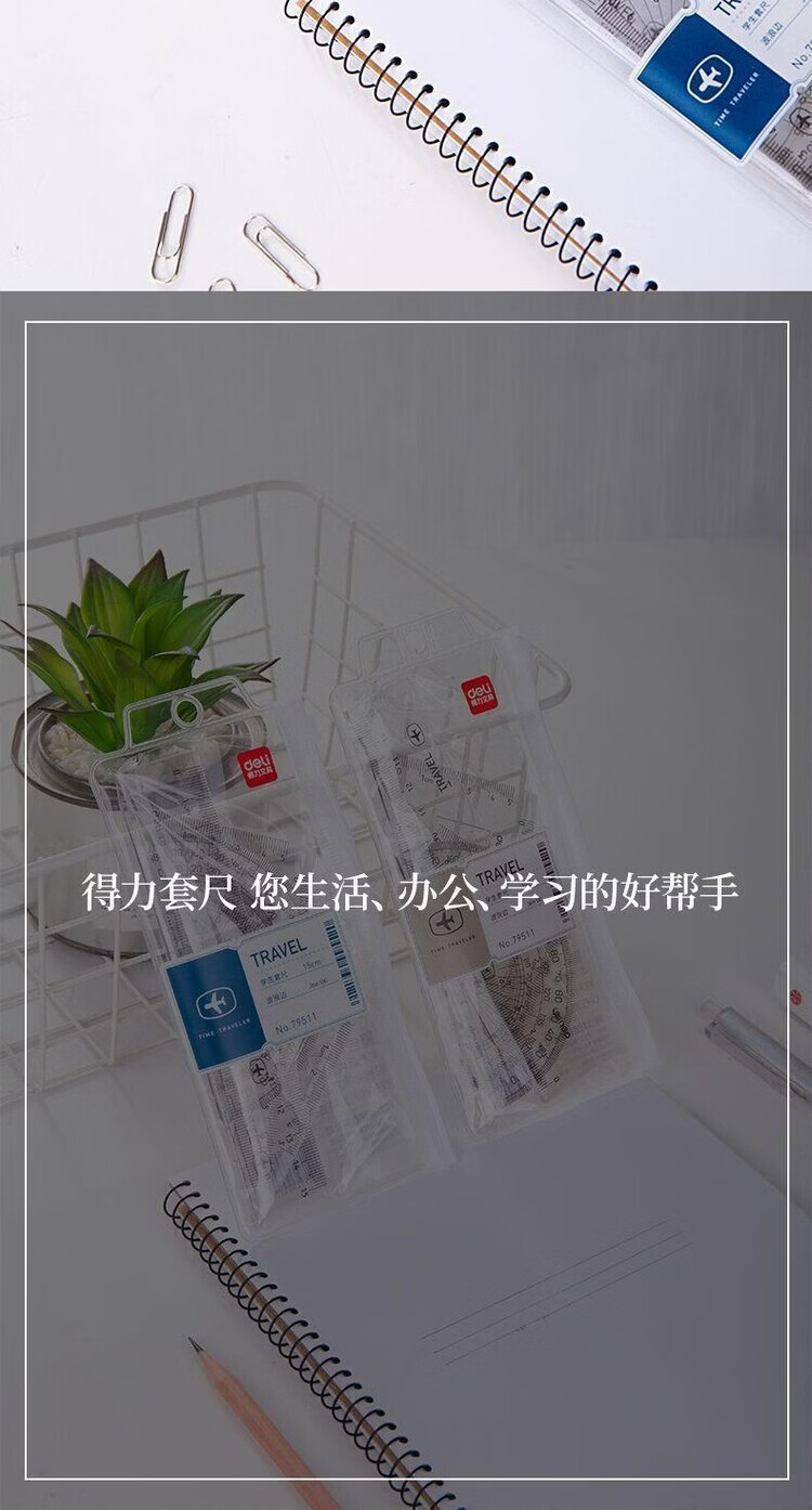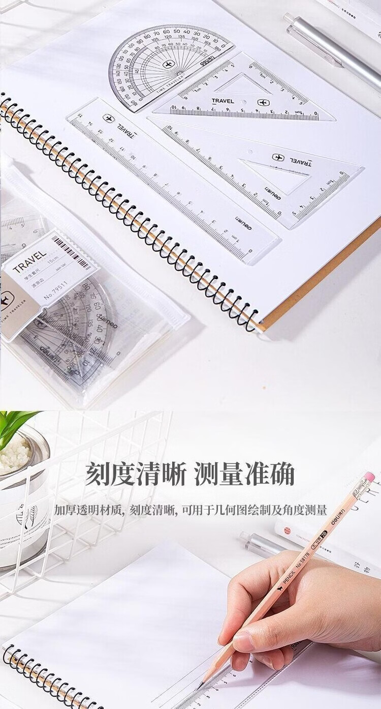 得力(deli)79511学生套尺透明直尺量角器刻度尺绘图制图套装四件套批发 79511套尺【买一送一到手2套】
