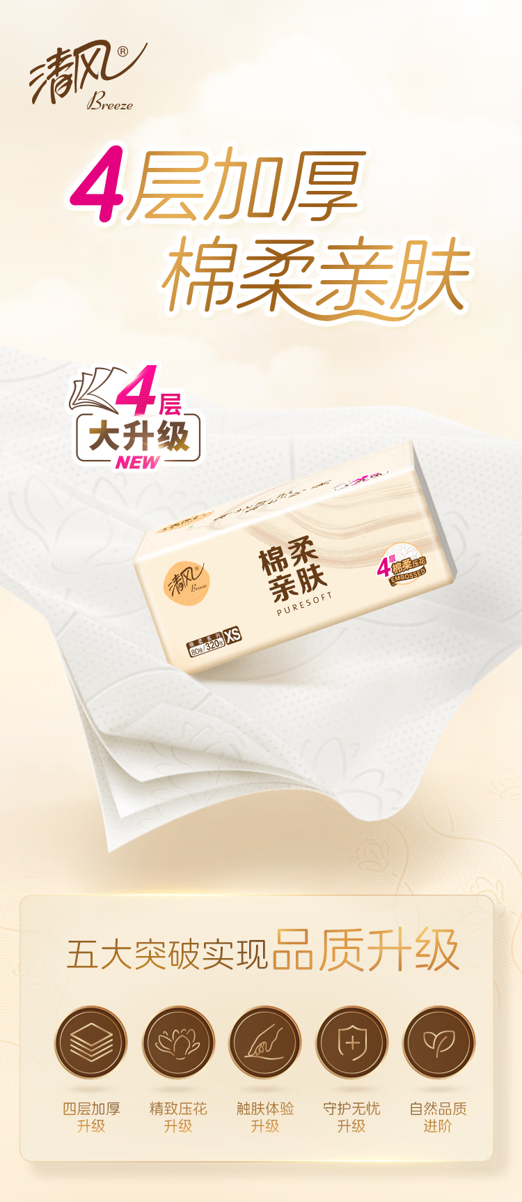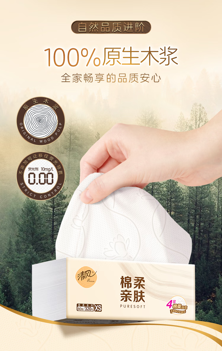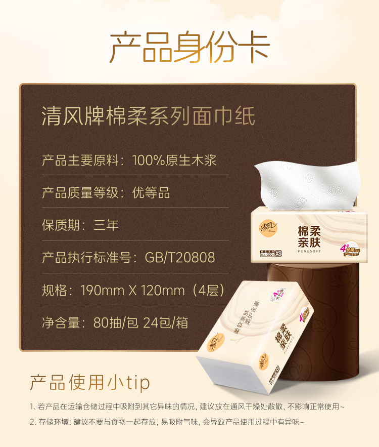 清风棉柔系列抽纸S码4层80抽*24包整箱家用棉柔餐巾纸擦手纸卫生纸
