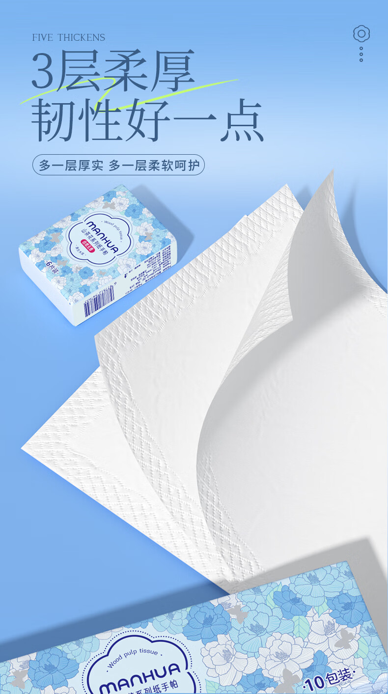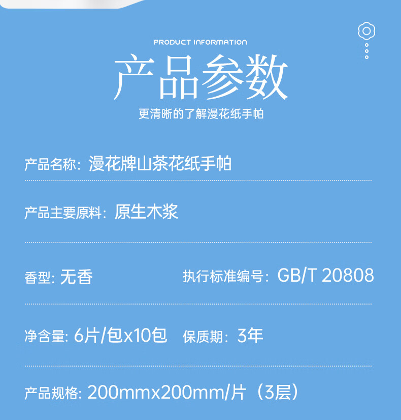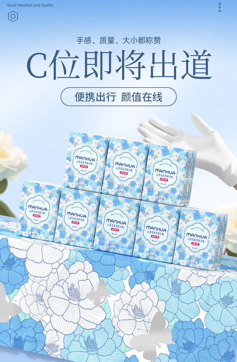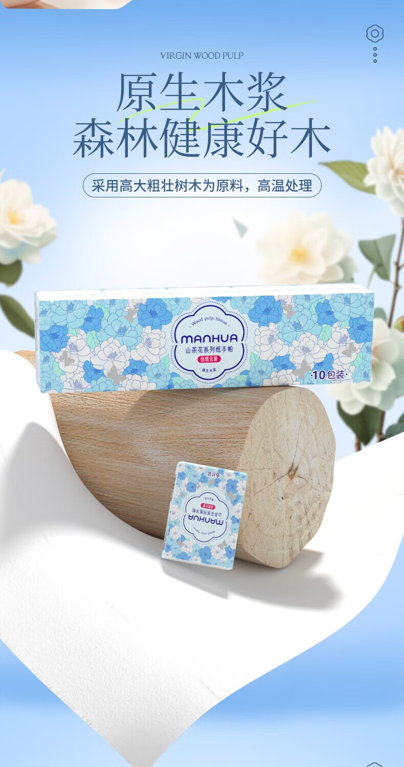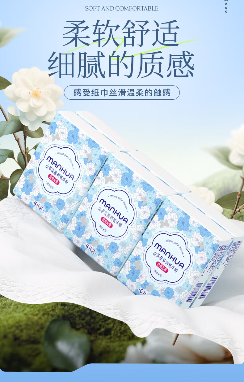 漫花手帕纸 山茶花系列 6片装便携纸巾小包抽纸便携面巾纸餐巾纸 3层 6片*20包