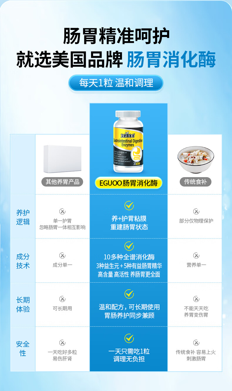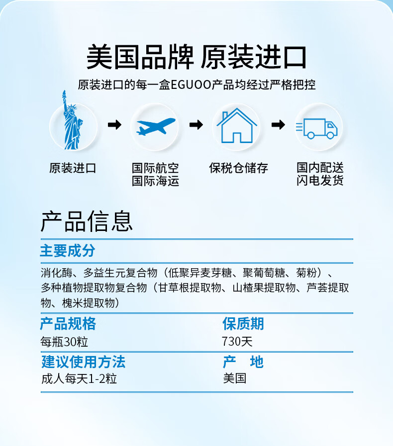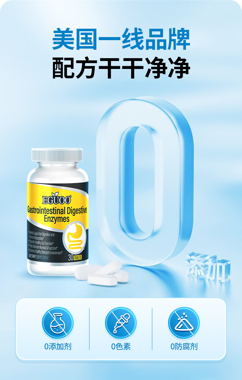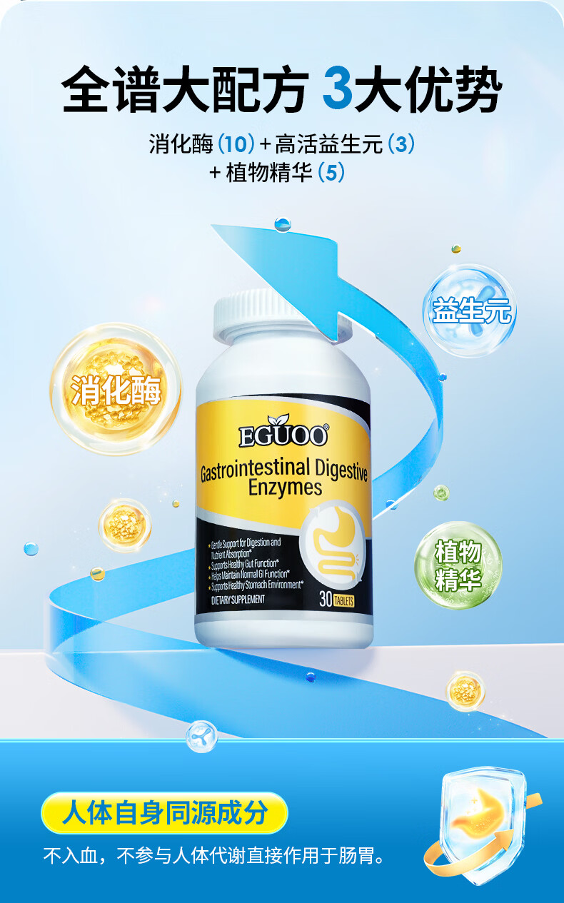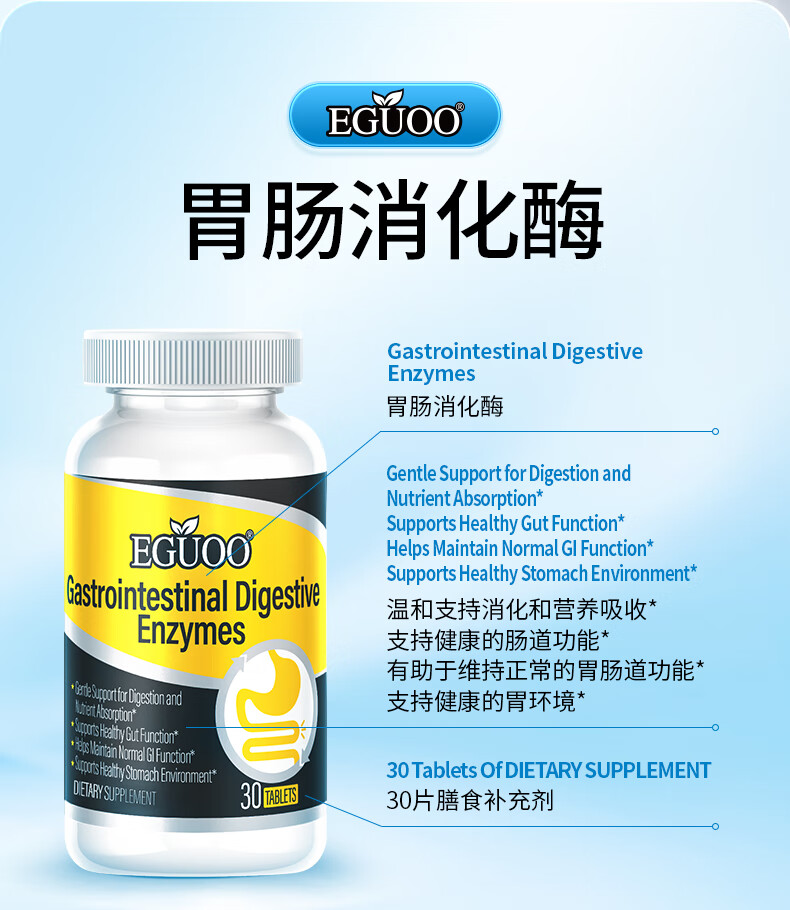 EGUOO原装进口复合消化酶肠胃片益生元 肠胃不适消化不良调理肠胃片 1瓶装(30天够用) 30粒*1瓶