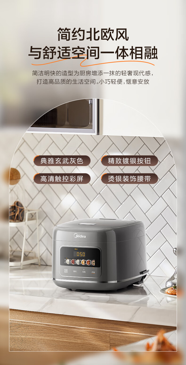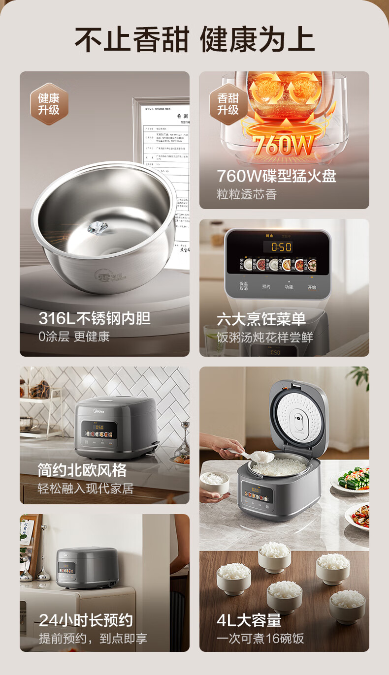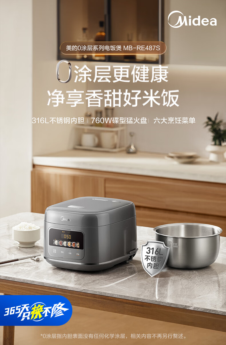 美的(Midea)电饭煲大布丁0涂层电饭锅4升316L不锈钢内胆3-4人家用多功能无涂层微压智能预约RE487S品牌官方