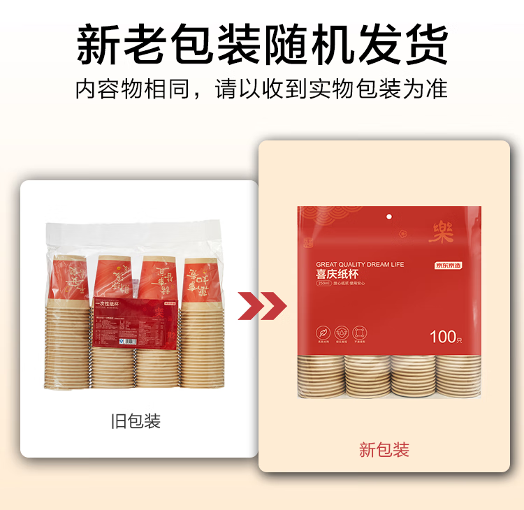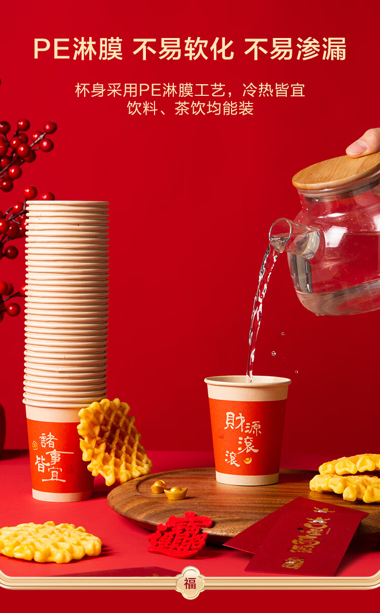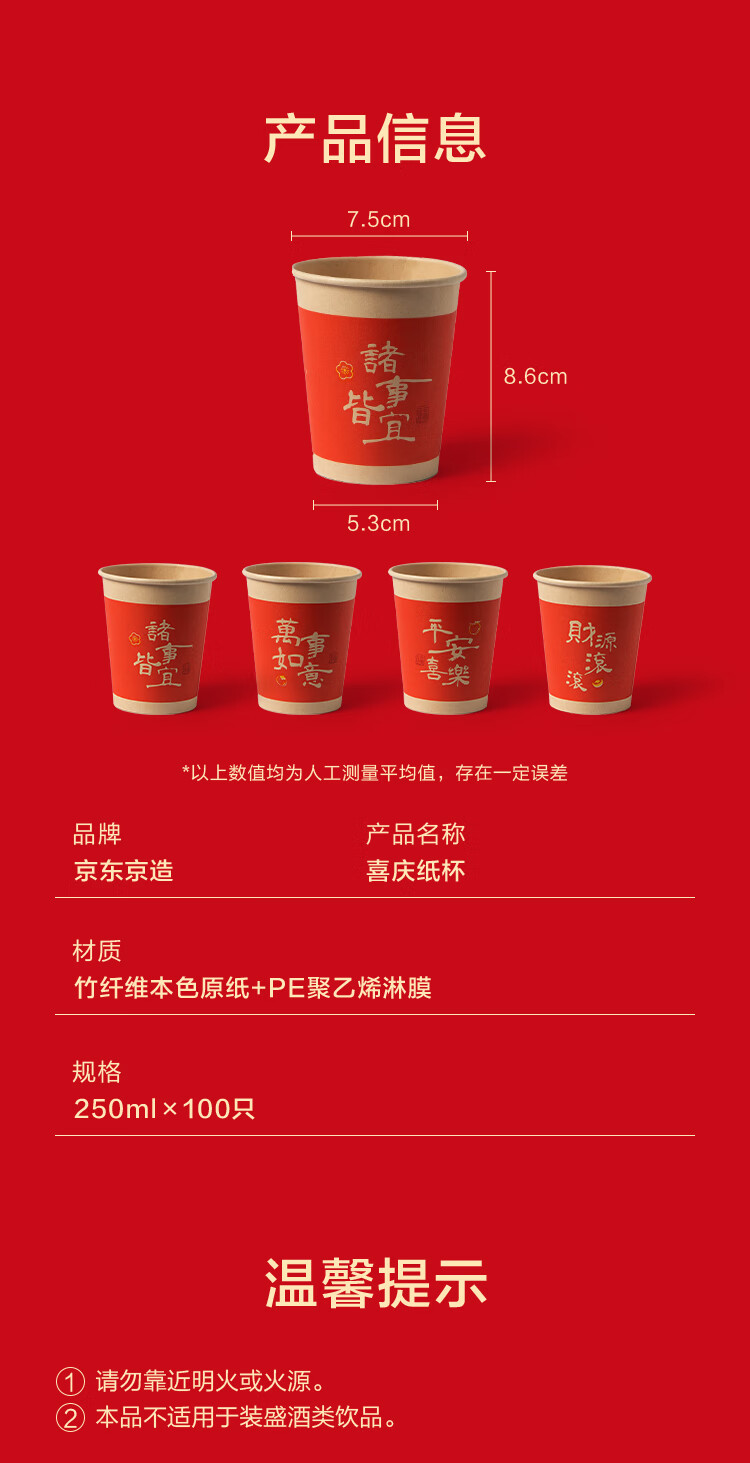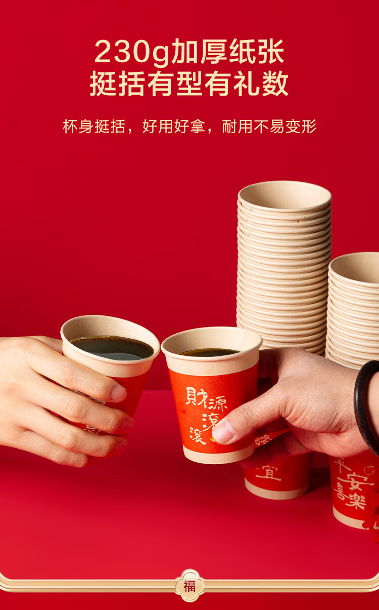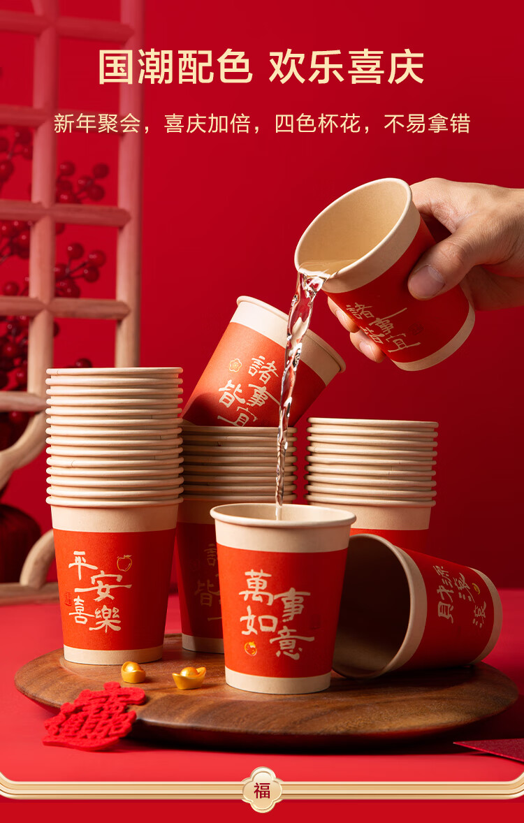 京东京造 纸杯一次性杯子 大号红色加厚食品级节日喜事水杯250ml【100只】