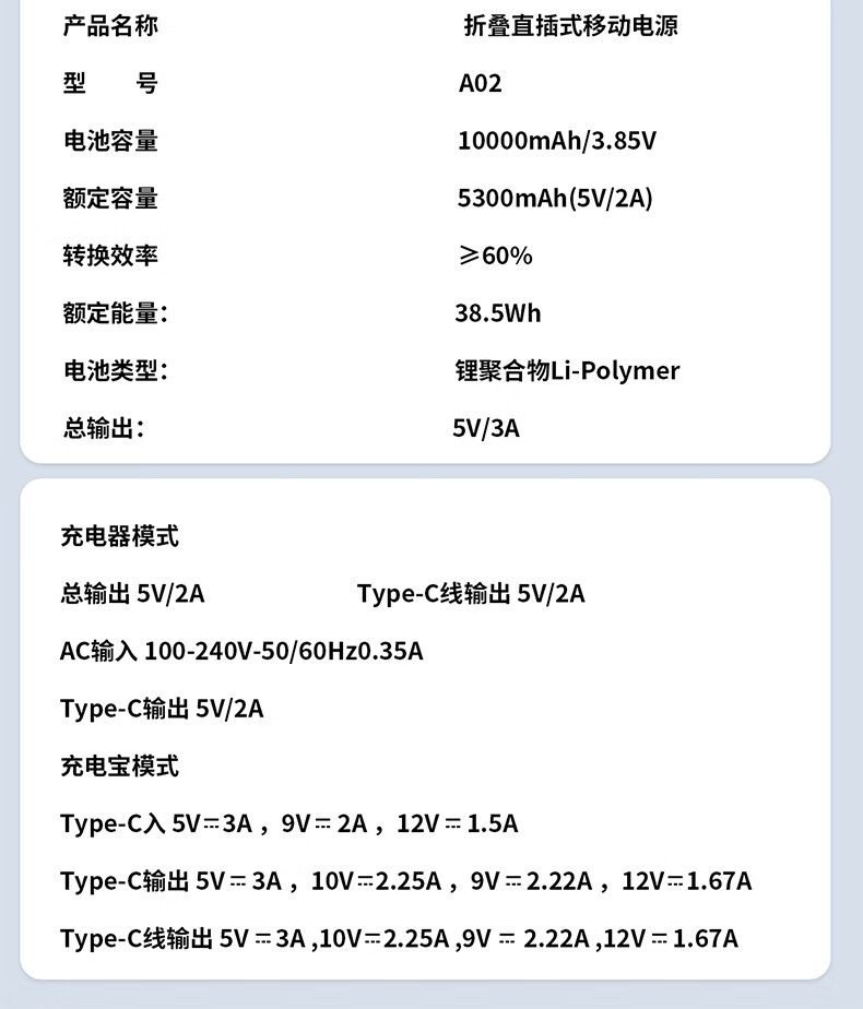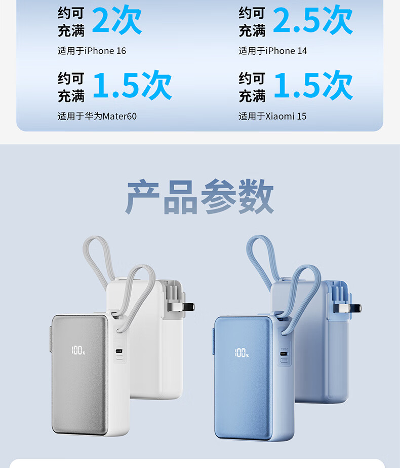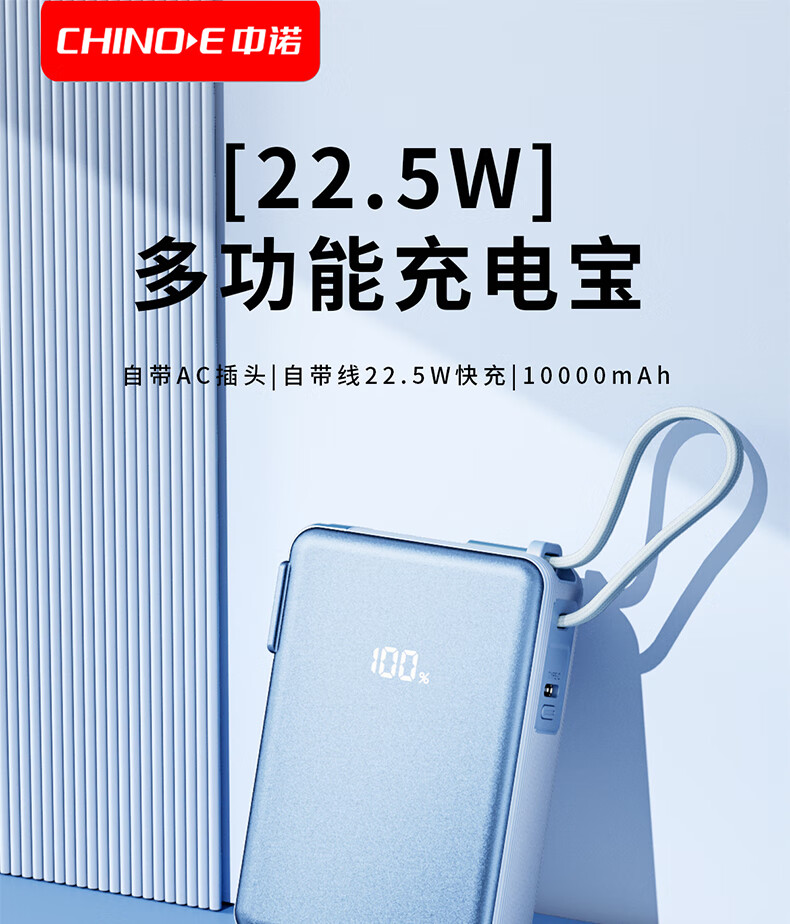 中诺(CHINO-E)【国家3C安全认证 可上飞机高铁】充电宝10000毫安自带插头自带线小巧便携移动电源适用苹果小米 极光银【1万毫安+AC插头+自带线】