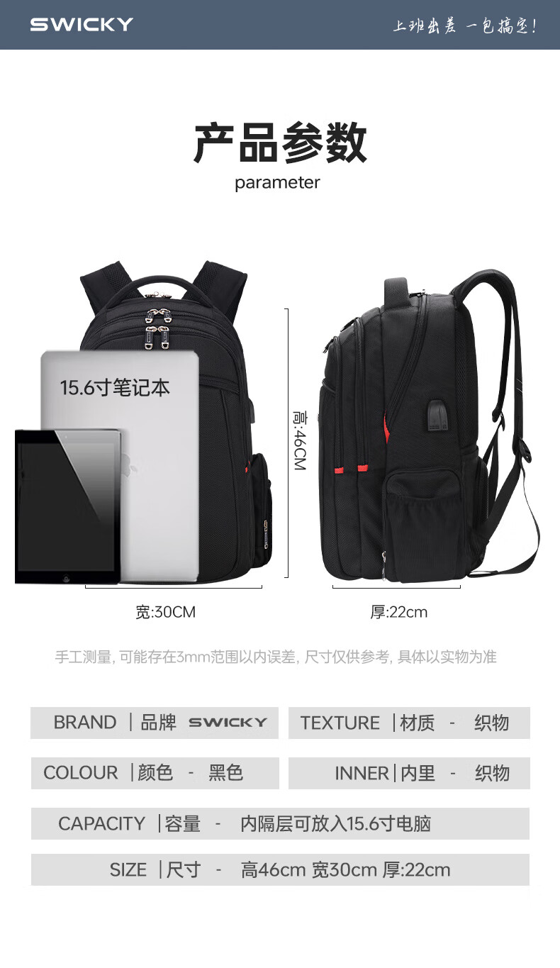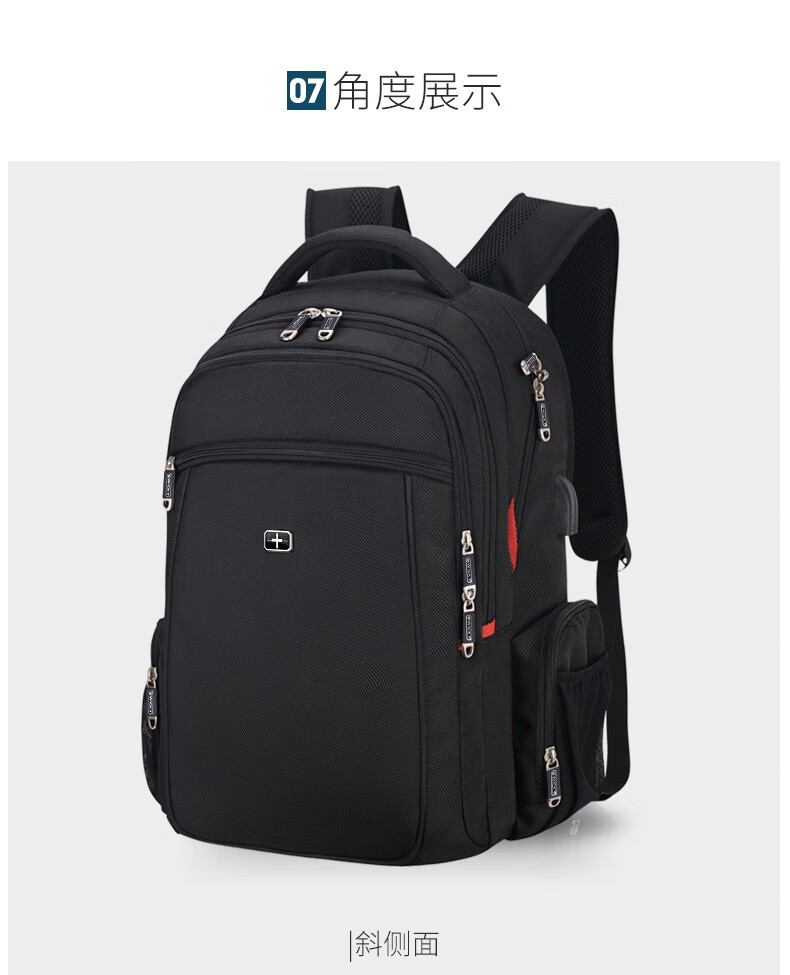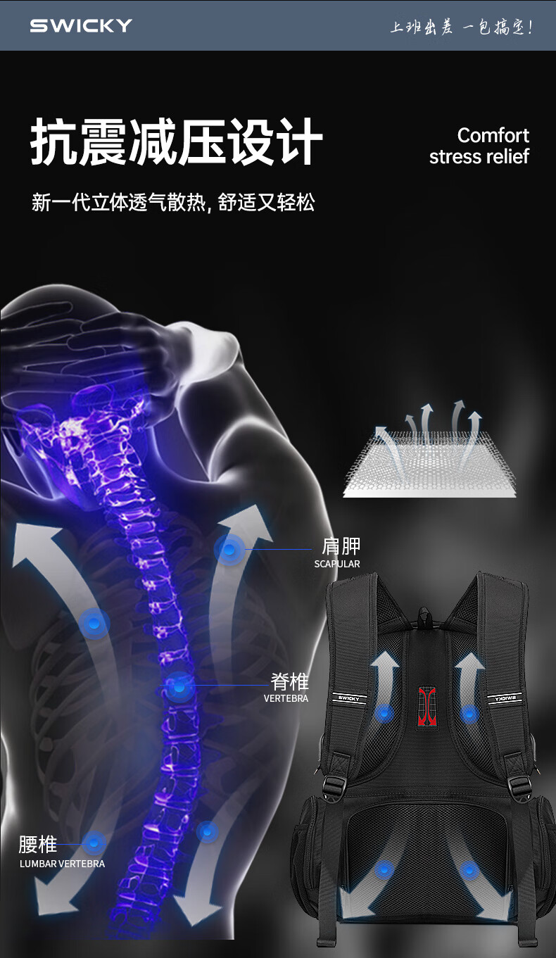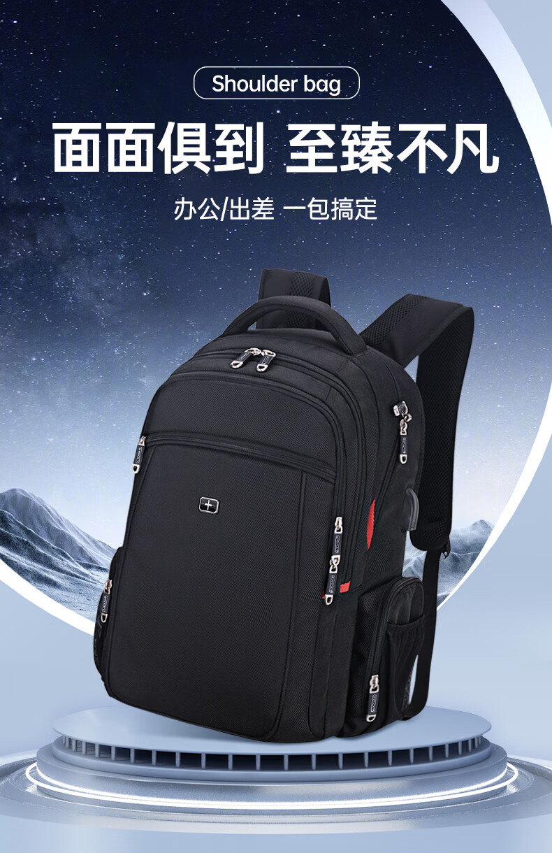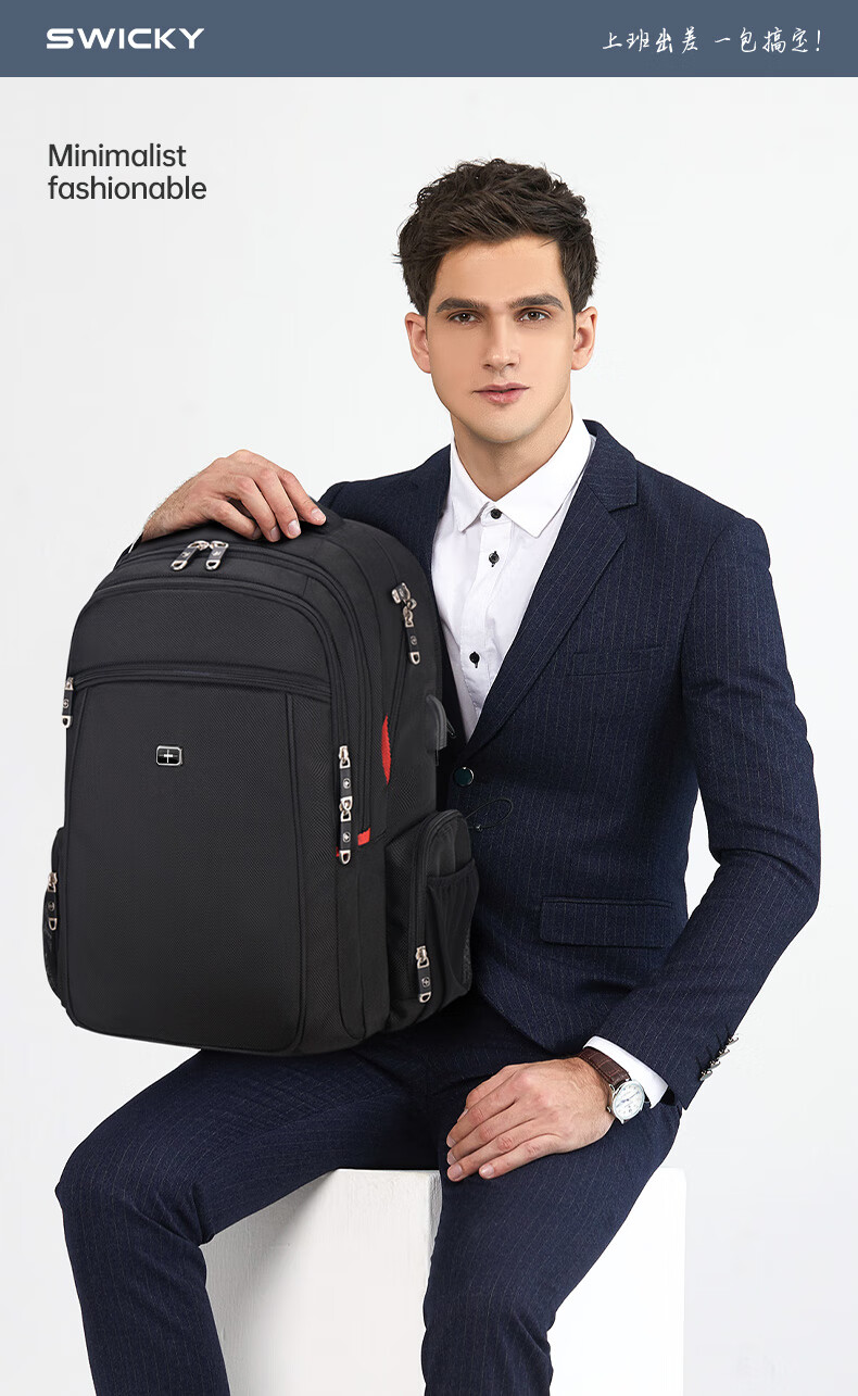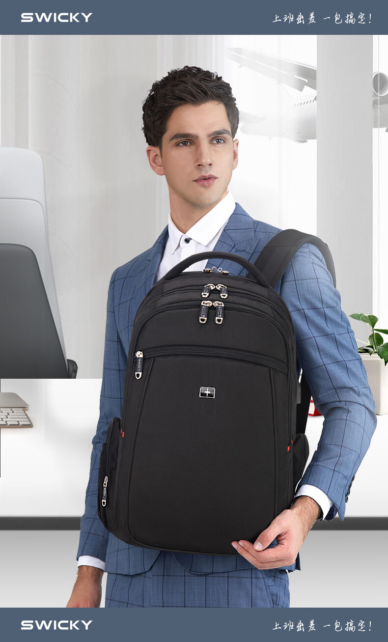 SWICKY瑞士男士背包旅游双肩包商务旅行出差笔记本电脑背包大容量双肩包 黑色【40L加厚设计】