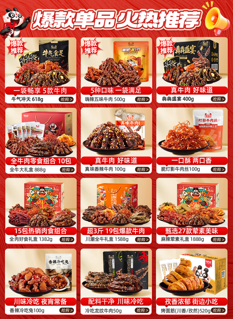 蜀道香 川味嗨辣牛肉干500g 5种口味 麻辣肉脯 零食量贩装 年货送礼团购