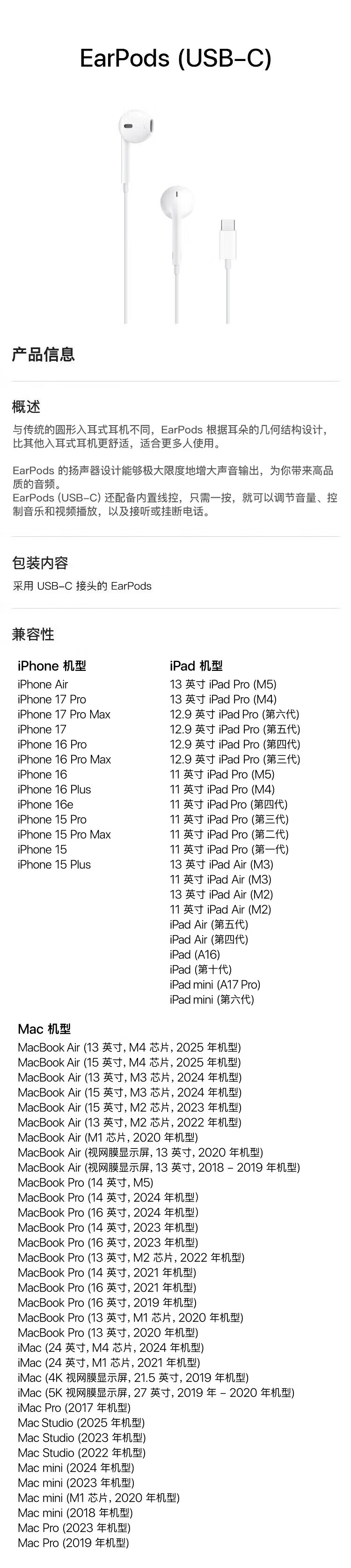 Apple/苹果 EarPods USB-C有线耳机 type-c有线耳机苹果耳机 苹果17有线耳机笔记本耳机游戏音乐