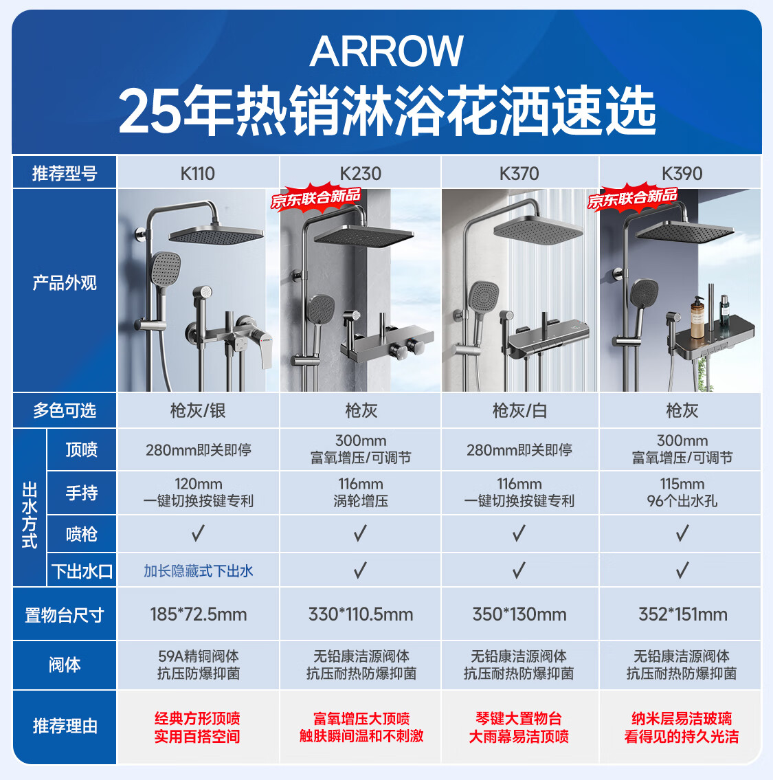 箭牌(ARROW)K110淋浴花洒套装喷头增压花洒手持顶喷花洒全套AE34111MGGW-P3