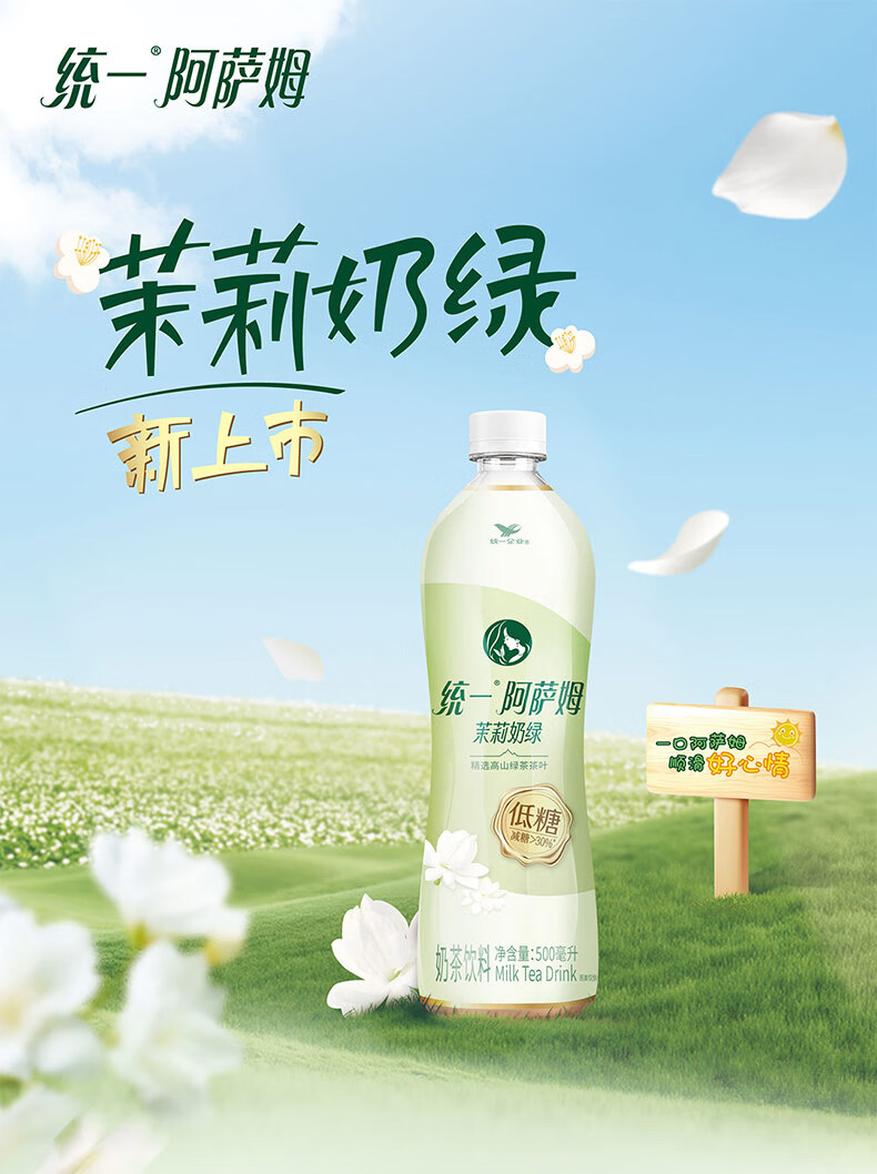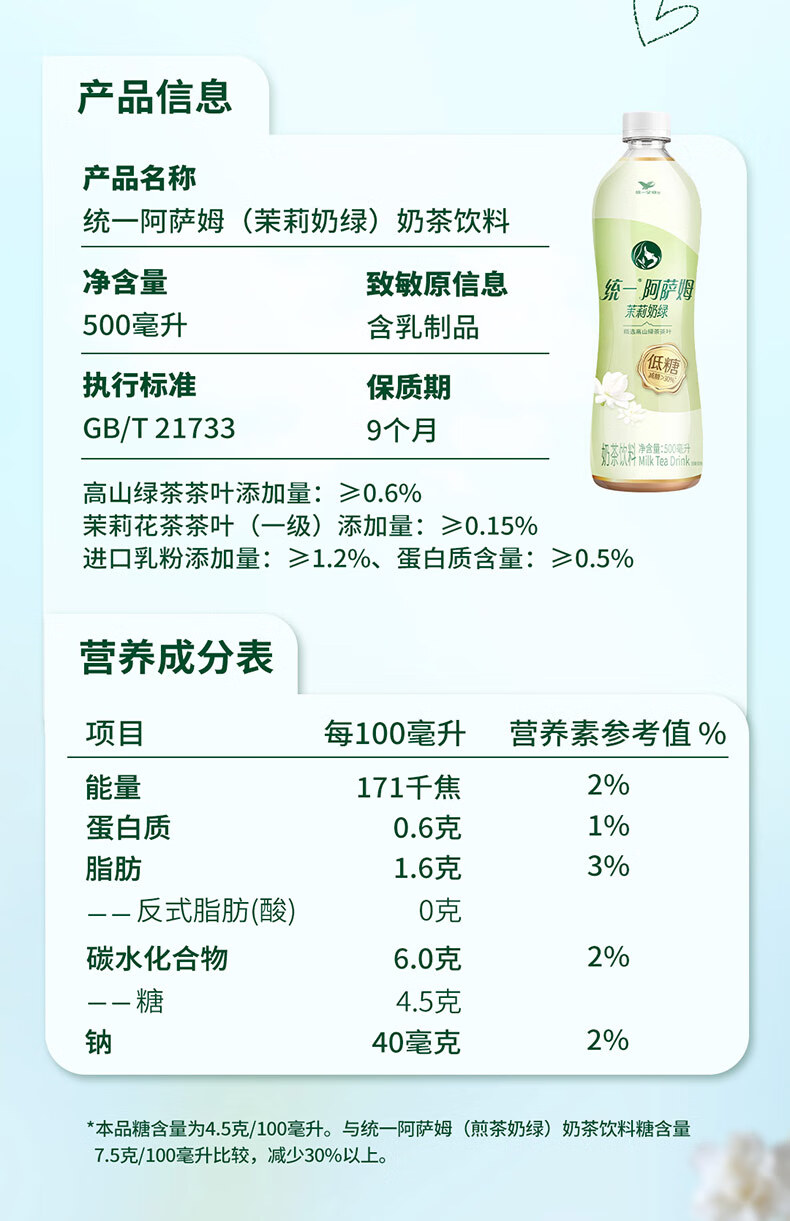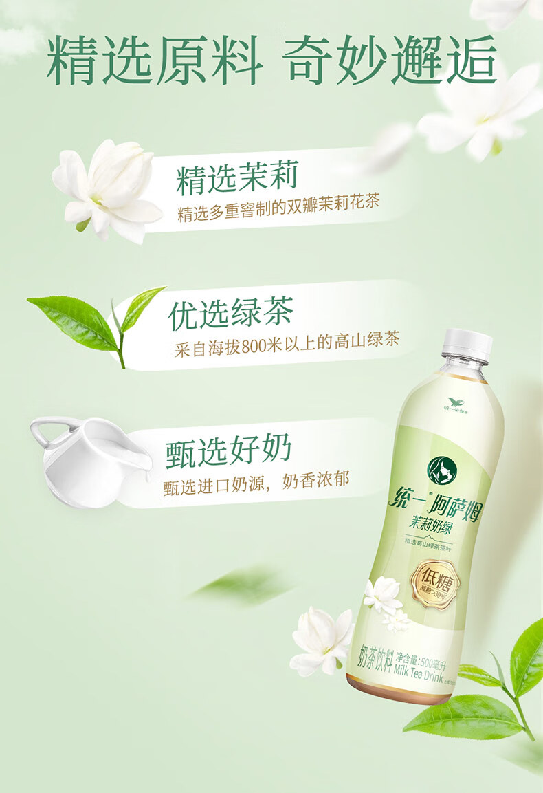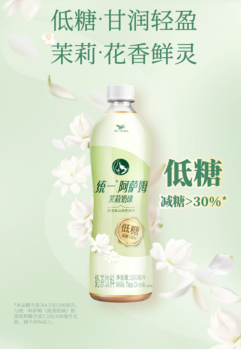 统一阿萨姆低糖茉莉奶绿PET500ML*15瓶整箱装