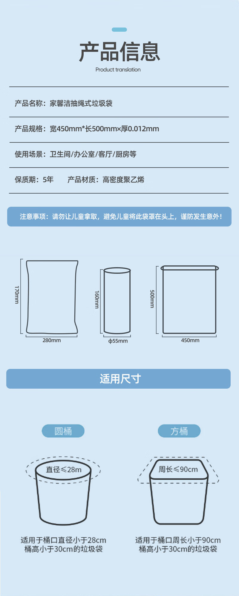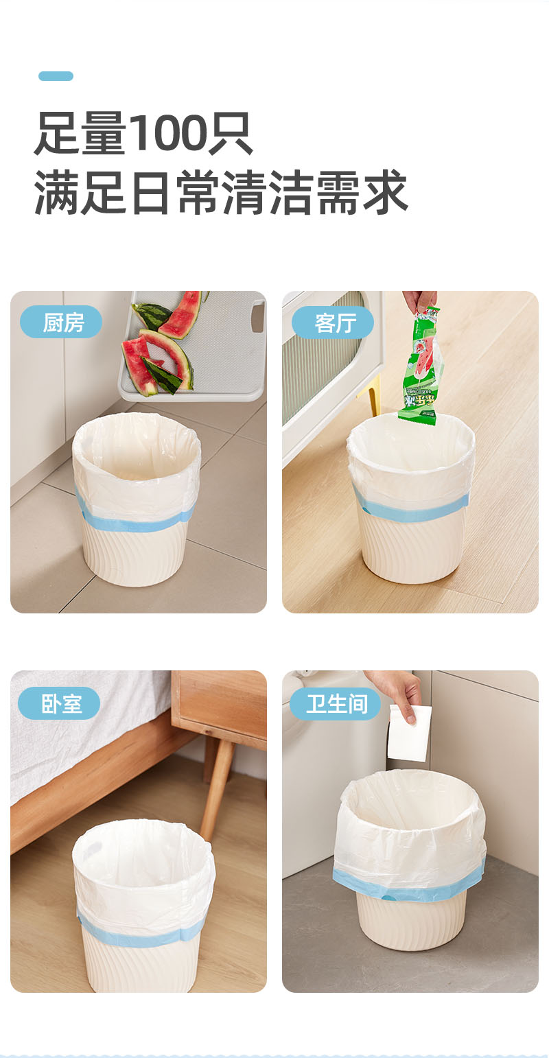 家馨洁抽绳式垃圾袋加厚款白色印花45*50cm家用厨房手提式办公室 平口45*50cm100只(双面2丝)