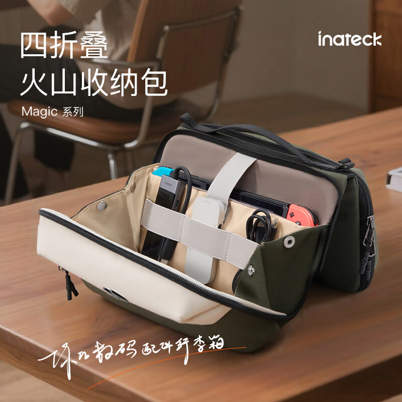 inateck四折叠火山收纳包数码配件数据线充电宝电源配件收纳袋桌面收纳袋 驰骋黑 带肩带