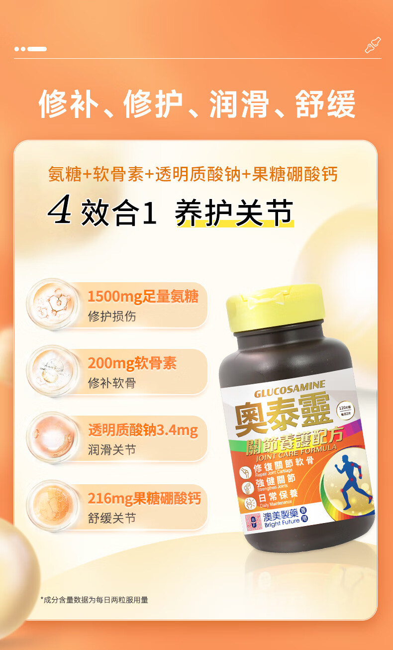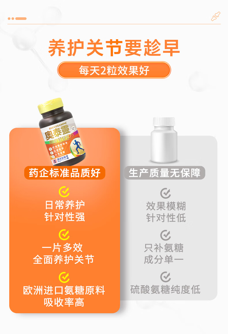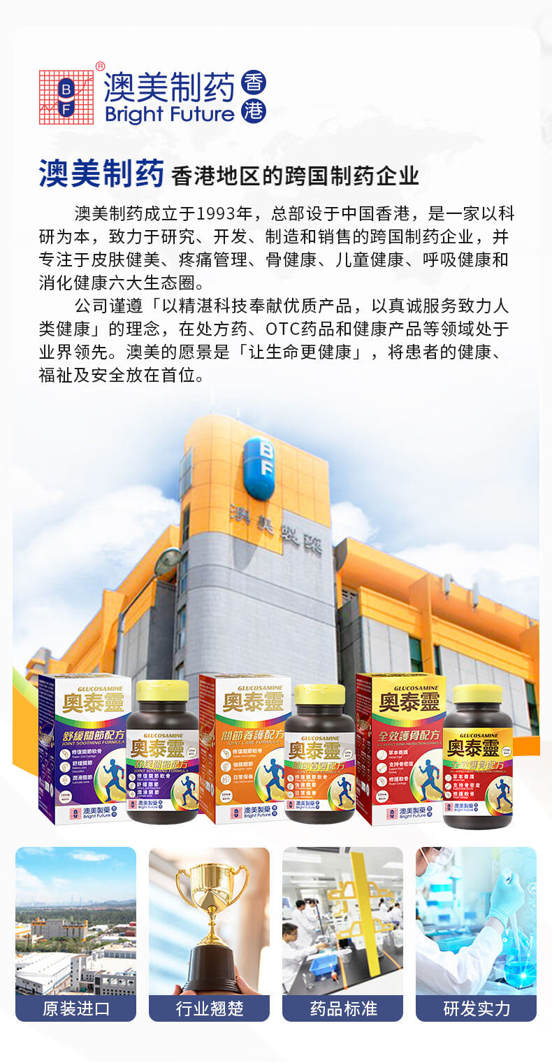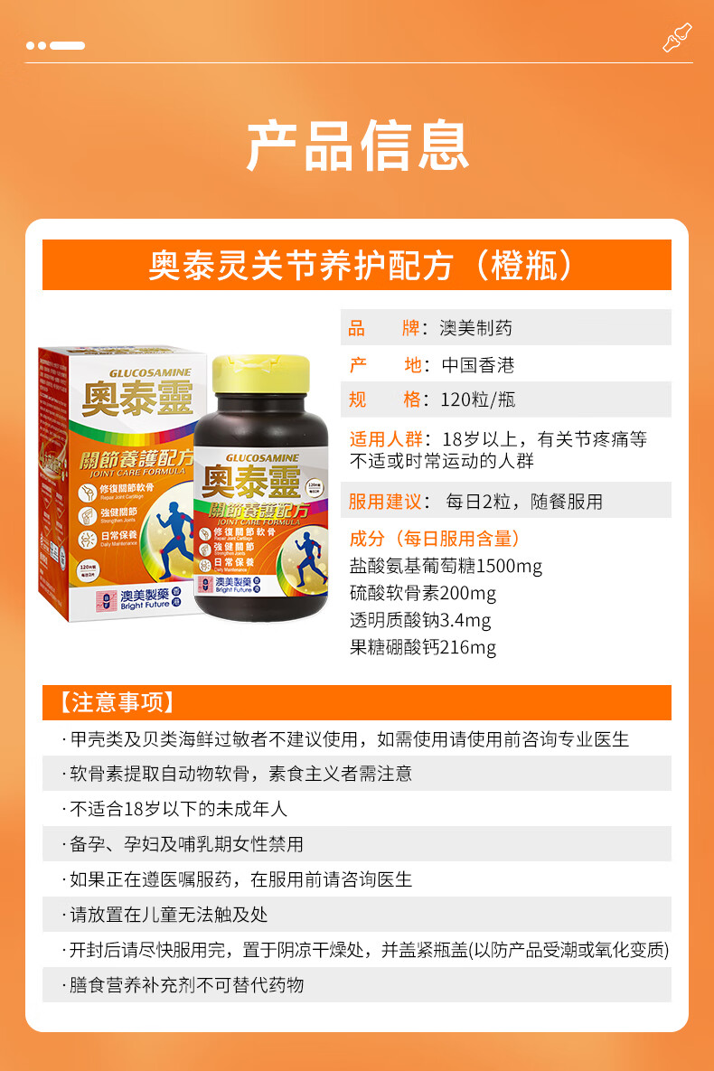澳美製藥奥泰灵香港原装盐酸氨糖软骨素氨基葡萄糖骨关节润滑损伤修复养护 奥泰灵专业氨糖(关节养护+修复) 120粒*1盒