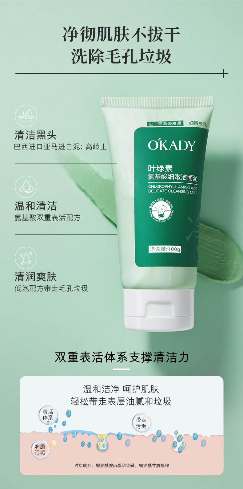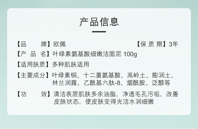 欧佩叶绿素氨基酸洁面泥深层清洁洁面乳洗面奶100g男女专用 欧佩叶绿素氨基酸细嫩洁面泥(新