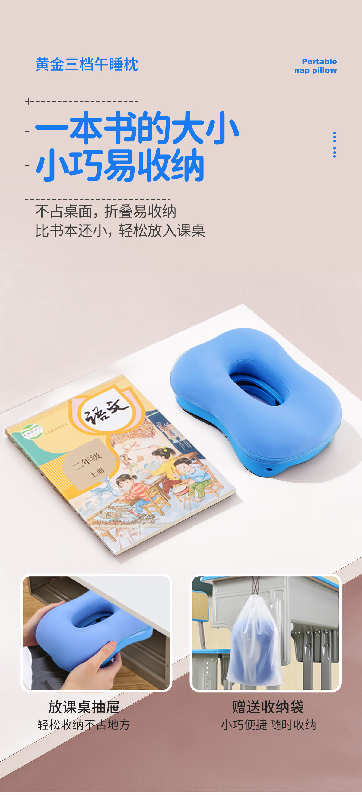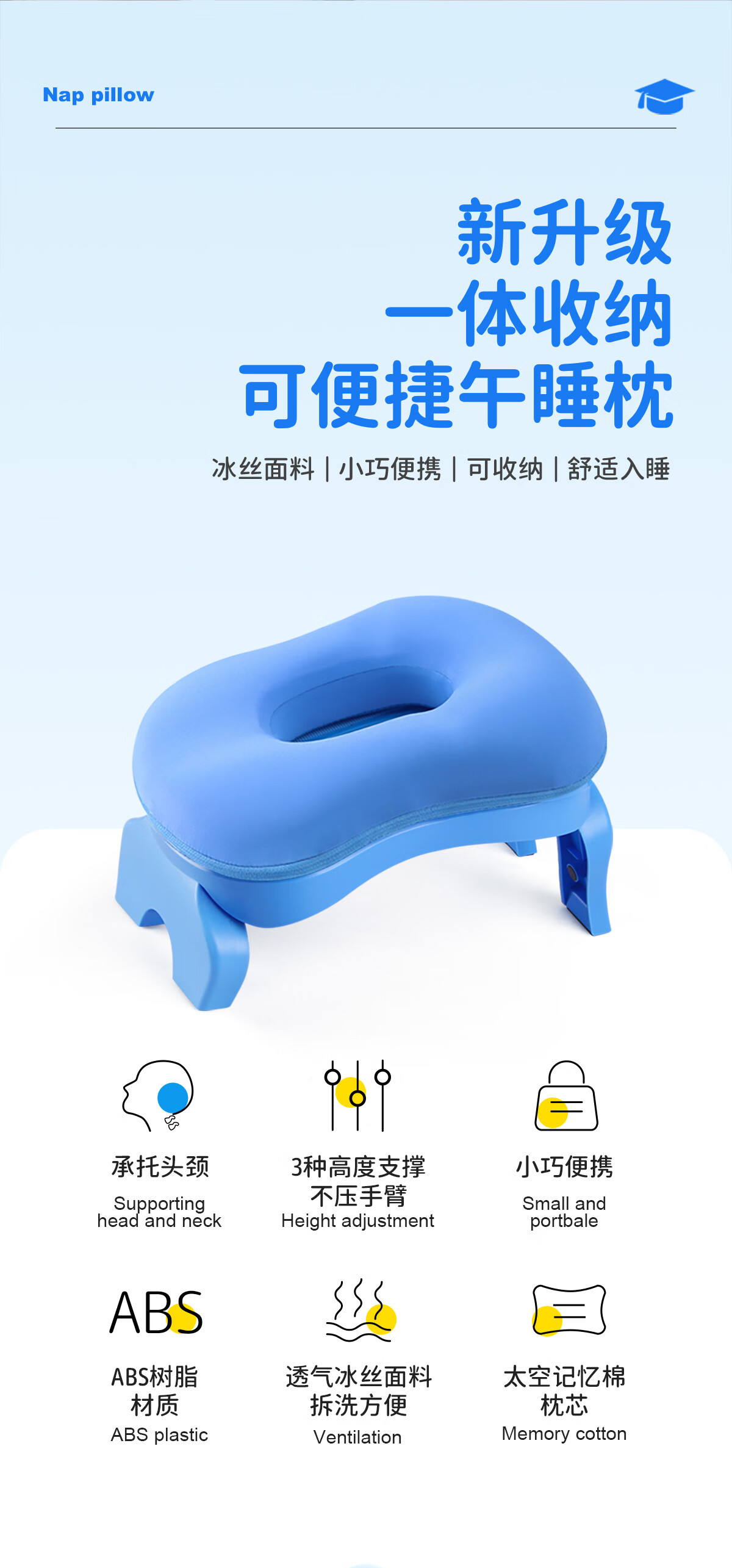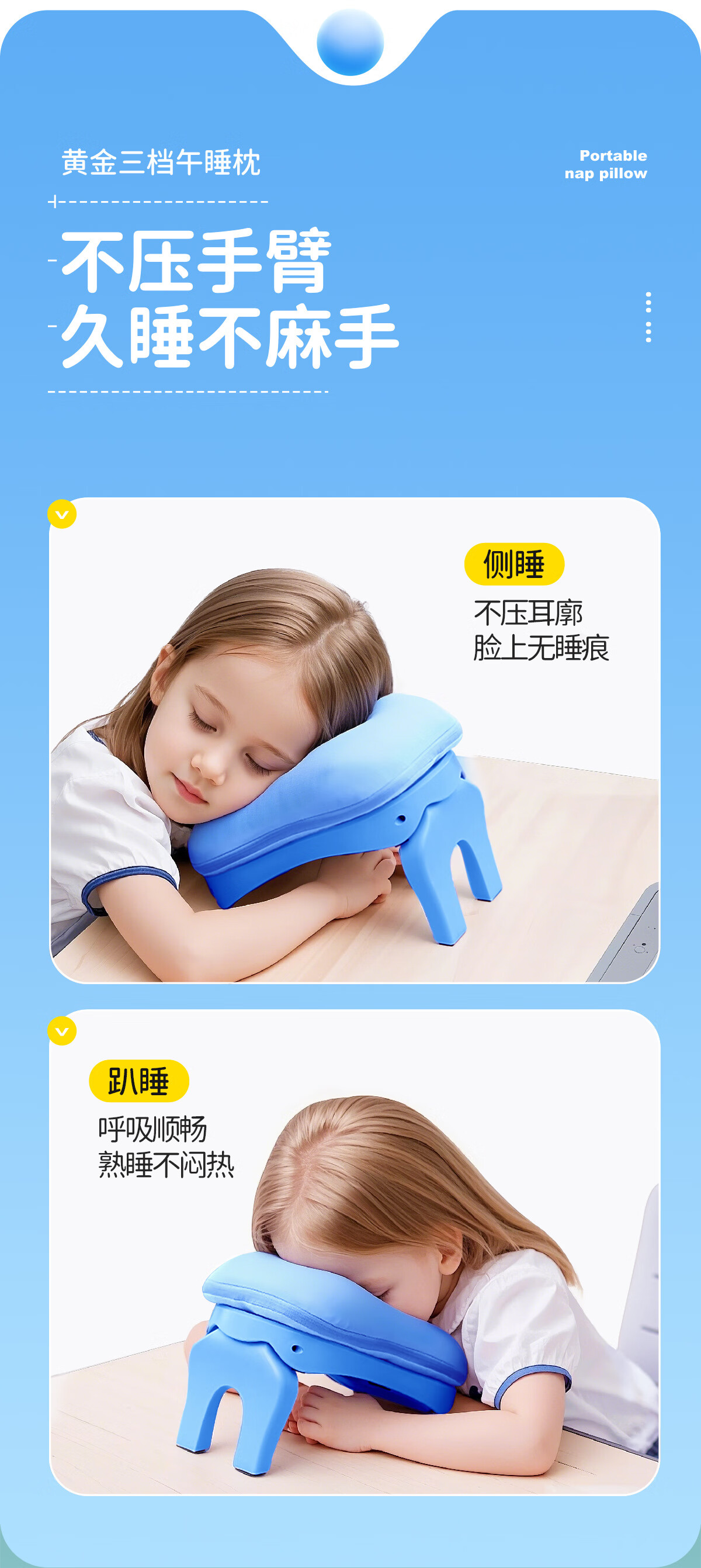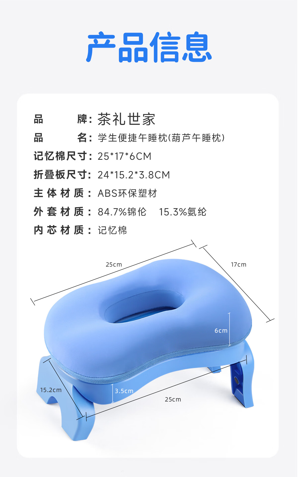 茶礼世家午睡枕小学生趴睡枕头可折叠便携抱枕儿童教室课桌上睡觉趴趴枕 天空蓝【冰丝枕套】送收纳袋 25cm*17cm 含枕芯 升级竹炭款
