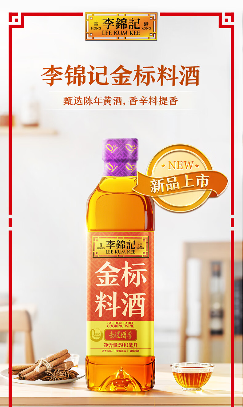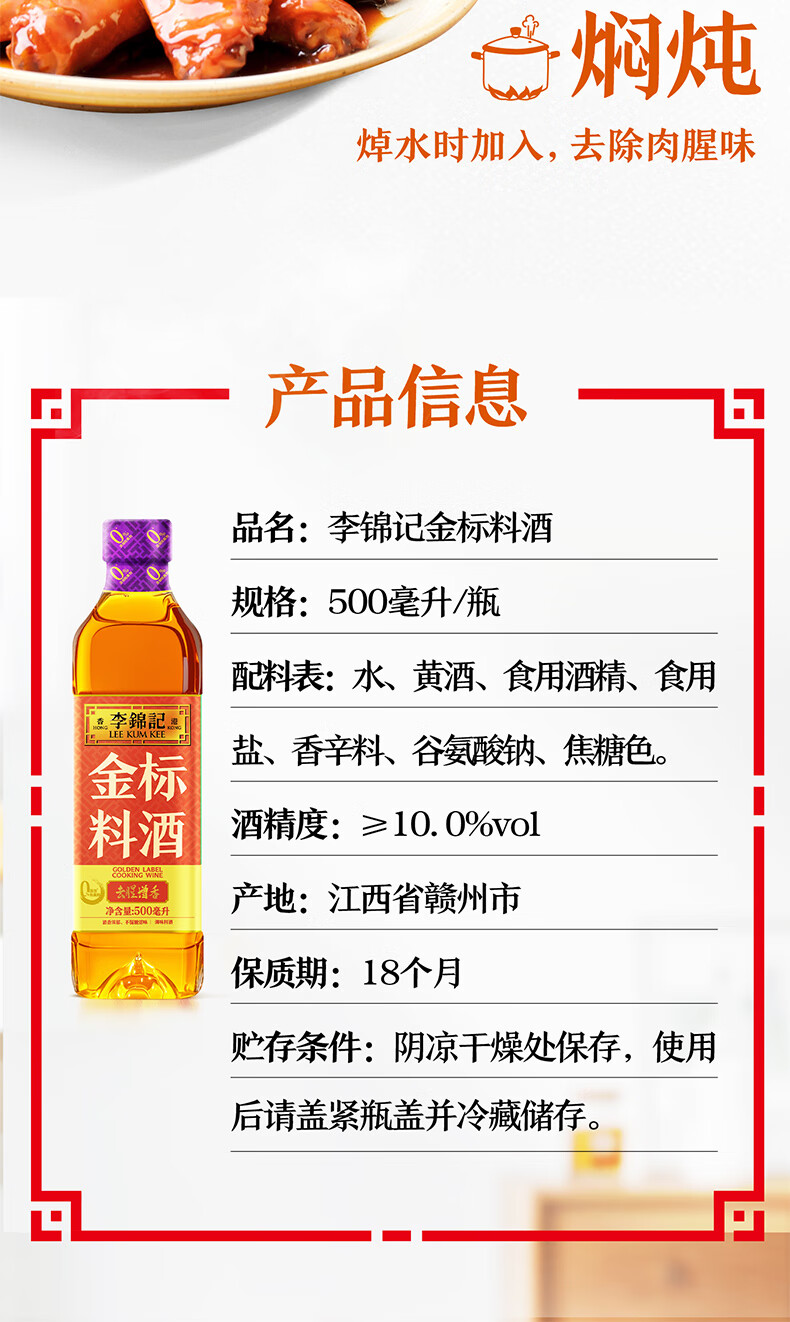 李锦记 金标料酒500ml 酒香浓郁 去腥增香 多种香辛料 焖炖小炒蒸煮调味