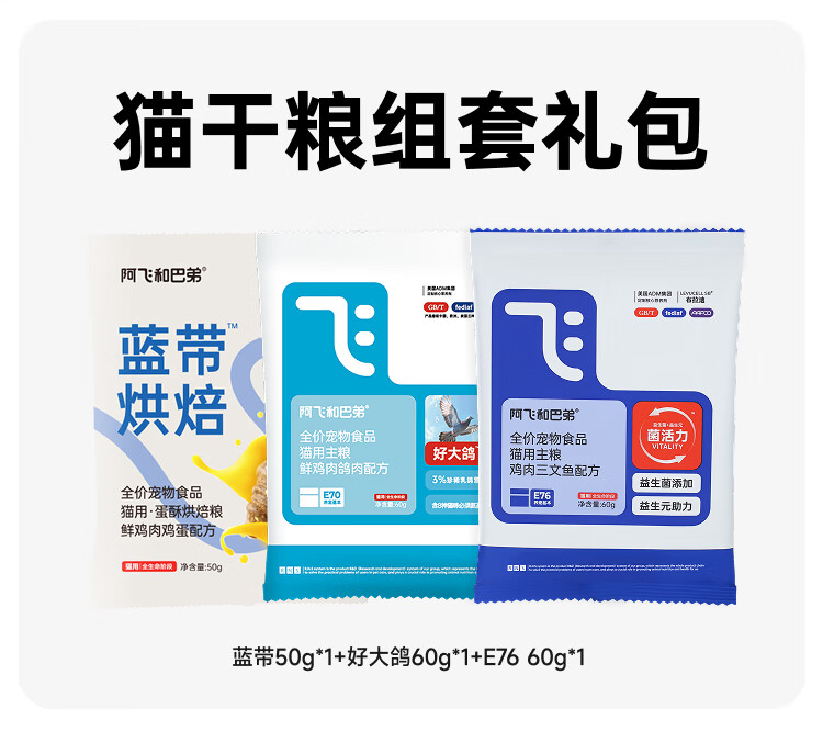 阿飞和巴弟猫干粮蓝带烘焙猫粮50g+乳鸽猫粮60g+E76 60g尝鲜礼包