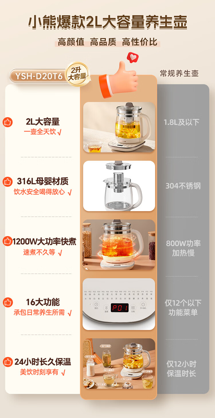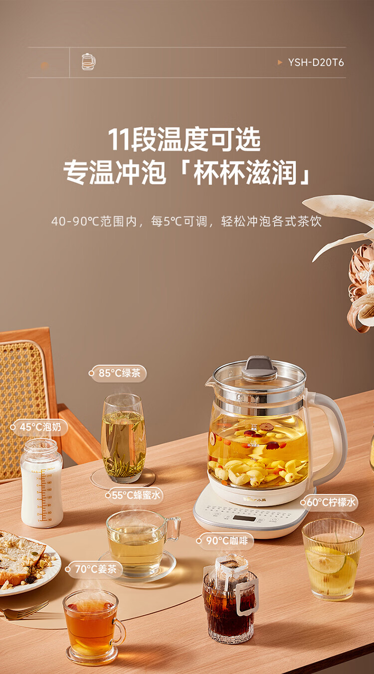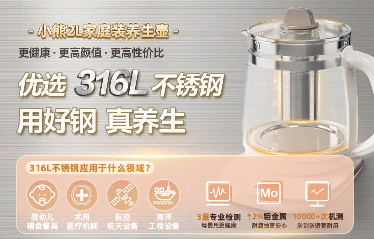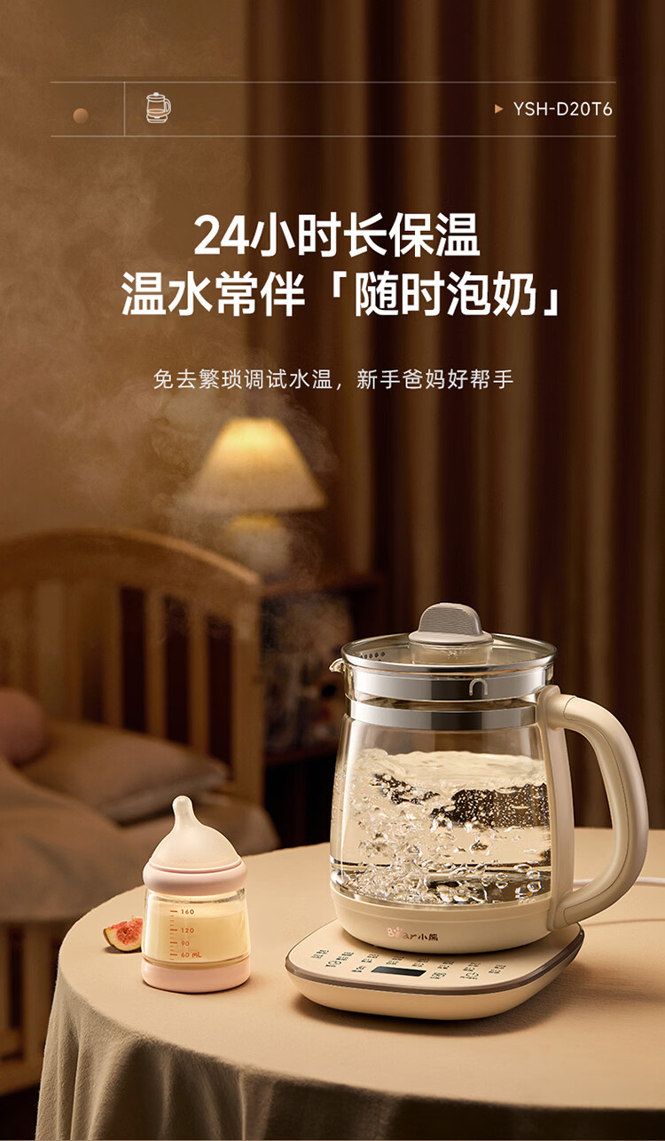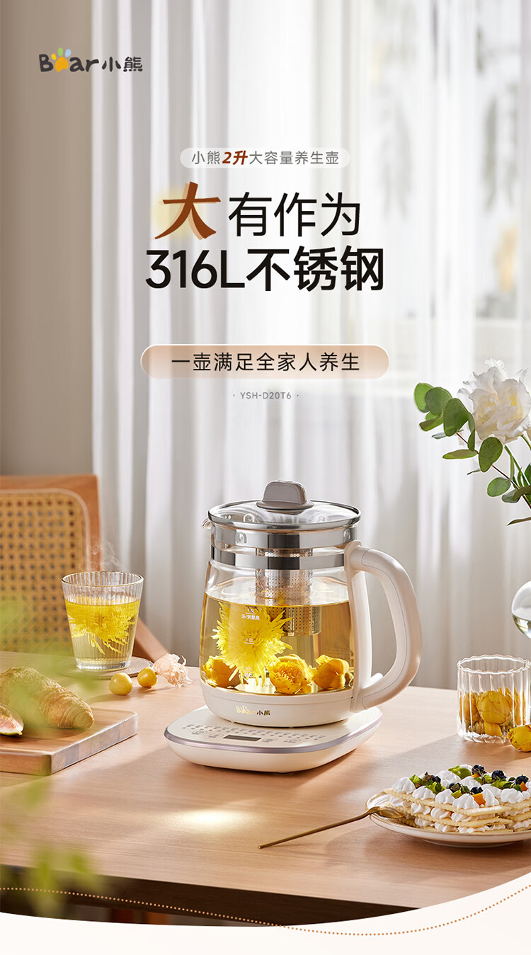 小熊(Bear)养生壶 2L大容量煮茶壶煮茶器 24H恒温花茶壶 炖煮一体烧水壶电热水壶 316L母婴材质 YSH-D20T6