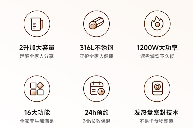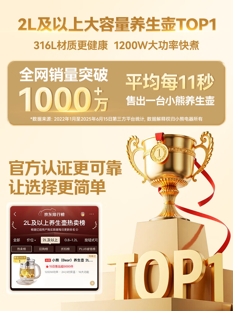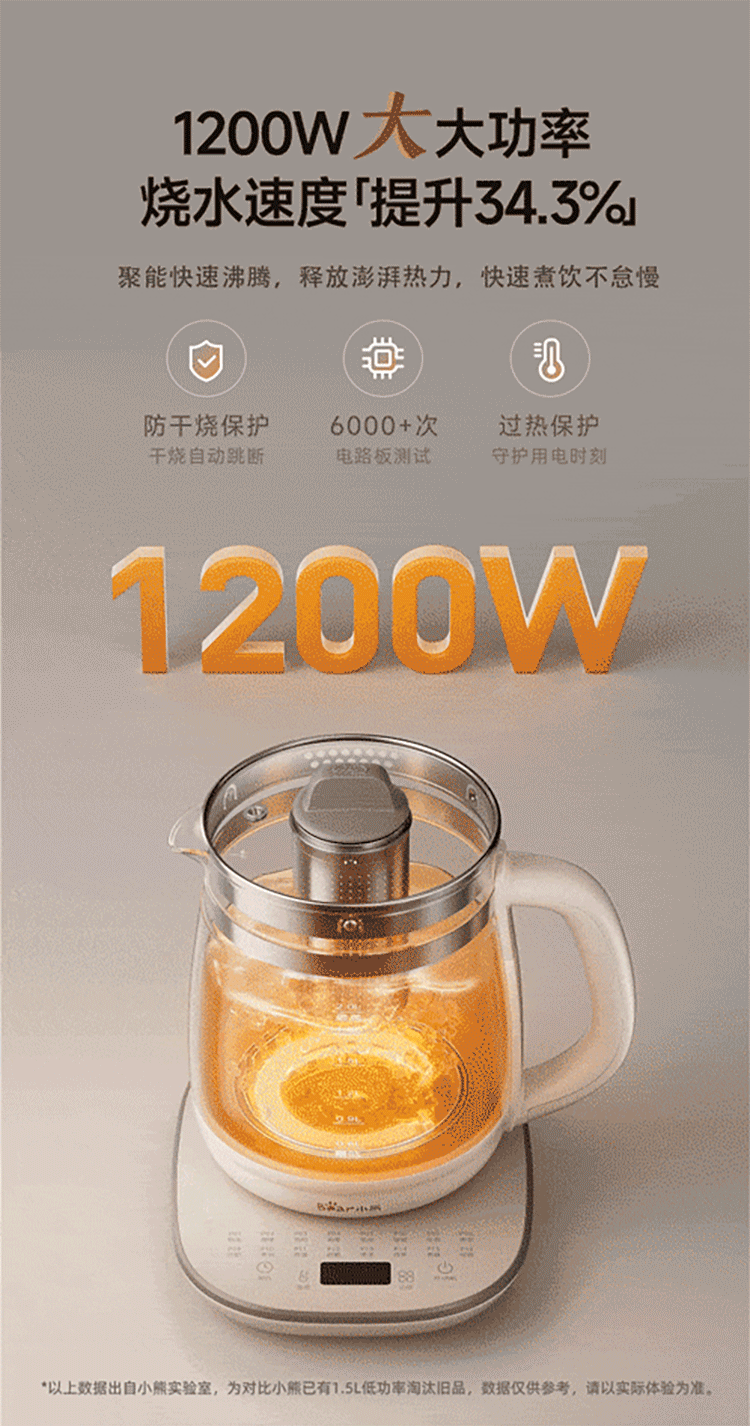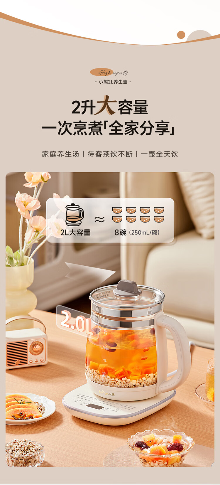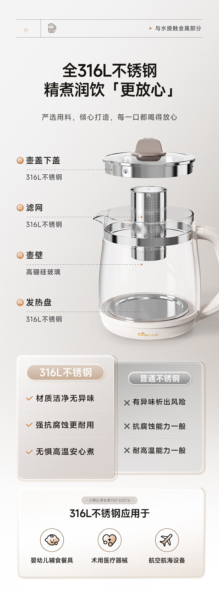小熊(Bear)养生壶 2L大容量煮茶壶煮茶器 24H恒温花茶壶 炖煮一体烧水壶电热水壶 316L母婴材质 YSH-D20T6