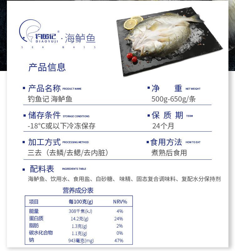 钓鱼记开背海鲈鱼1斤-1.3斤 三去 冷冻 生鲜 鱼类 年货送礼 家庭聚餐