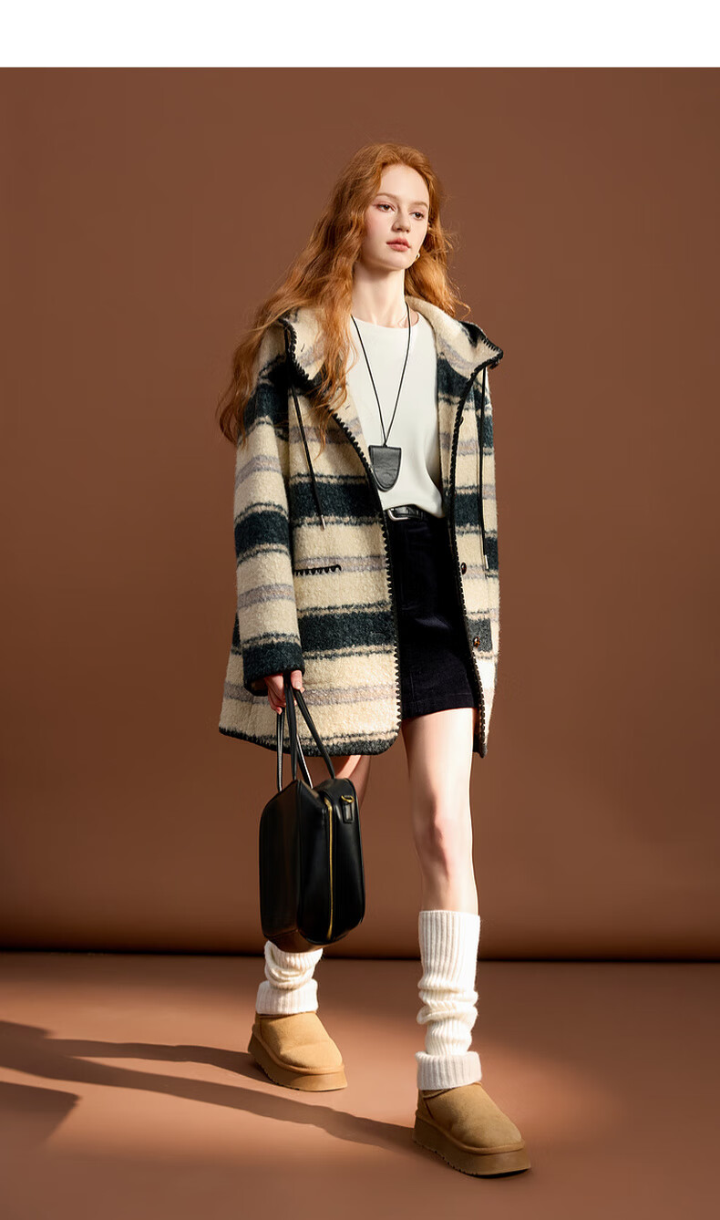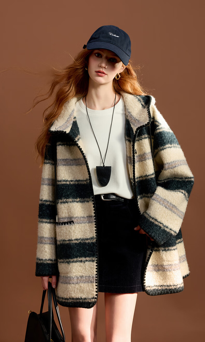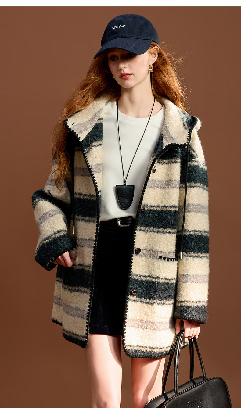 三彩2025冬季新款连帽条纹大衣毛呢外套中长宽松休闲复古M
