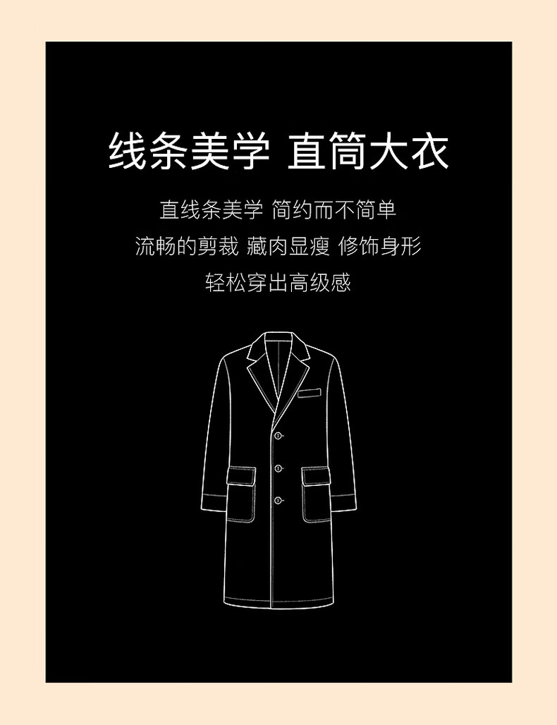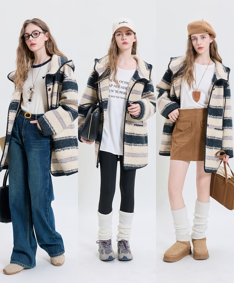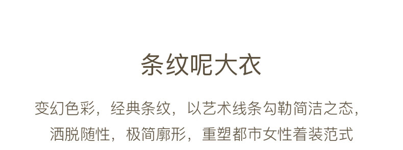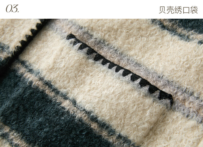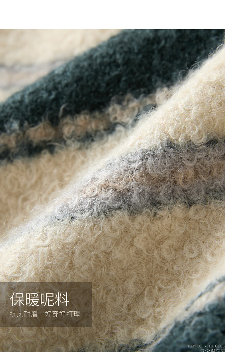 三彩2025冬季新款连帽条纹大衣毛呢外套中长宽松休闲复古M
