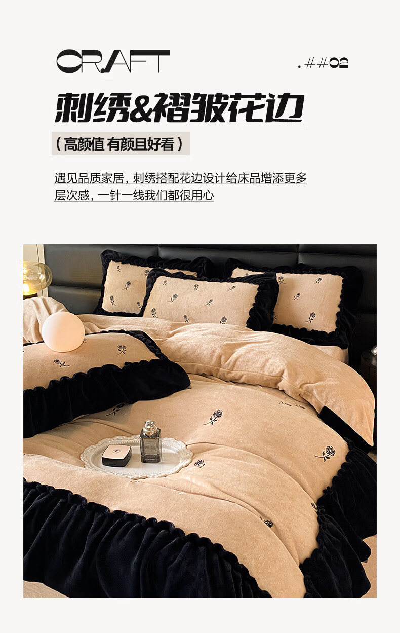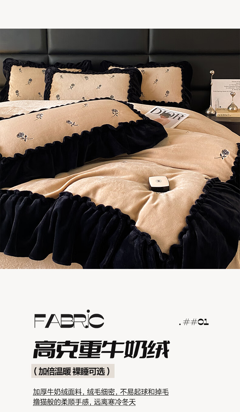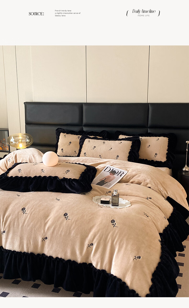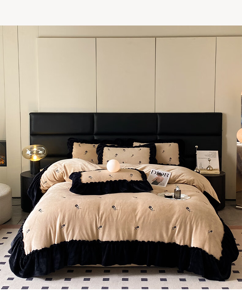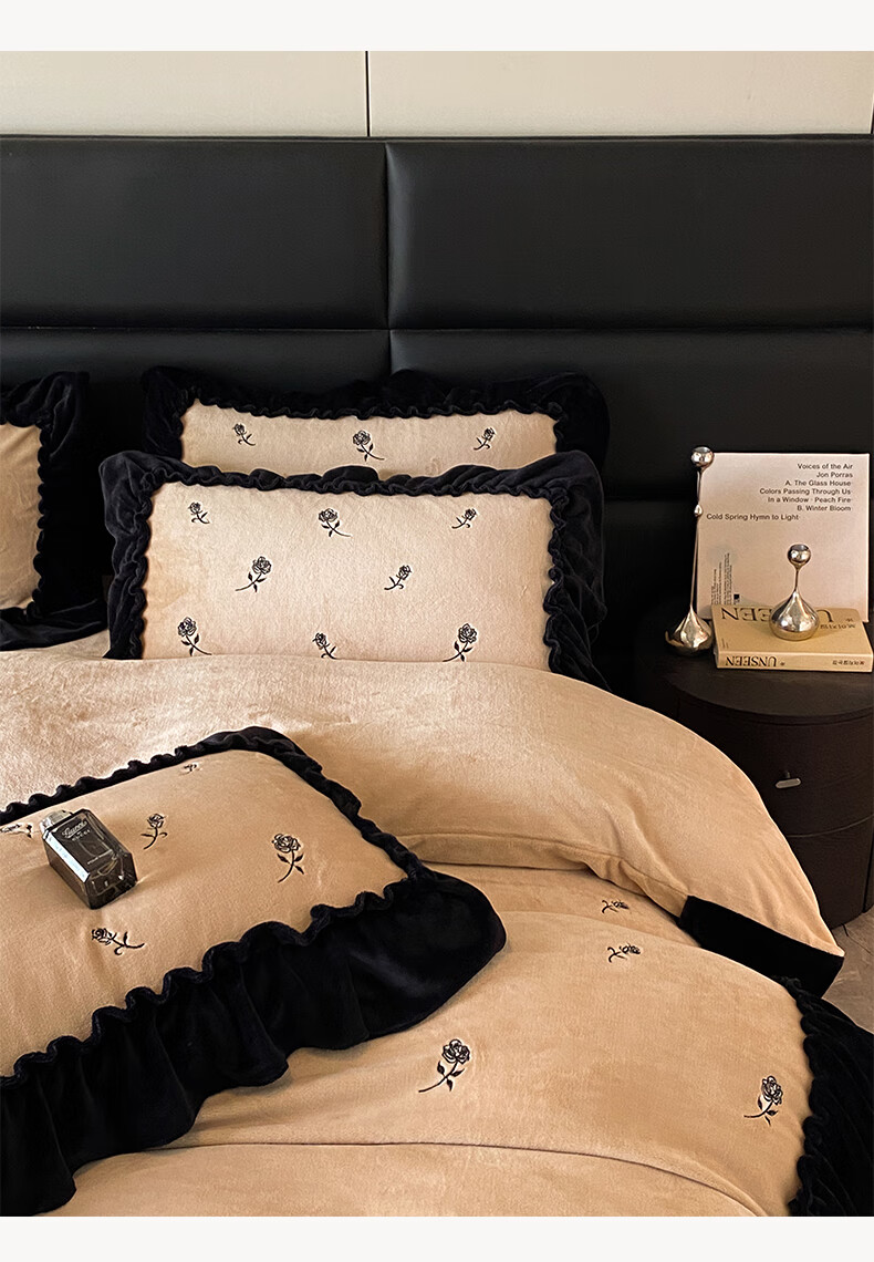 VJE花边款秋冬季法式牛奶绒四件套公主风高级感珊瑚绒被套床单三件套 花韵-香槟 三件套1.2m 床单款 (被套150*200cm)