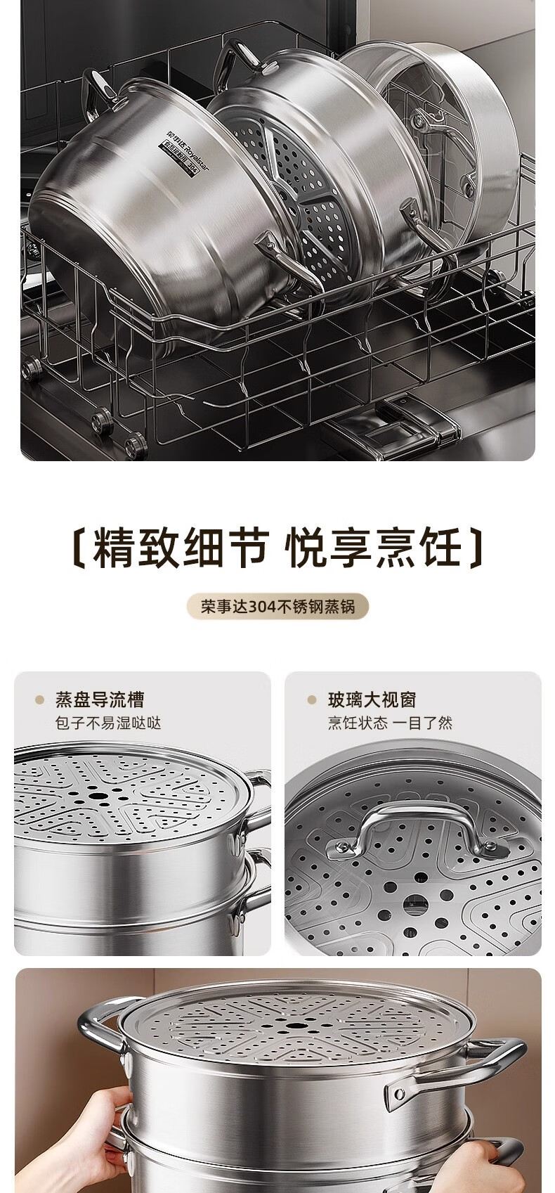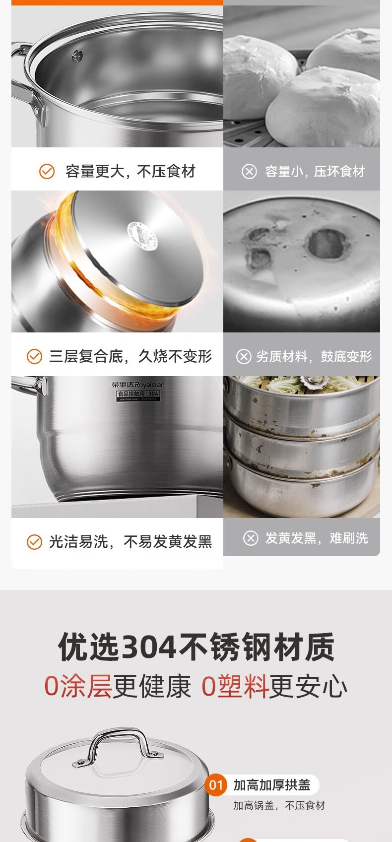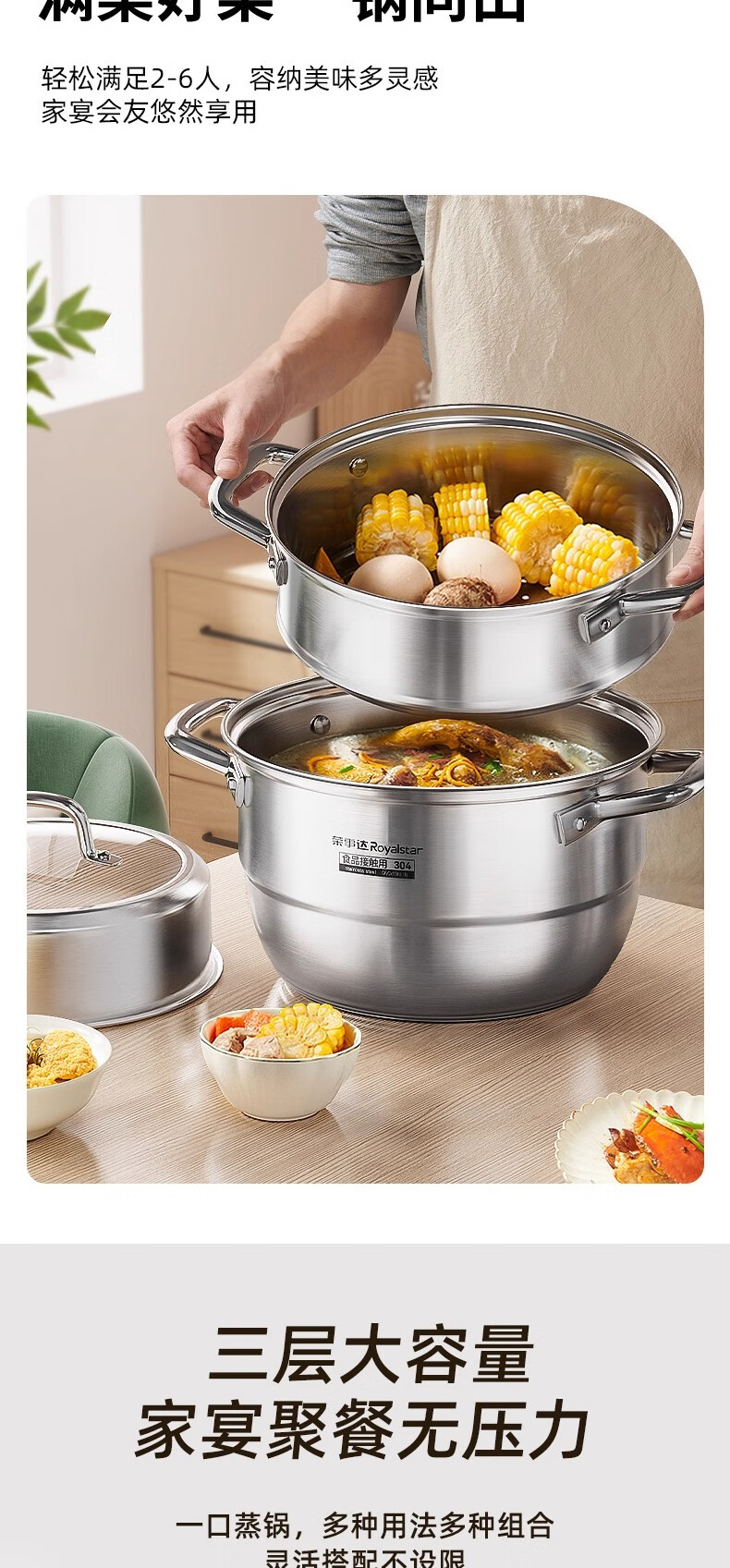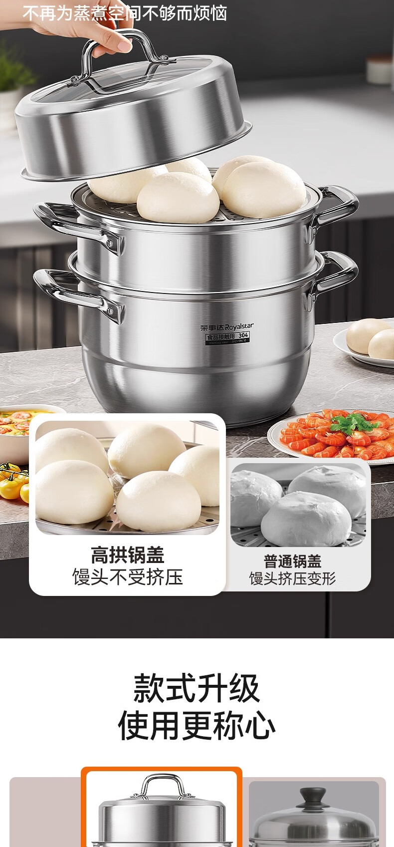 荣事达蒸锅家用304不锈钢三层加厚蒸笼蒸鱼馒头电磁炉燃气炉汤锅 【304不锈钢锅】 三层 高拱盖加高 28cm