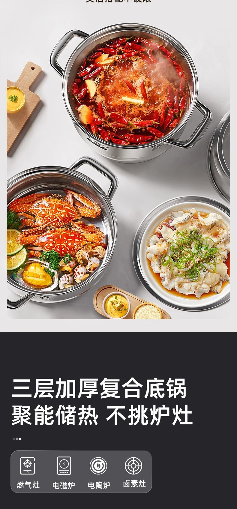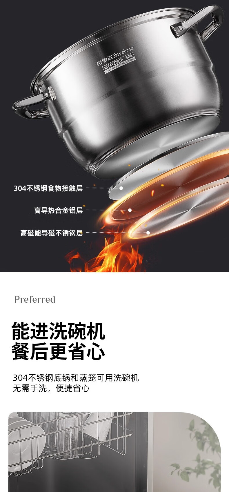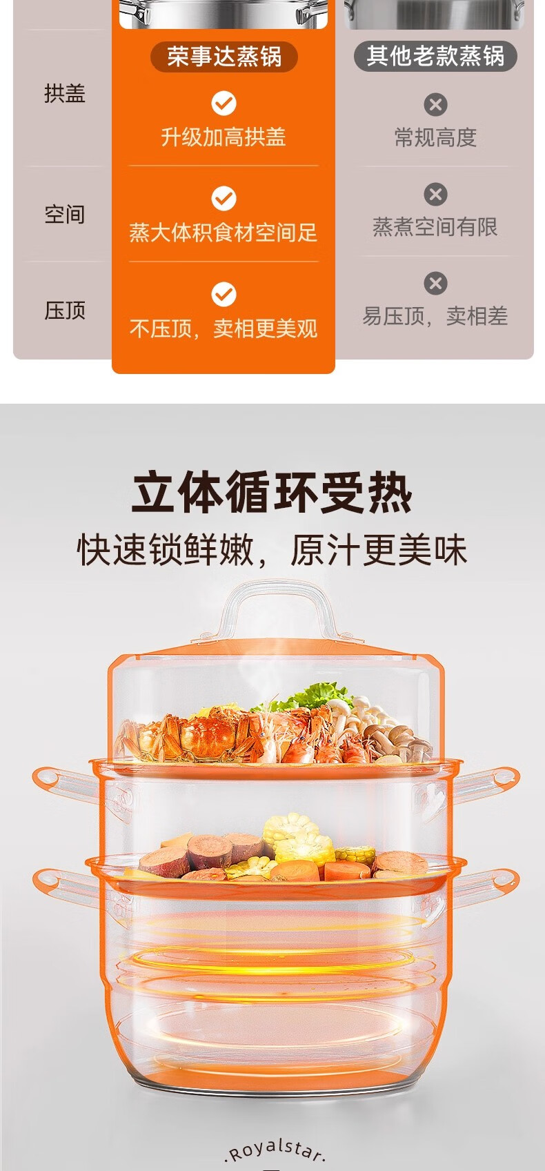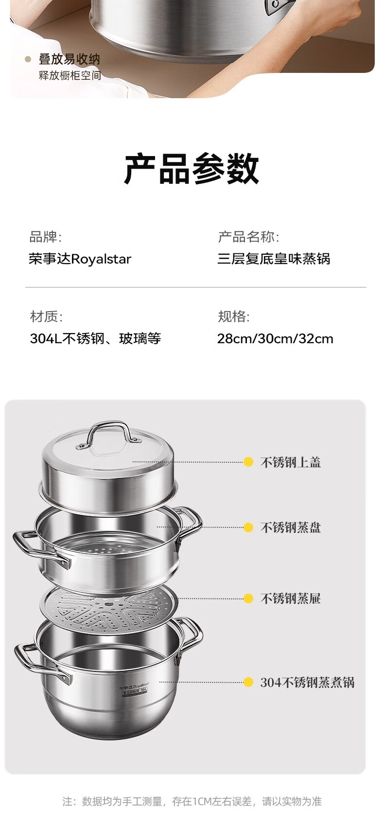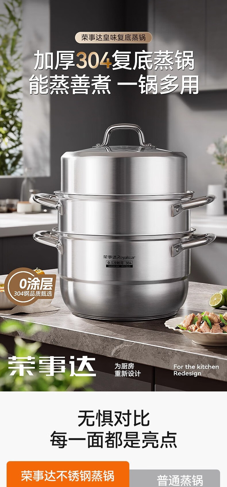 荣事达蒸锅家用304不锈钢三层加厚蒸笼蒸鱼馒头电磁炉燃气炉汤锅 【304不锈钢锅】 三层 高拱盖加高 28cm