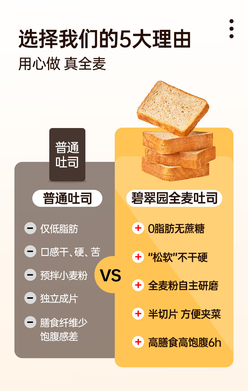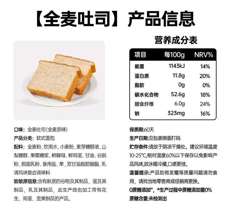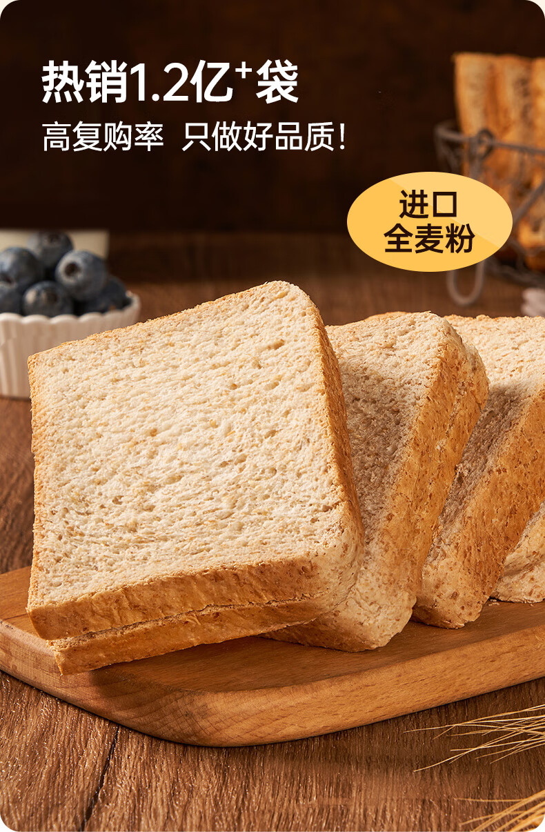 碧翠园全麦面包0脂肪无蔗糖粗粮吐司早餐面包代餐健身休闲零食1000g/箱