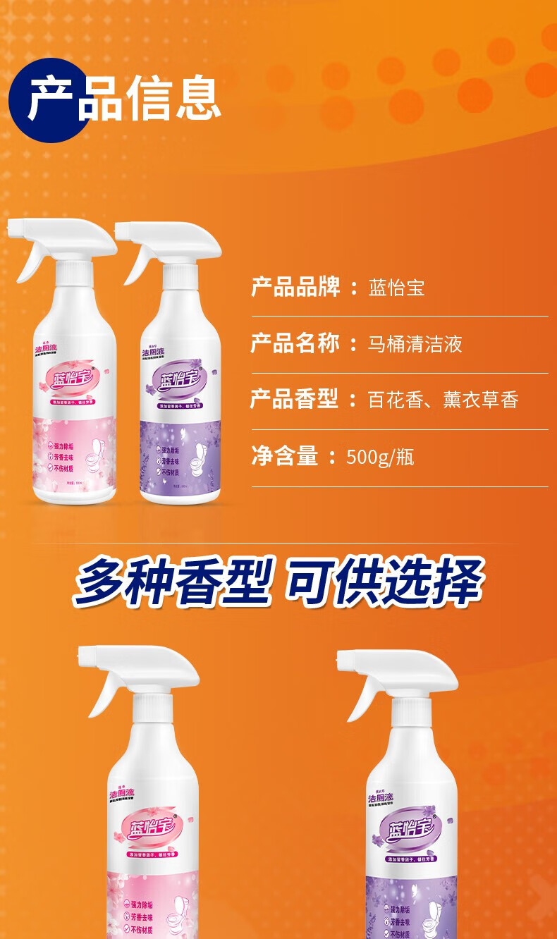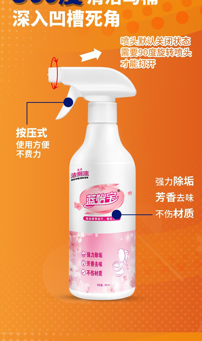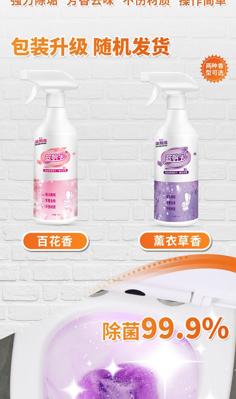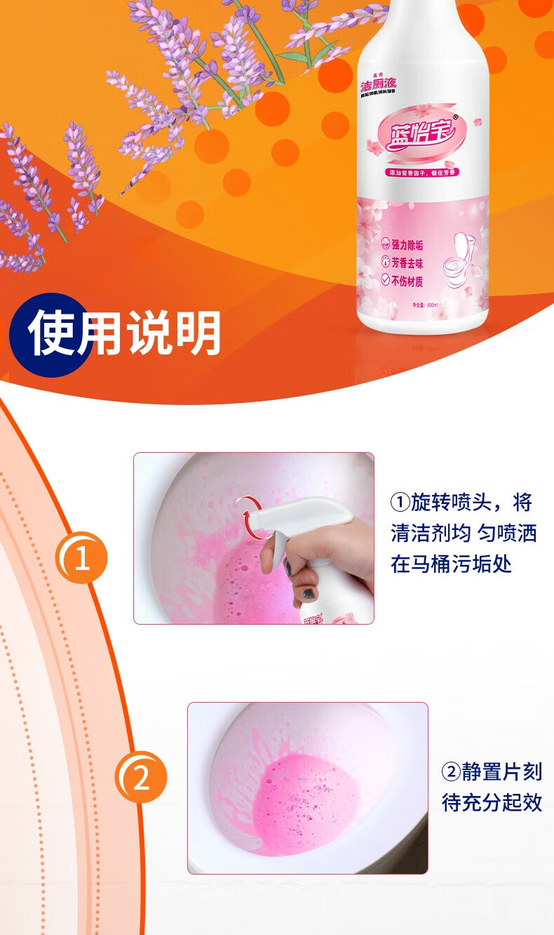 蓝怡宝洁厕灵花香洁厕液家用卫生间马桶杀菌除垢清洁剂厕所瓷砖去污去臭 薰衣草洁厕液5瓶*500ml+2喷头