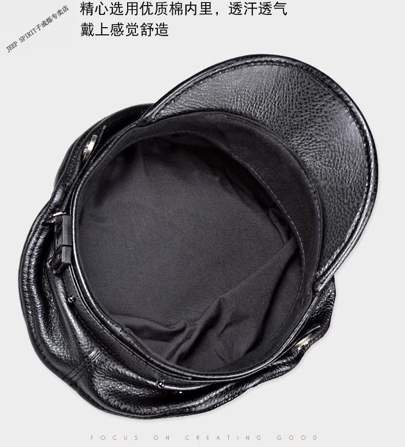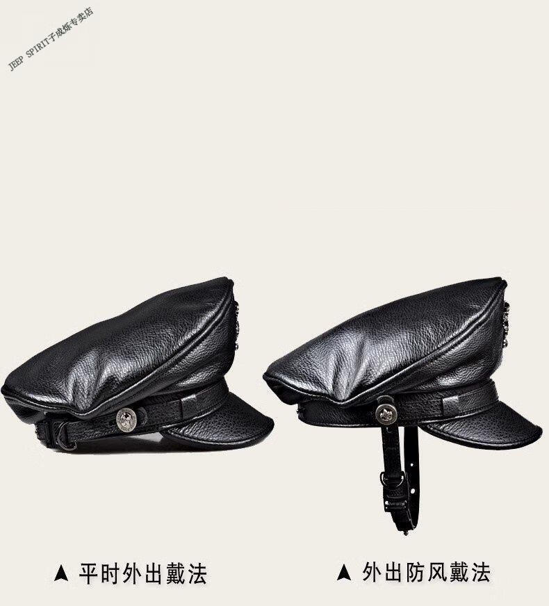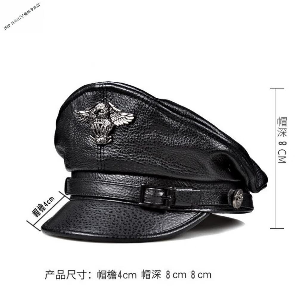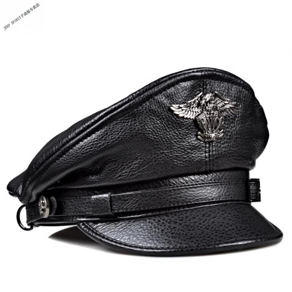 JEEP秋冬真皮帽子男士复古牛皮平顶帽英伦哈雷中青老年机车帽船长帽 黑色 M 55-56c