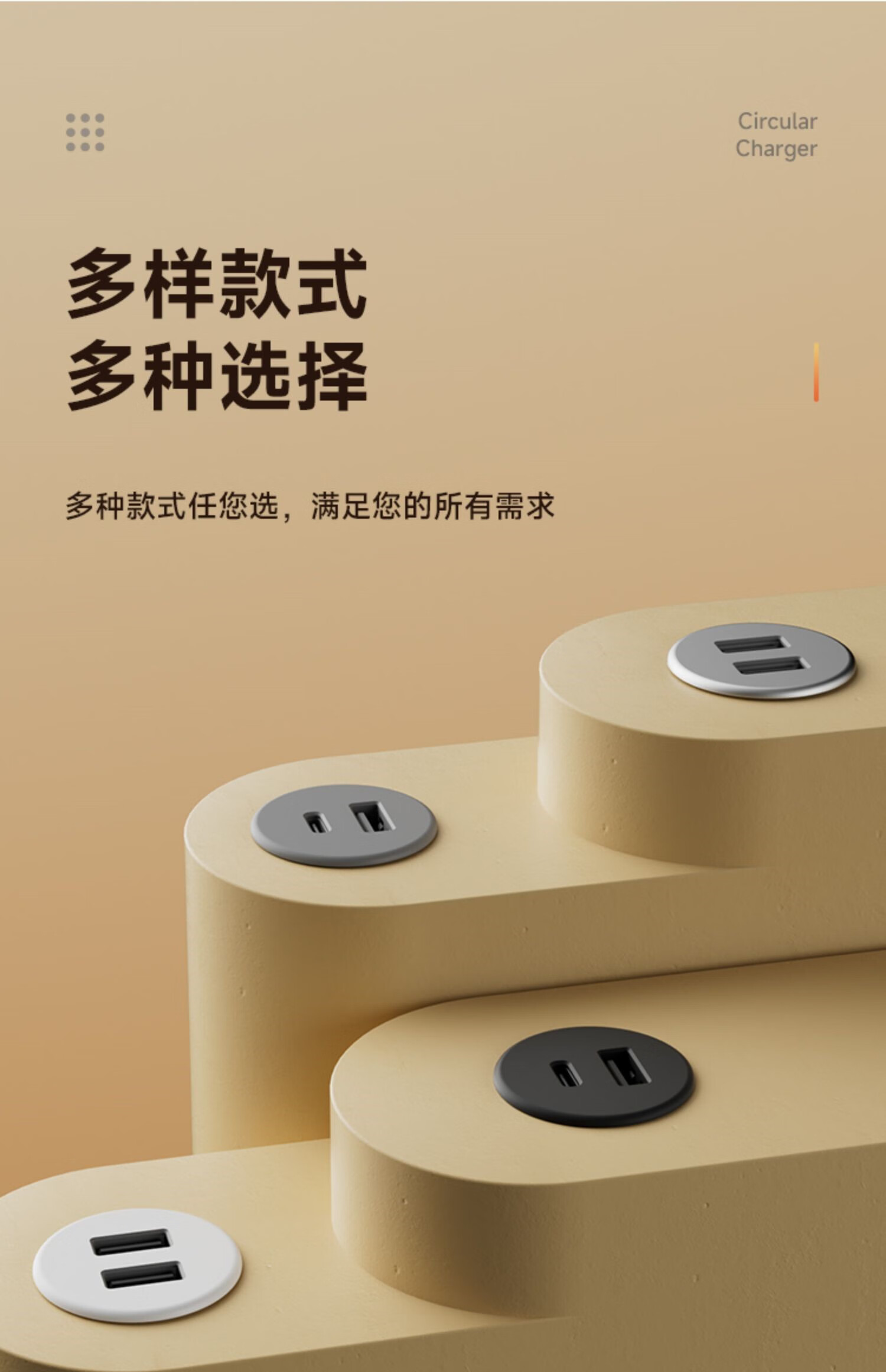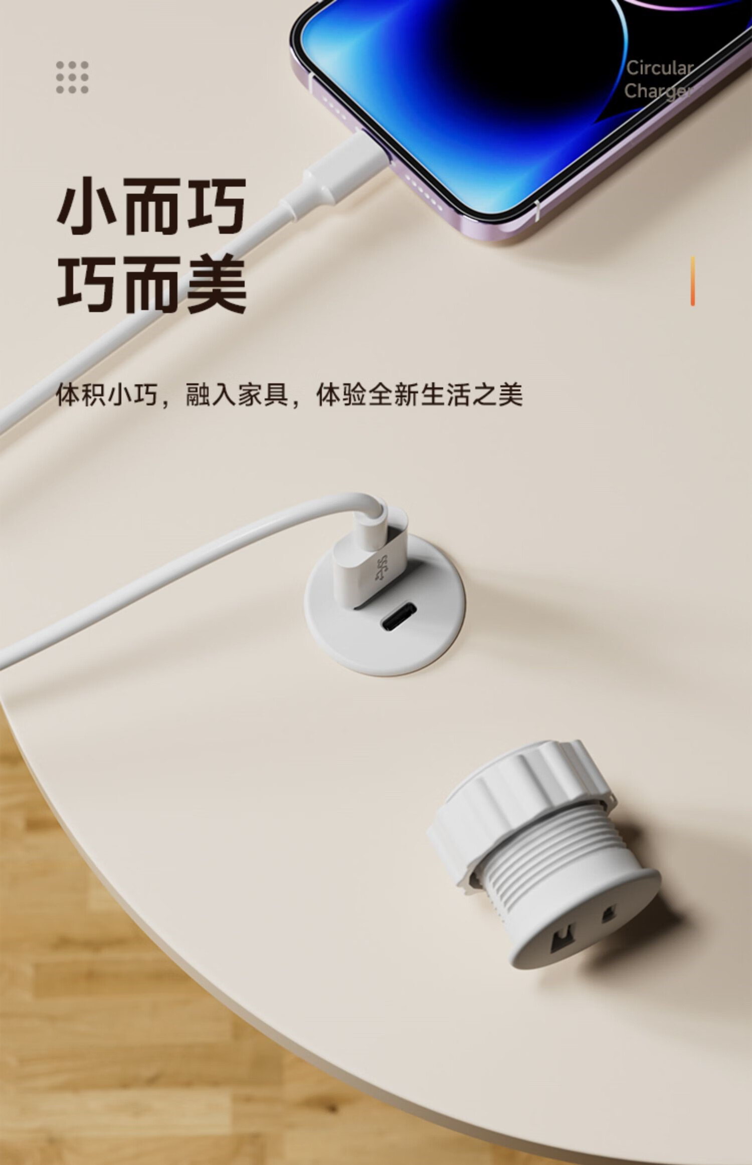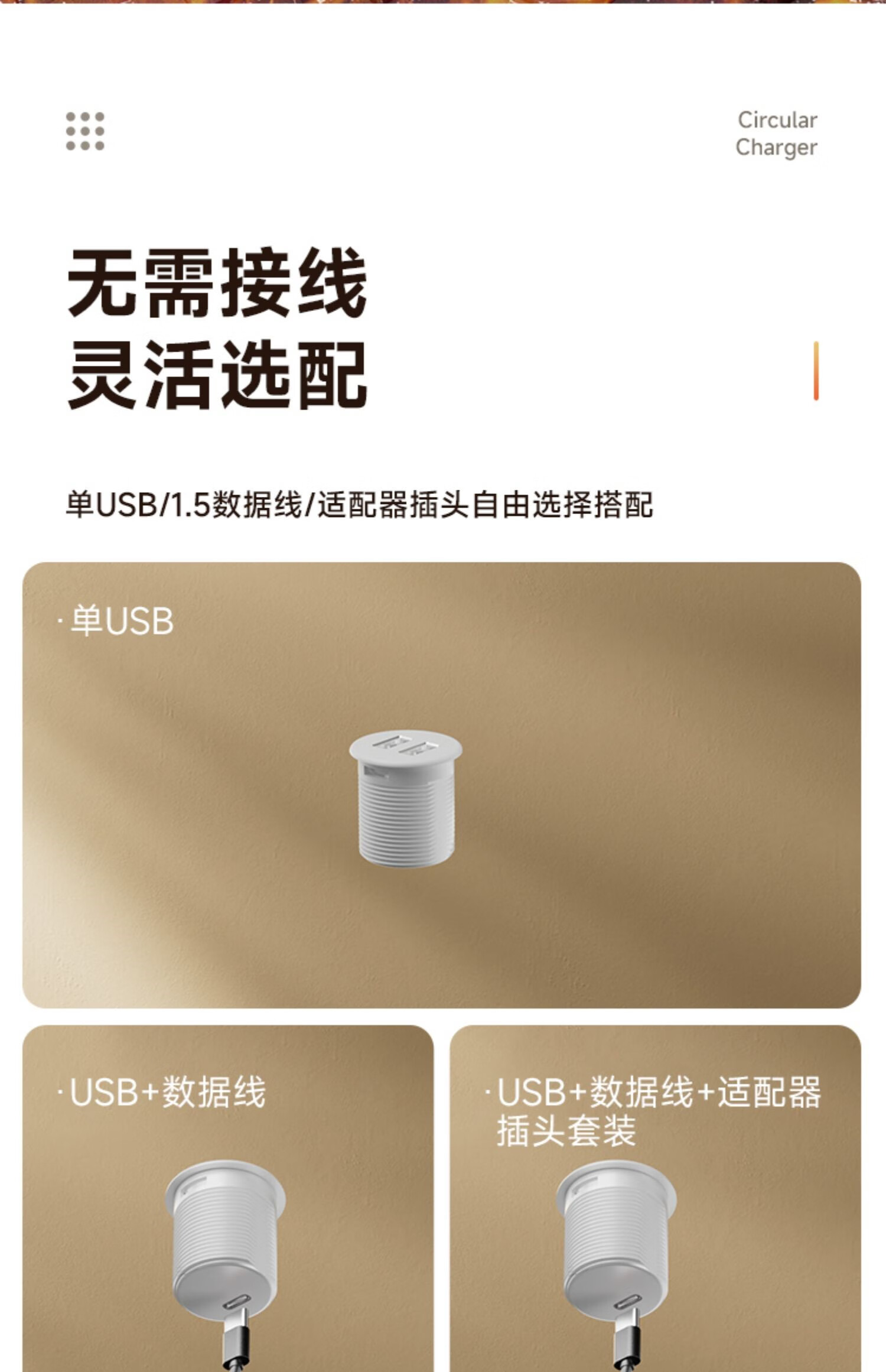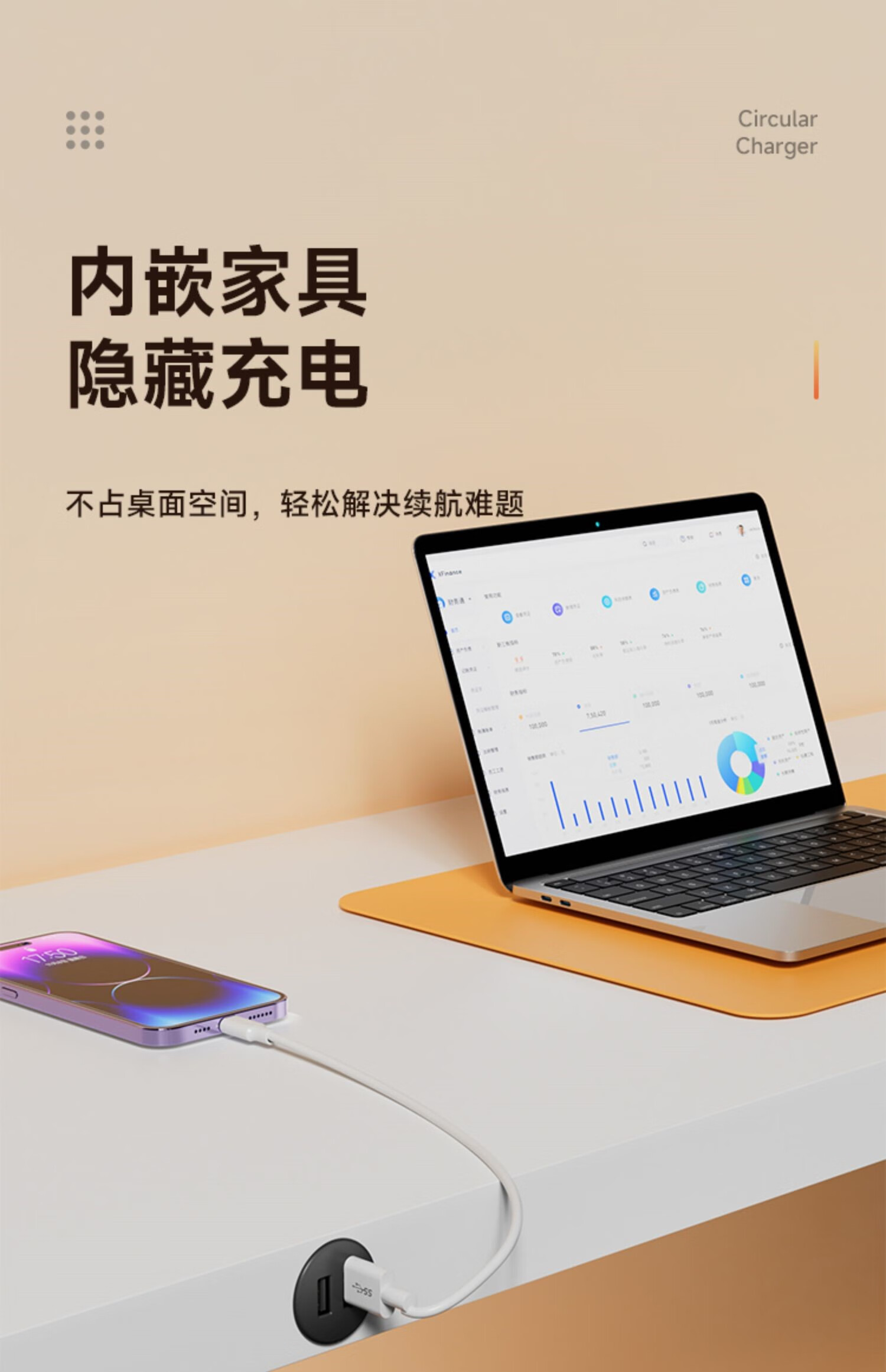 公牛王圆形嵌入式USB插座带TypeC口15W快充手机充电器家用沙发茶几办公 15W快充黑色套装1A1C+1.5米线+ 1